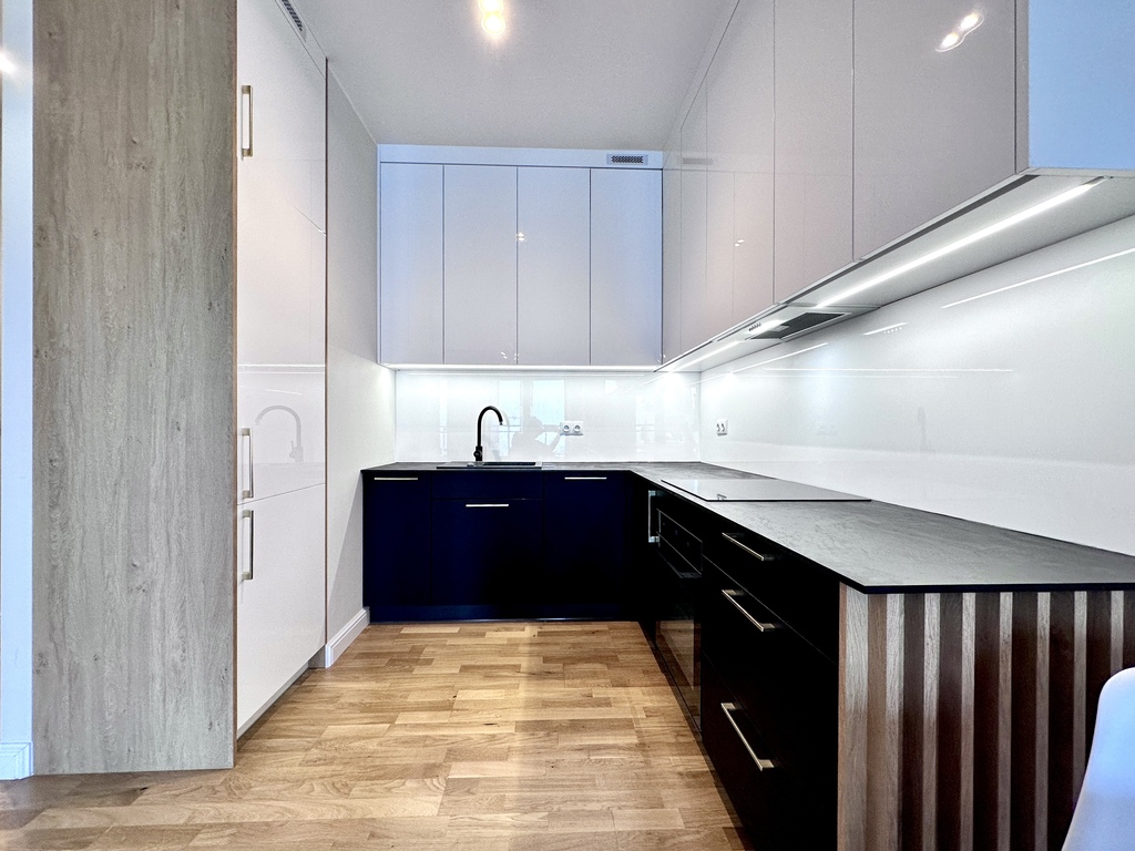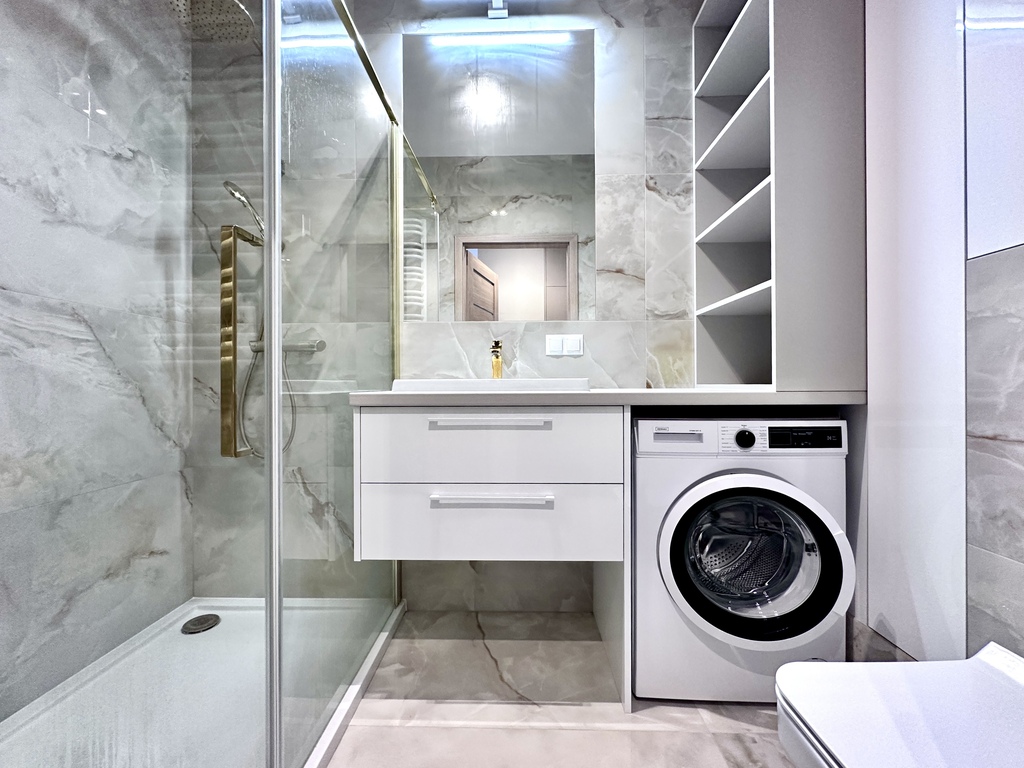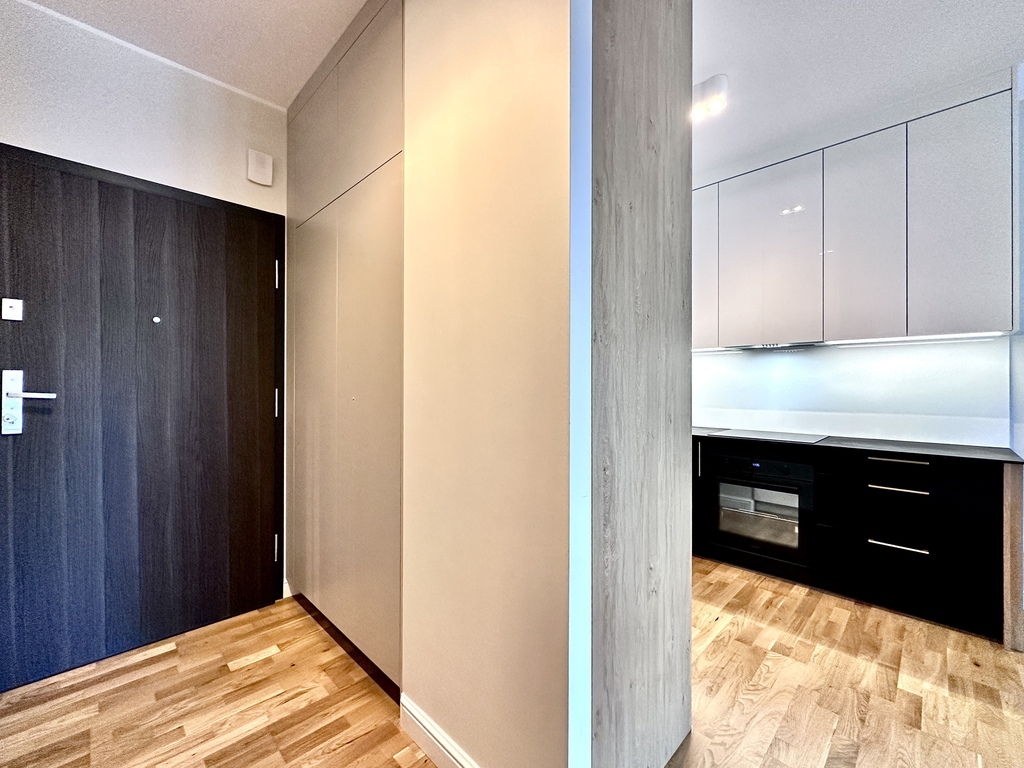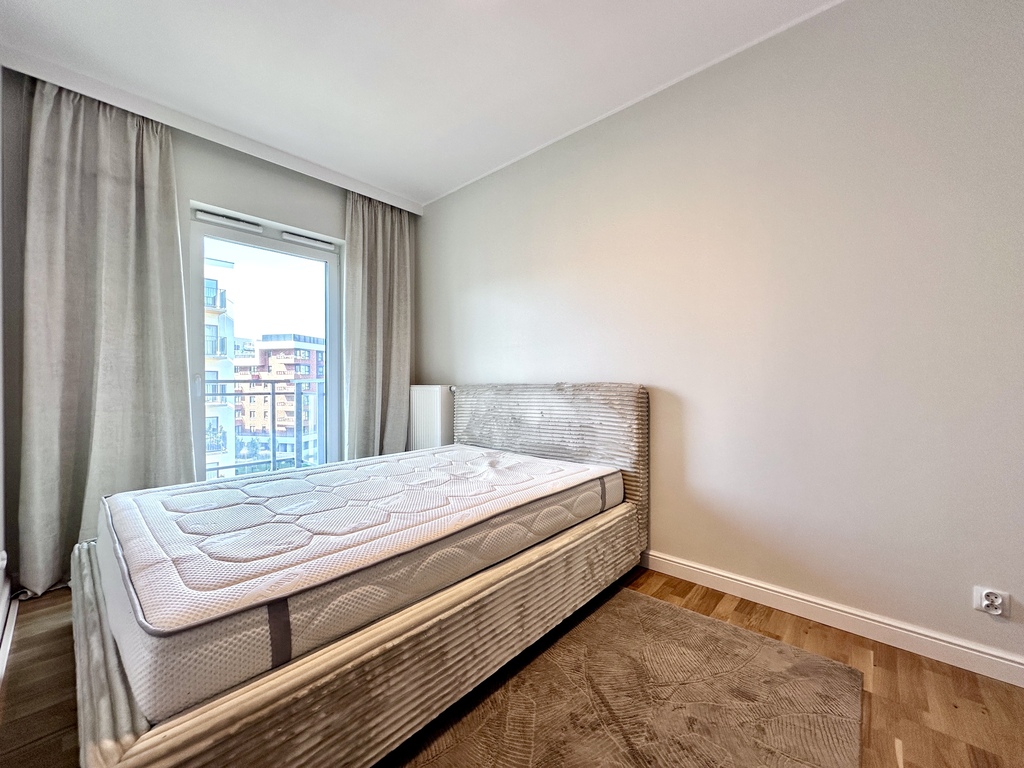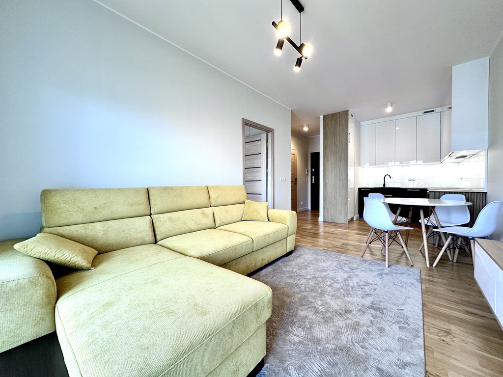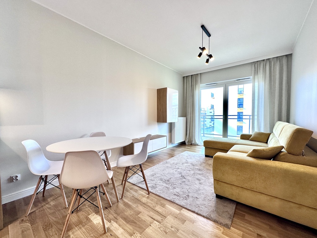 Do dyspozycji najemcy nowoczesna kuchnia z meblami w zabudowie, wyposażona w najpotrzebniejszy sprzęt AGD (lodówka z zamrażarką, płyta grzewcza, piekarnik, zmywarka). W części dziennej wygodna sofa z funkcją spania oraz szafka RTV oraz stół z krzesłami. Z salonu wyjście na balkon z widokiem na centralną część osiedla oraz park. W sypialni pojemna szafa w zabudowie oraz podwójne łózko z materacem.. Łazienka z prysznicem. W przedpokoju pojemna szafa w zabudowie. Całość wykończona z materiałów wysokiej jakości i dbałością o szczegóły. Nieruchomość spełnia wymagania najbardziej wymagających najemców.