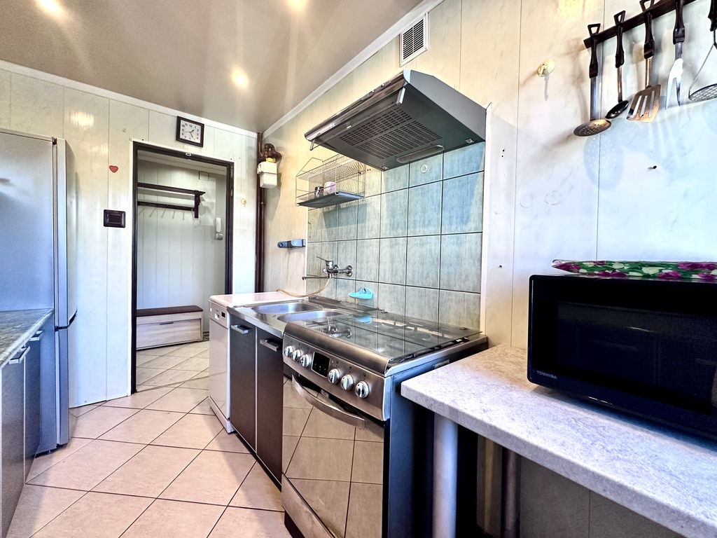 Jasna kuchnia z meblami w zabudowie wyposażona w najpotrzebniejszy sprzęt AGD (kuchenka z piekarnikiem, lodówka, zmywarka).