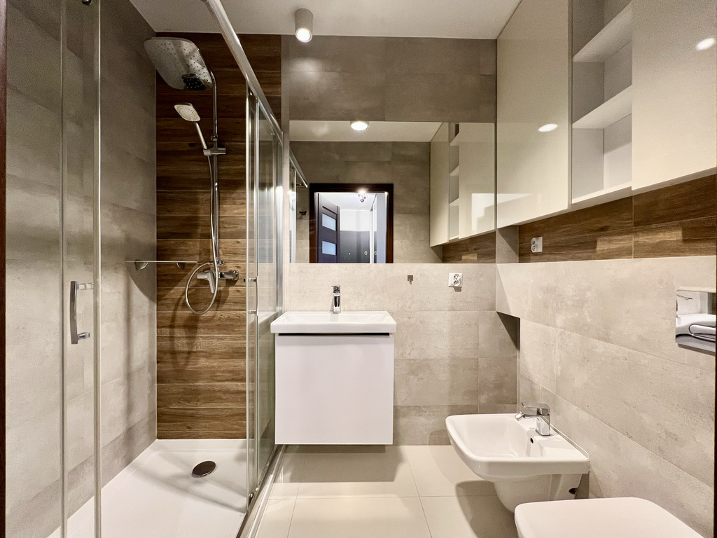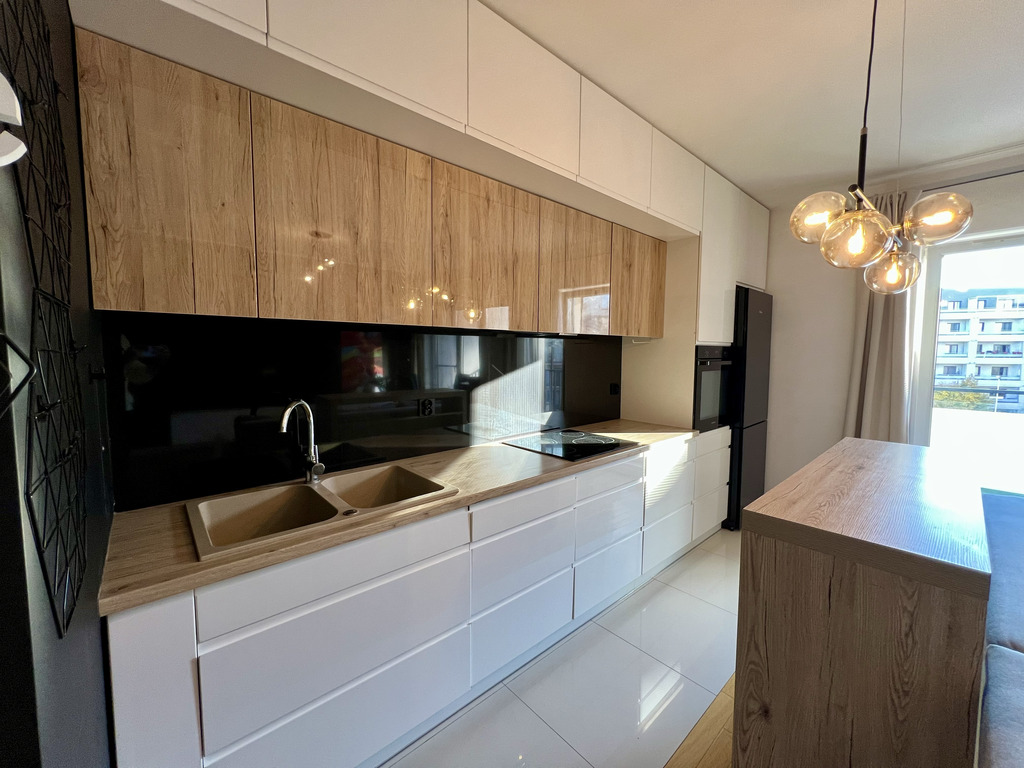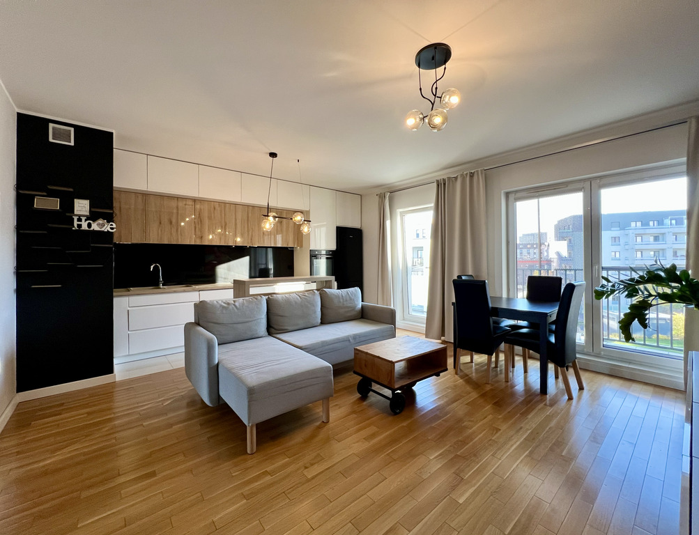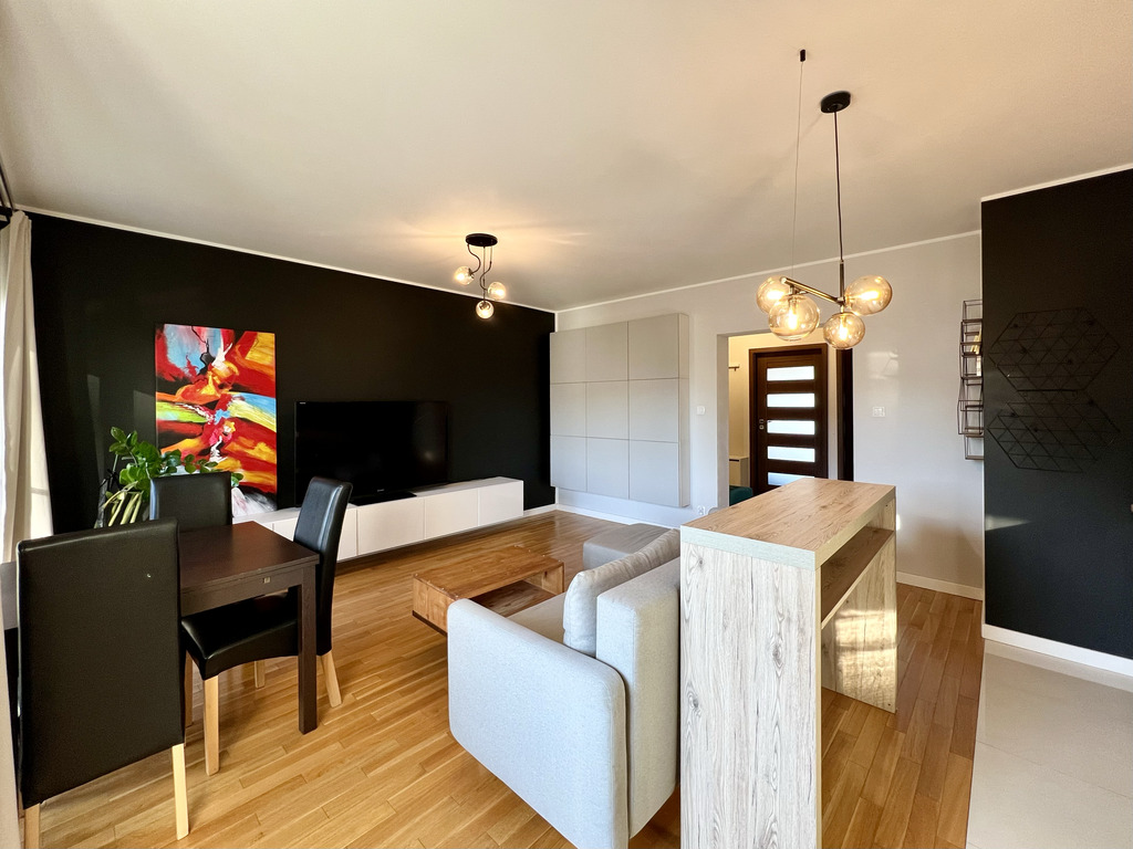 Mieszkanie urządzone w spójnym, nowoczesnym stylu z dbałością o każdy detal. Aneks kuchenny wykonany na wymiar, wyposażony w sprzęt AGD. Drewniane podłogi, jasne wnętrza i funkcjonalny układ pomieszczeń zapewniają wysoki komfort codziennego życia.