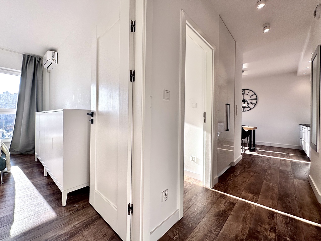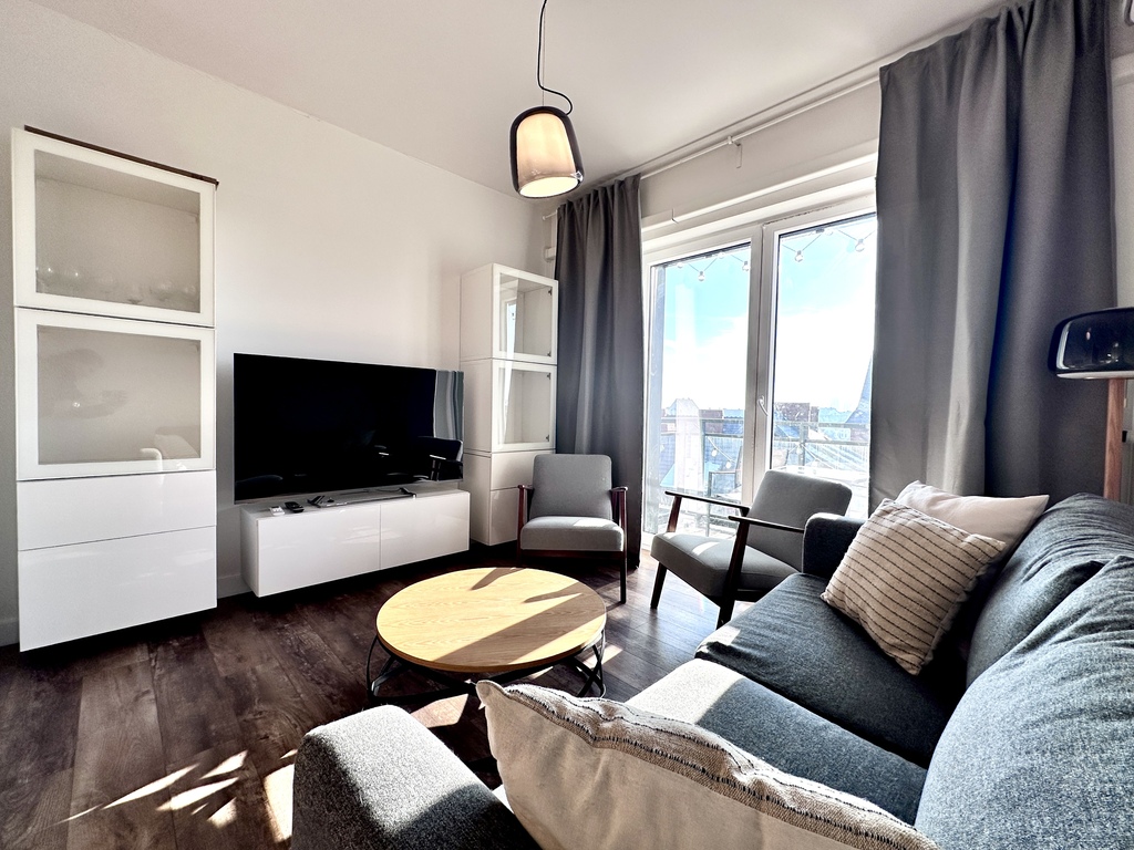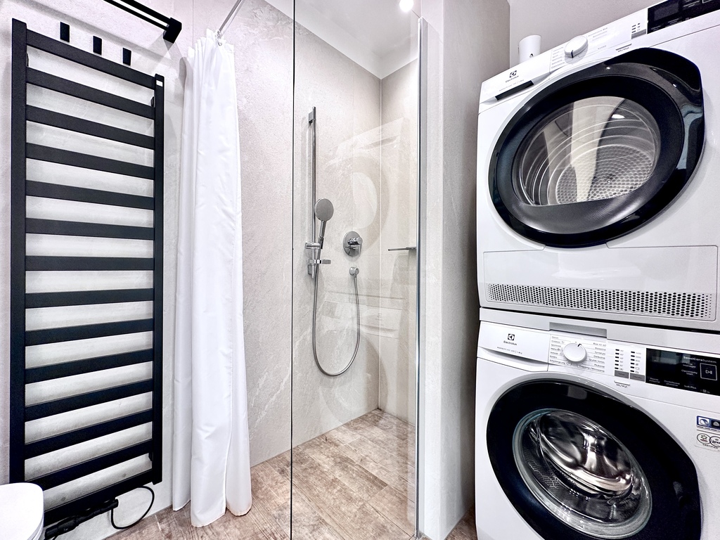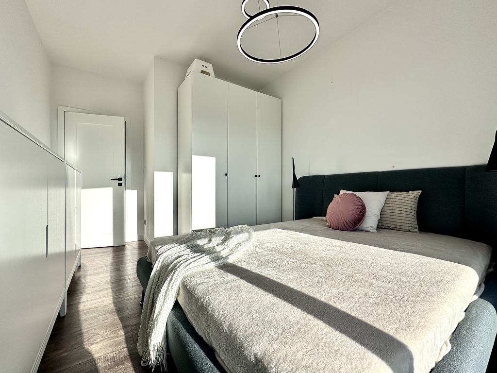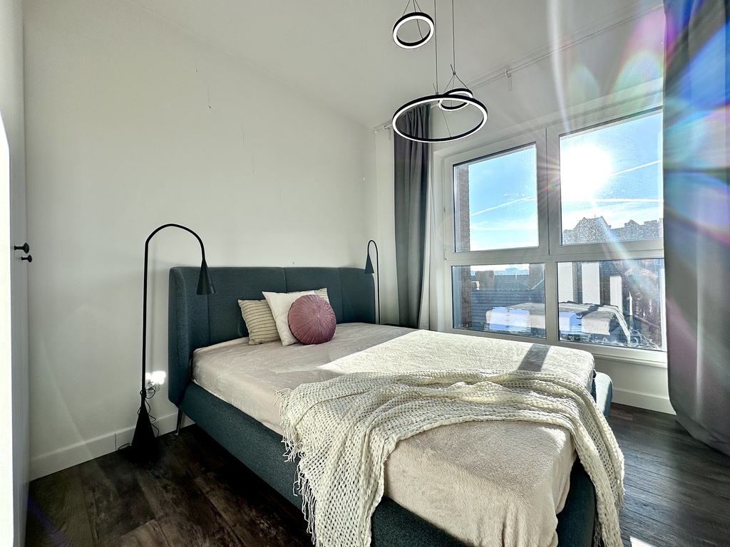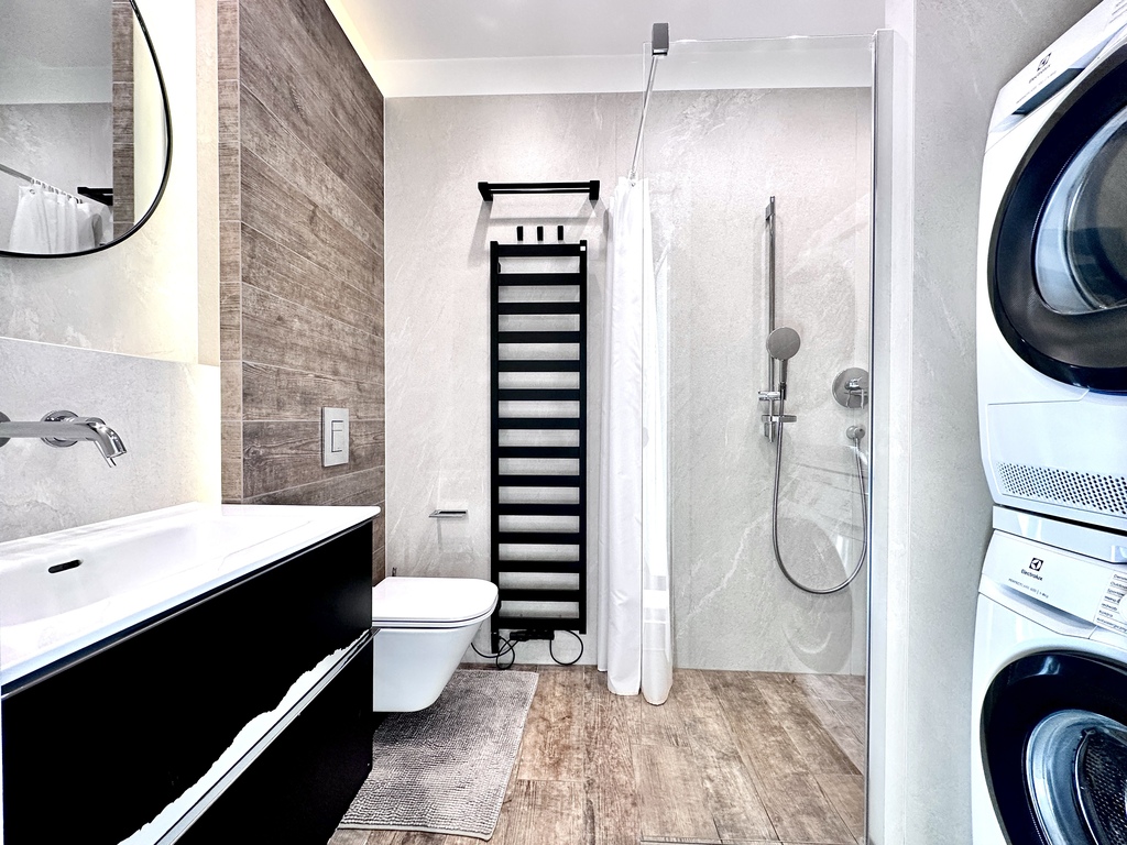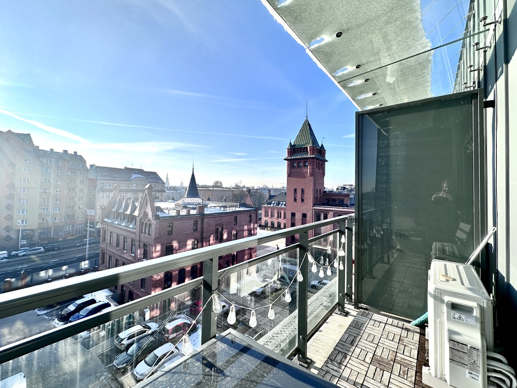 Z salonu wyjście na balkon z widokiem na panoramę miasta. Łazienka wykończona z materiałów najwyższej jakości, wyposażona w pralkę oraz suszarkę automatyczną.