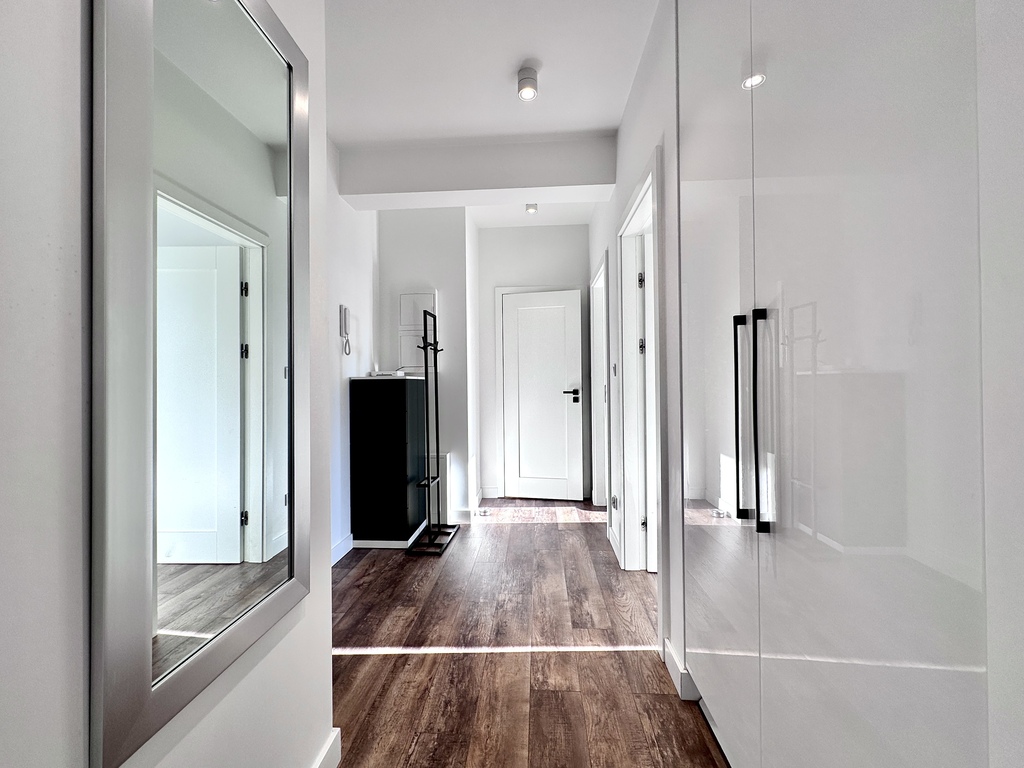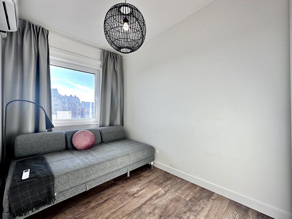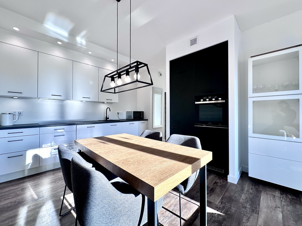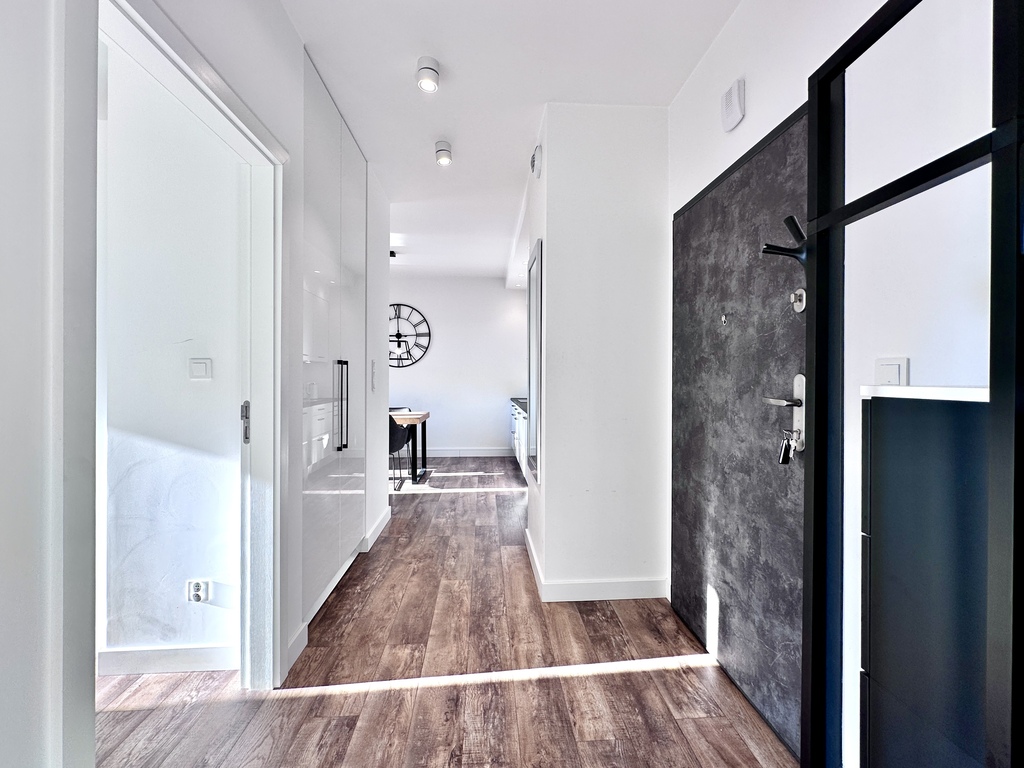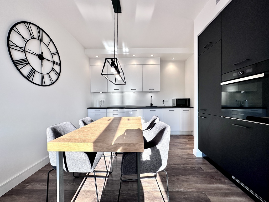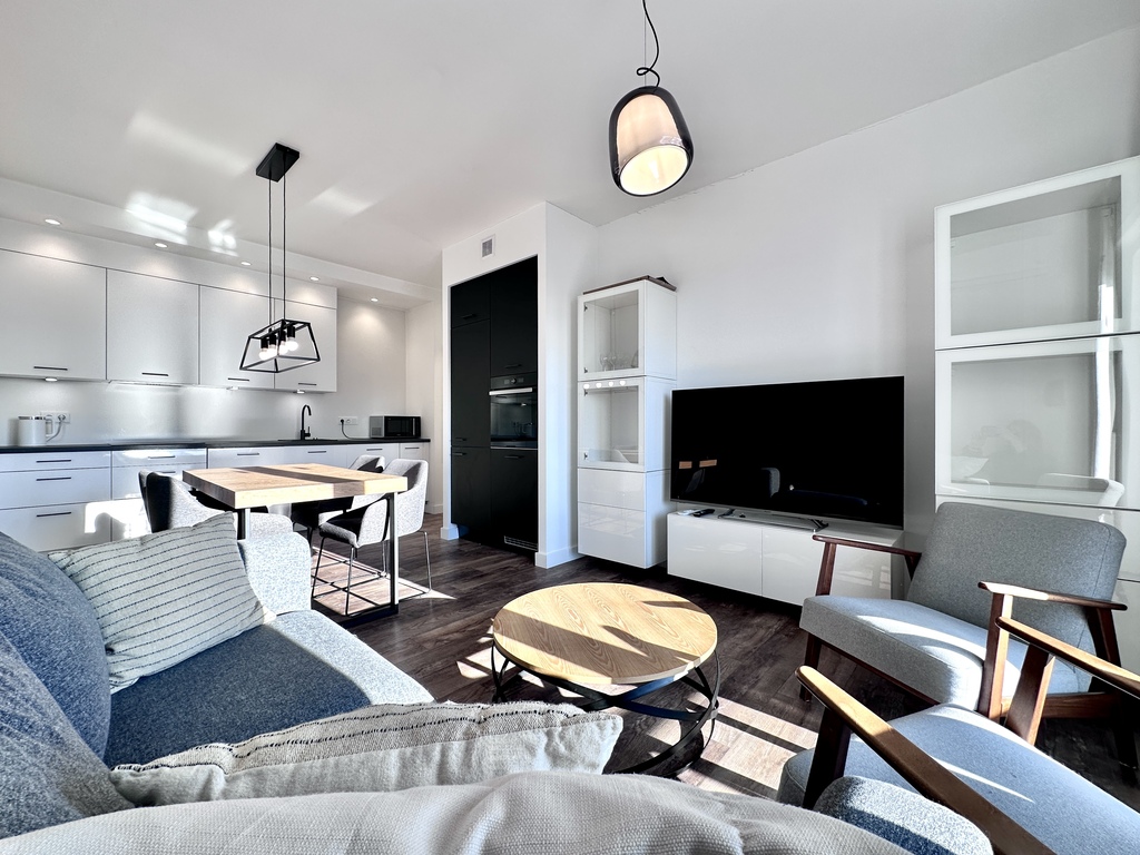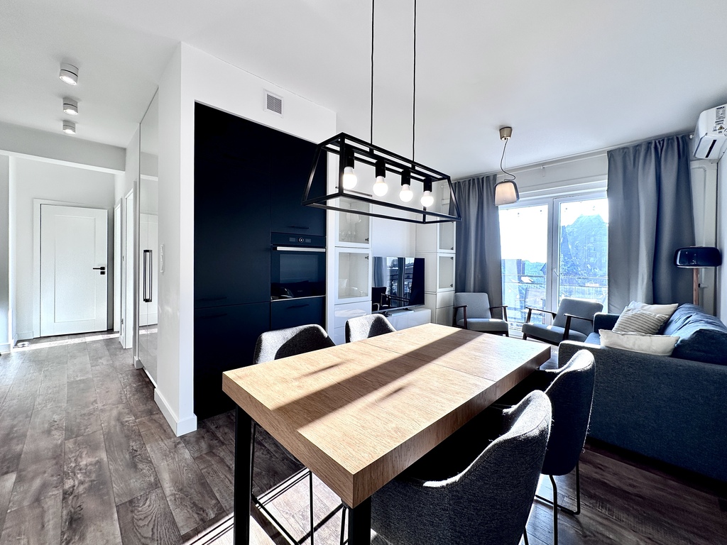 Nowoczesne trzy pokojowe mieszkanie składa się salonu połączonego z kuchnią, sypialni, pokoju, przedpokoju oraz łazienki. Kuchnia z meblami w zabudowie, wyposażona w nowoczesny sprzęt (lodówka, piekarnik, zmywarka, platy indukcyjna) oraz stół z krzesłami. W salonie wygodny zestaw wypoczynkowy (kanapa oraz fotele).