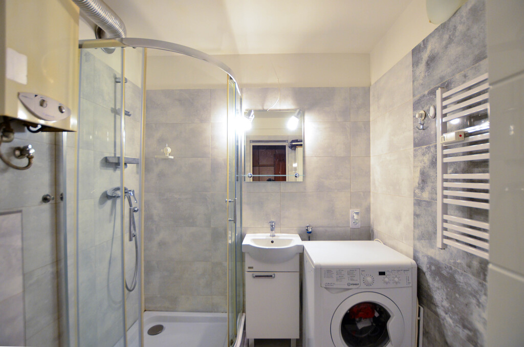 - Łazienka wyposażona w pralkę i kabinę prysznicową,