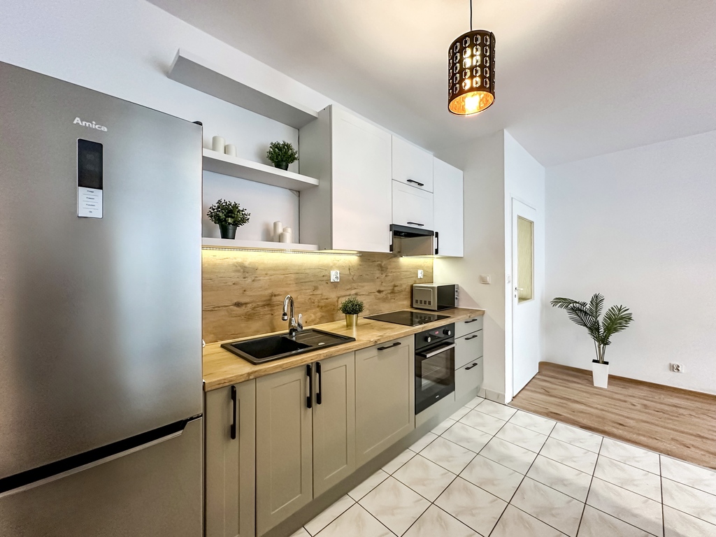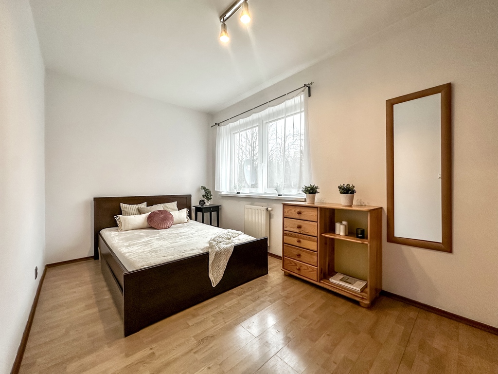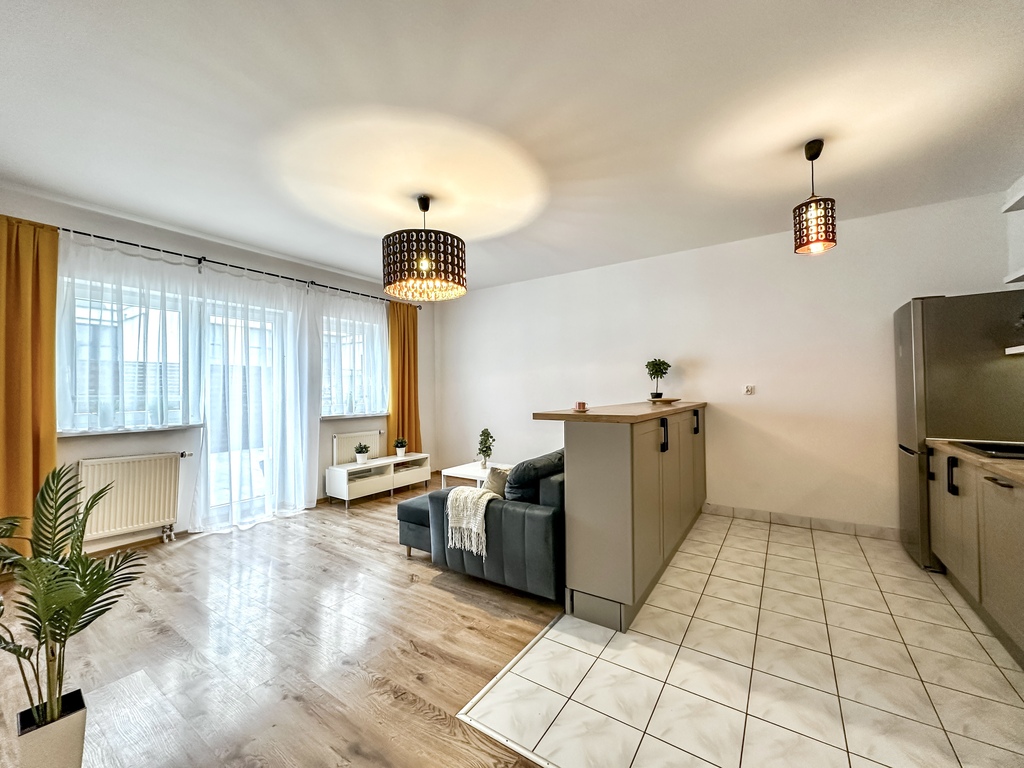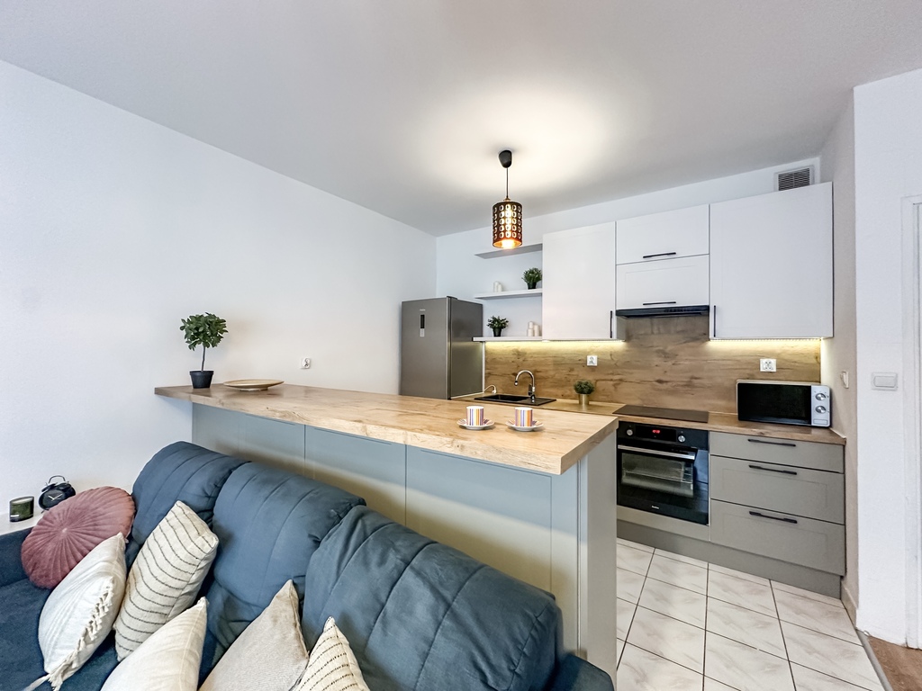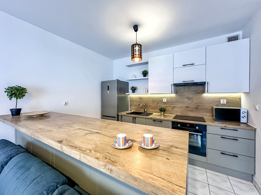 Nieruchomość składa się z przestronnego i jasnego salonu z możliwością wyjścia na duży taras, który dzięki drewnianemu ogrodzeniu zapewnia komfort i prywatność. Funkcjonalny aneks kuchenny wyposażony jest w sprzęt AGD: piekarnik, płytę grzewczą, lodówkę z zamrażarką, okap oraz zmywarkę. Blat oddziela część kuchenną od salonu, tworząc wygodną przestrzeń do codziennego użytkowania. Sypialnia posiada wygodne dwuosobowe łóżko, dwa stoliki nocne, pojemną szafę, komodę oraz lustro. Łazienka wyposażona jest w prysznic. W przedpokoju znajduje się pojemna szafa i komoda. Dodatkowym atutem nieruchomości jest miejsce parkingowe w garażu podziemnym.