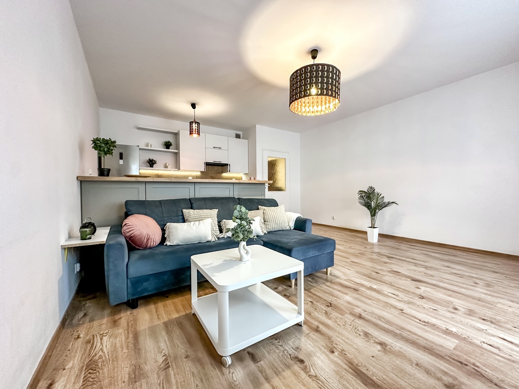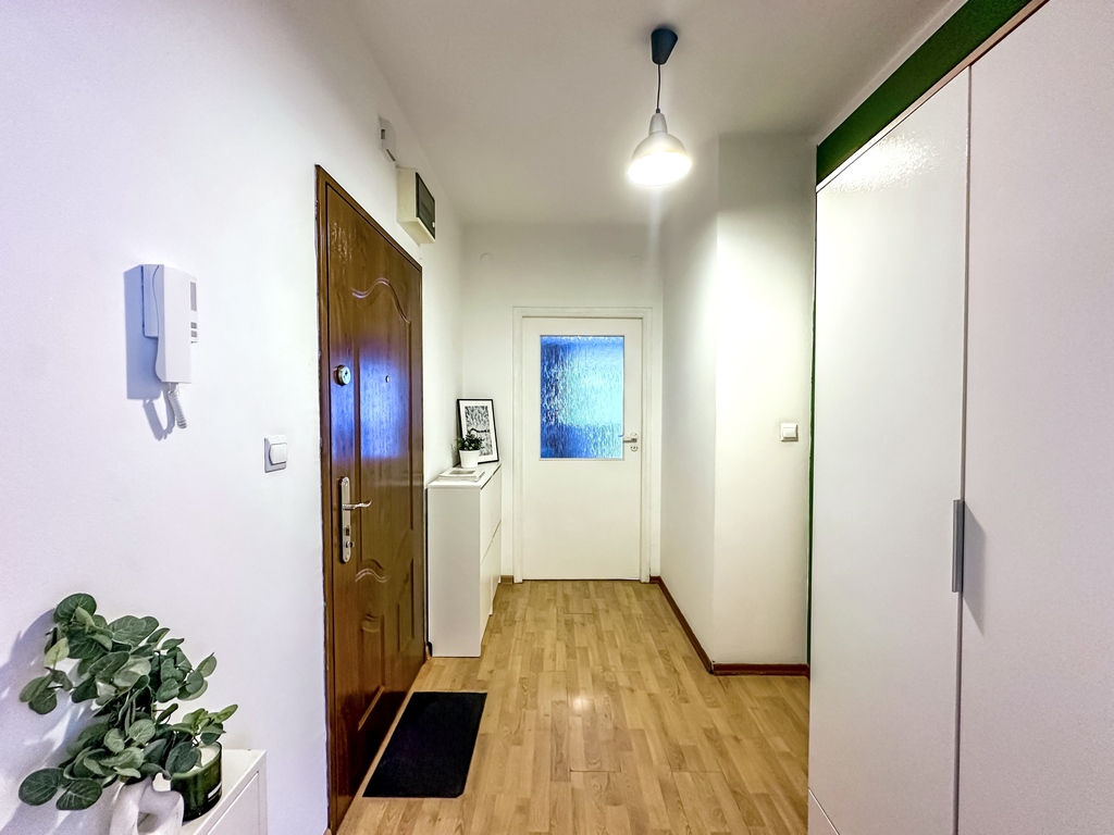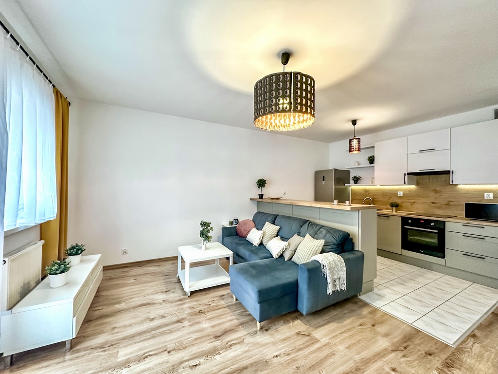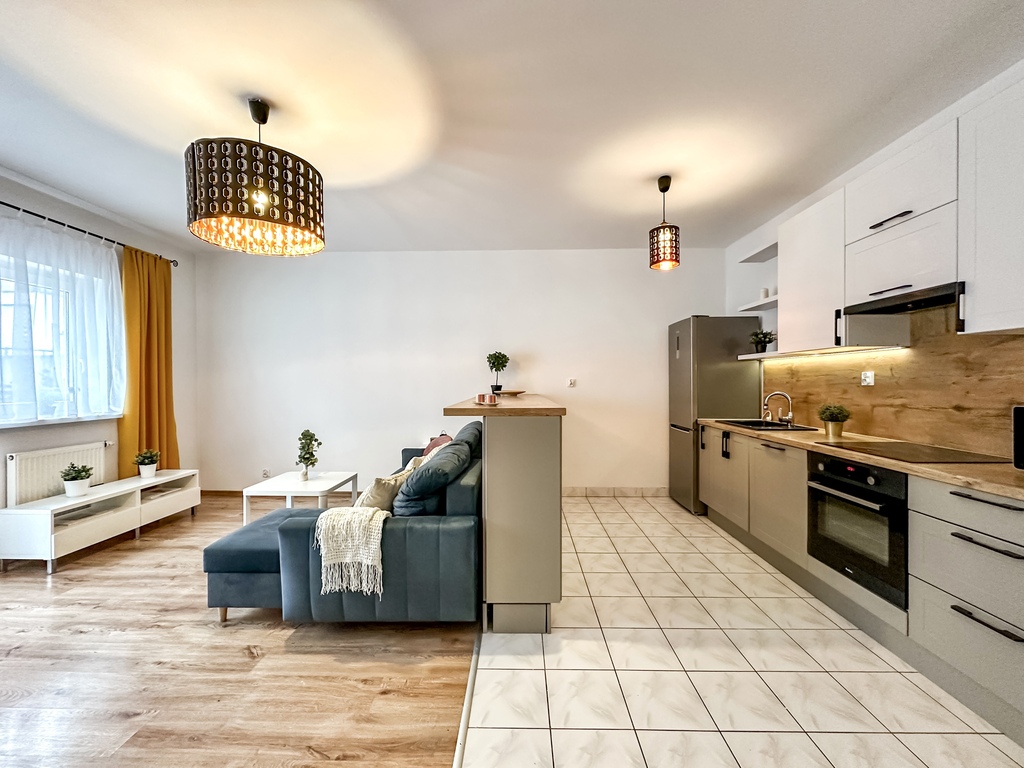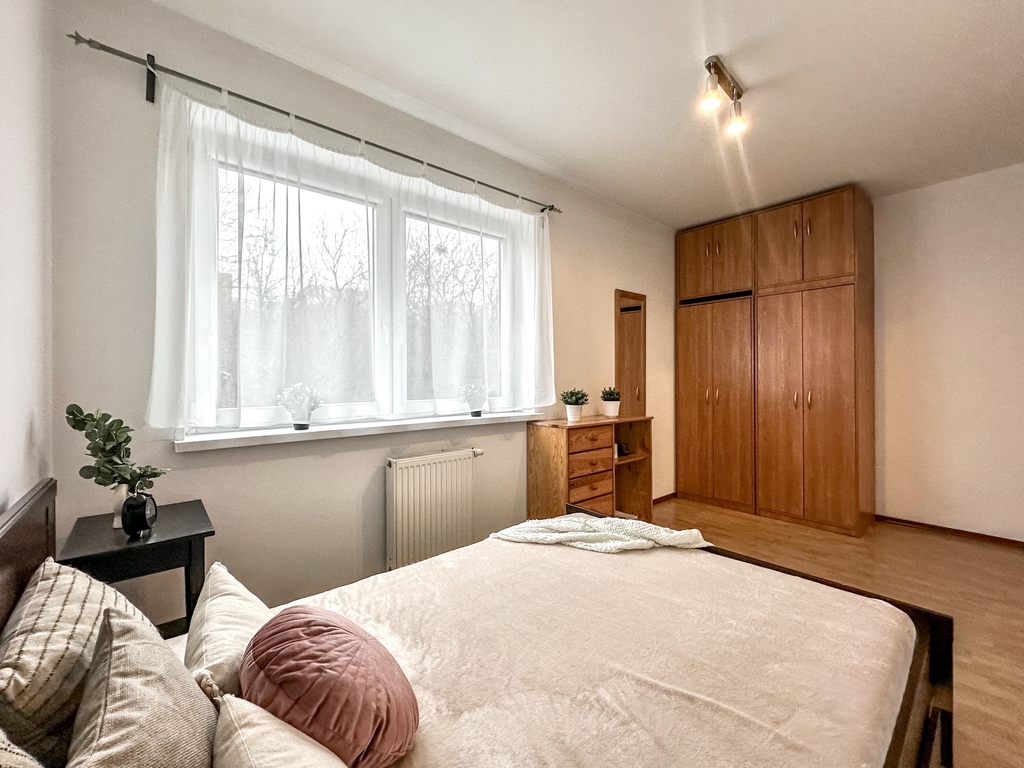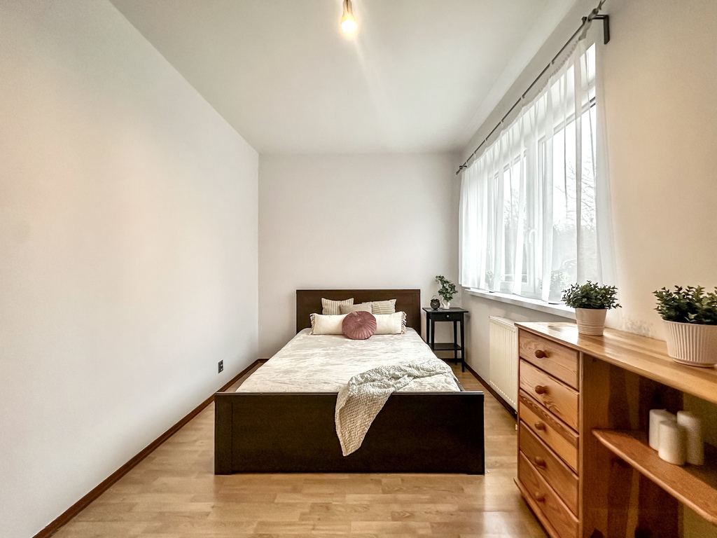 Nieruchomość składa się z przestronnego i jasnego salonu z możliwością wyjścia na duży taras, który dzięki drewnianemu ogrodzeniu zapewnia komfort i prywatność. Funkcjonalny aneks kuchenny wyposażony jest w sprzęt AGD: piekarnik, płytę grzewczą, lodówkę z zamrażarką, okap oraz zmywarkę. Blat oddziela część kuchenną od salonu, tworząc wygodną przestrzeń do codziennego użytkowania. Sypialnia posiada wygodne dwuosobowe łóżko, dwa stoliki nocne, pojemną szafę, komodę oraz lustro. Łazienka wyposażona jest w prysznic. W przedpokoju znajduje się pojemna szafa i komoda. Dodatkowym atutem nieruchomości jest miejsce parkingowe w garażu podziemnym.