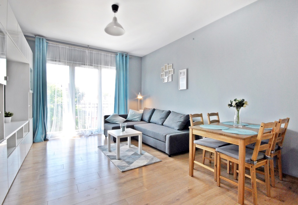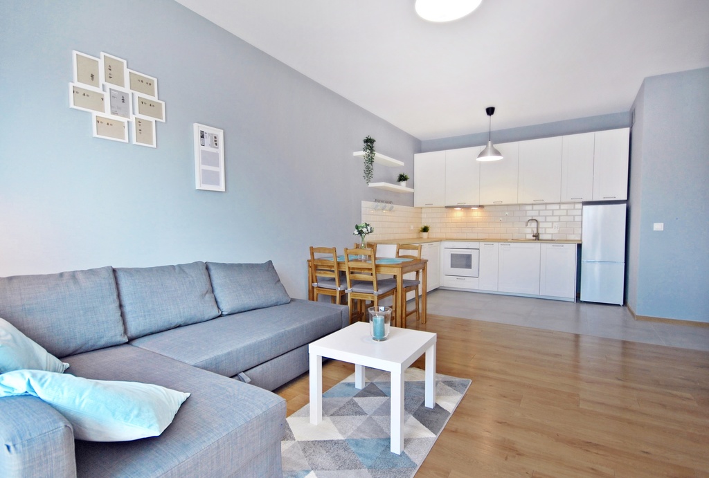Mieszkanie zostało zaprojektowane, wyposażone i wykończone z wysokiej jakości materiałów. Kuchnia z meblami w zabudowie, wyposażona w najpotrzebniejszy sprzęt AGD (lodówka z zamrażarką, piekarnik, płyta grzewcza, zmywarka). W salonie wygodna kanapa narożna z funkcją spania, stolik kawowy, meble oraz telewizor. Z pokoju dziennego wyjście na przestronny balkon. Łazienka wyposażona w wannę ze szklanym parawanem. Wyjątkową cechą studia jest podwyższony sufit.