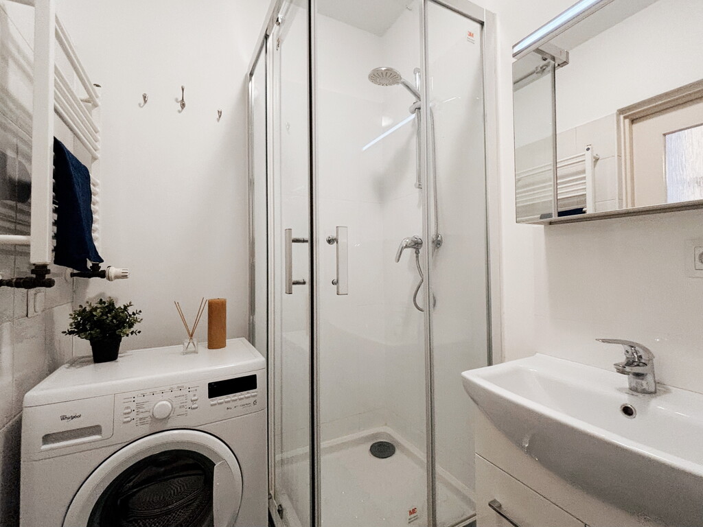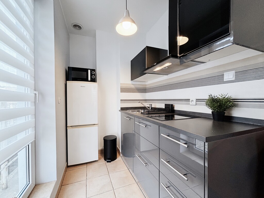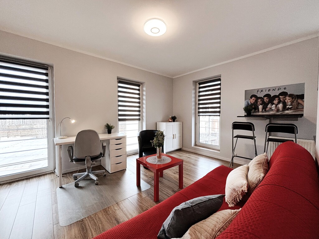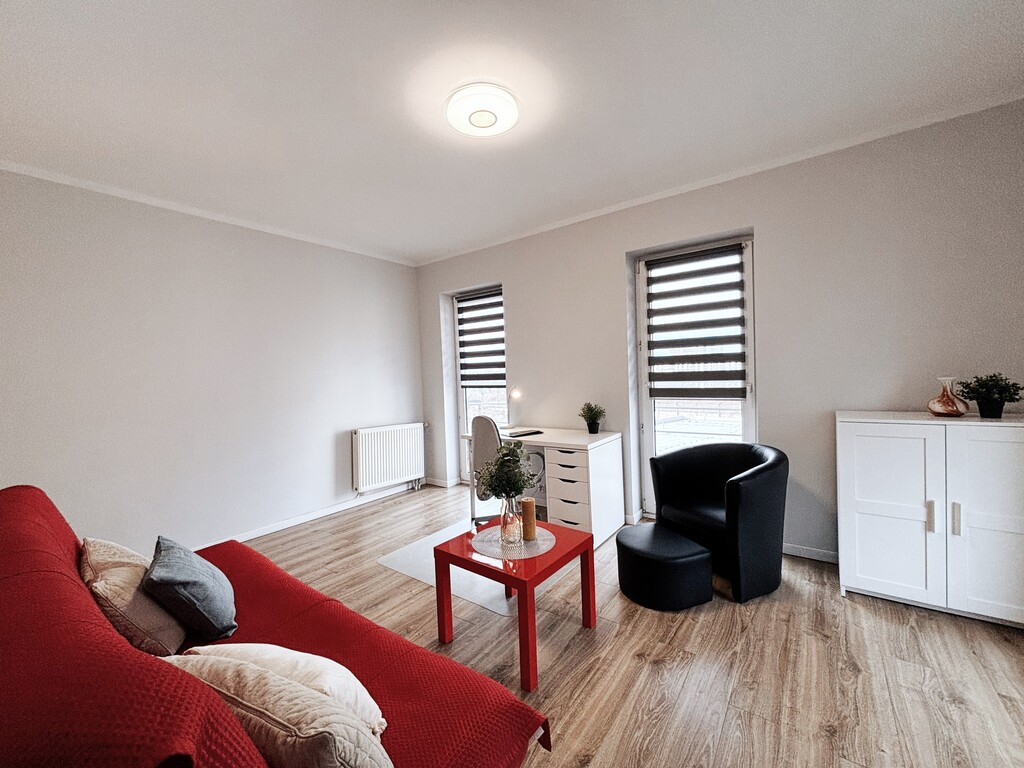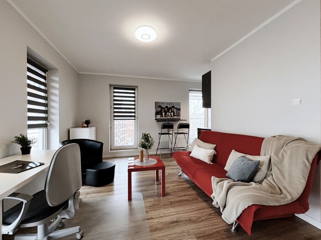 Lokum dostosowane dla osoby uczącej się lub pracującej zdalnie. Przestronny salon z biurkiem i komodą został połączony z aneksem kuchennym, wyposażonym w kuchenkę indukcyjną, mikrofalę, lodówkę oraz zlewozmywak. Rozkładany blat z dwoma hokerami zapewnia wygodne miejsce do spożywania posiłków. W łazience znajduje się prysznic, szafka z umywalką, pralka oraz miska WC. W przedpokoju mieści się pojemna, zabudowana szafa z półkami i drążkiem. Dodatkowe doposażenie do uzgodnienia – istnieje możliwość wyposażenia mieszkania w łóżko lub kanapę na koszt właściciela.
