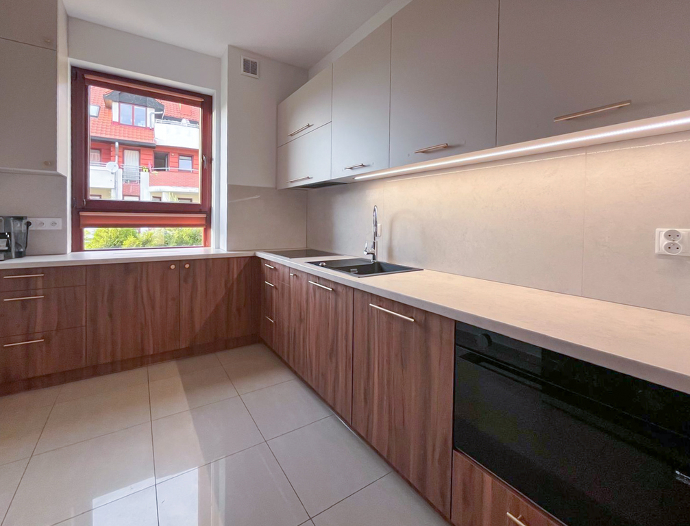 En alquiler: luminoso, elegante y totalmente amueblado apartamento de 3 habitaciones (63,5 m²), ofrecido en primer alquiler, ubicado en una moderna urbanización cerrada en la calle Chabrowa, Wysoka, justo junto a la frontera sur de Wrocław (Krzyki–Ołtaszyn).