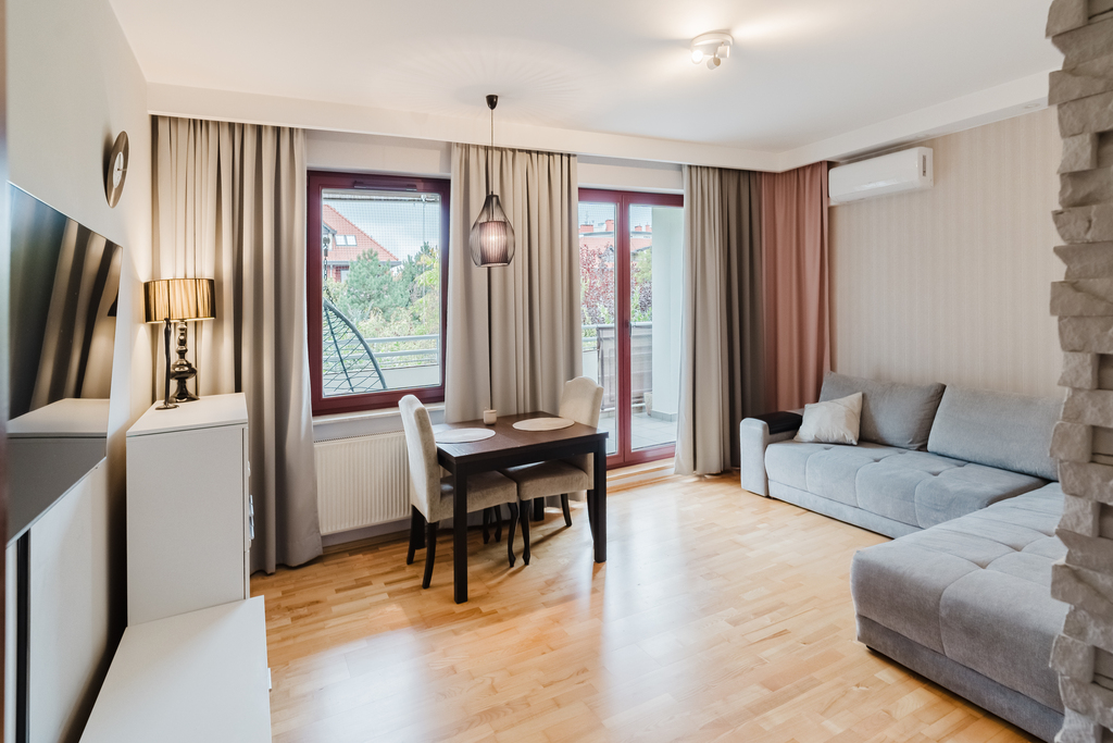 For rent: a bright, elegant and fully furnished 3-room apartment (63.5 m²) offered for first tenancy, located in a modern, gated residential estate at Chabrowa Street, Wysoka, directly next to the southern border of Wrocław (Krzyki–Ołtaszyn).