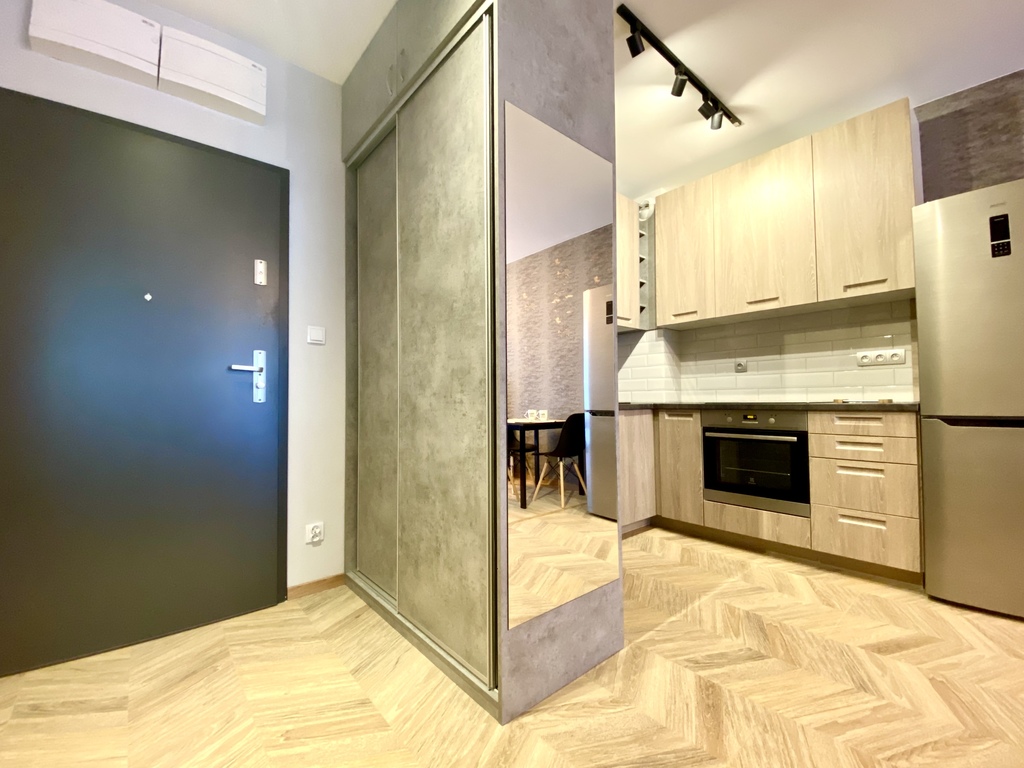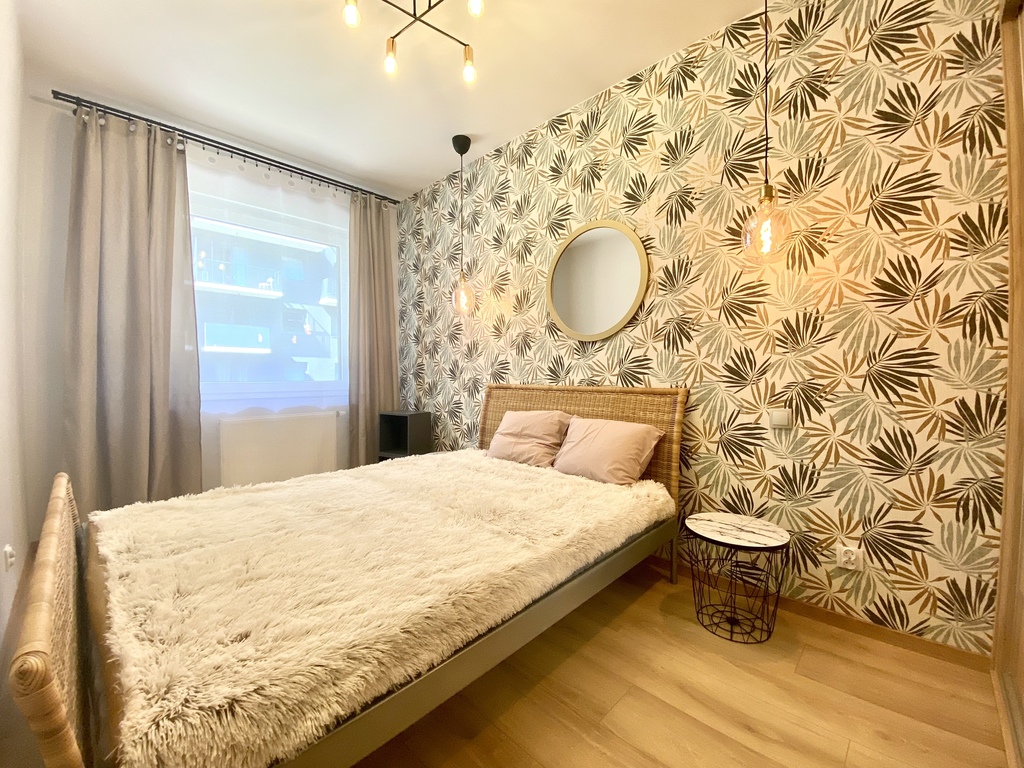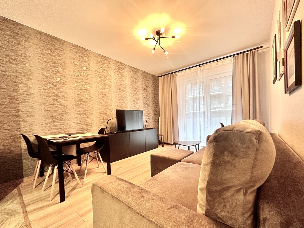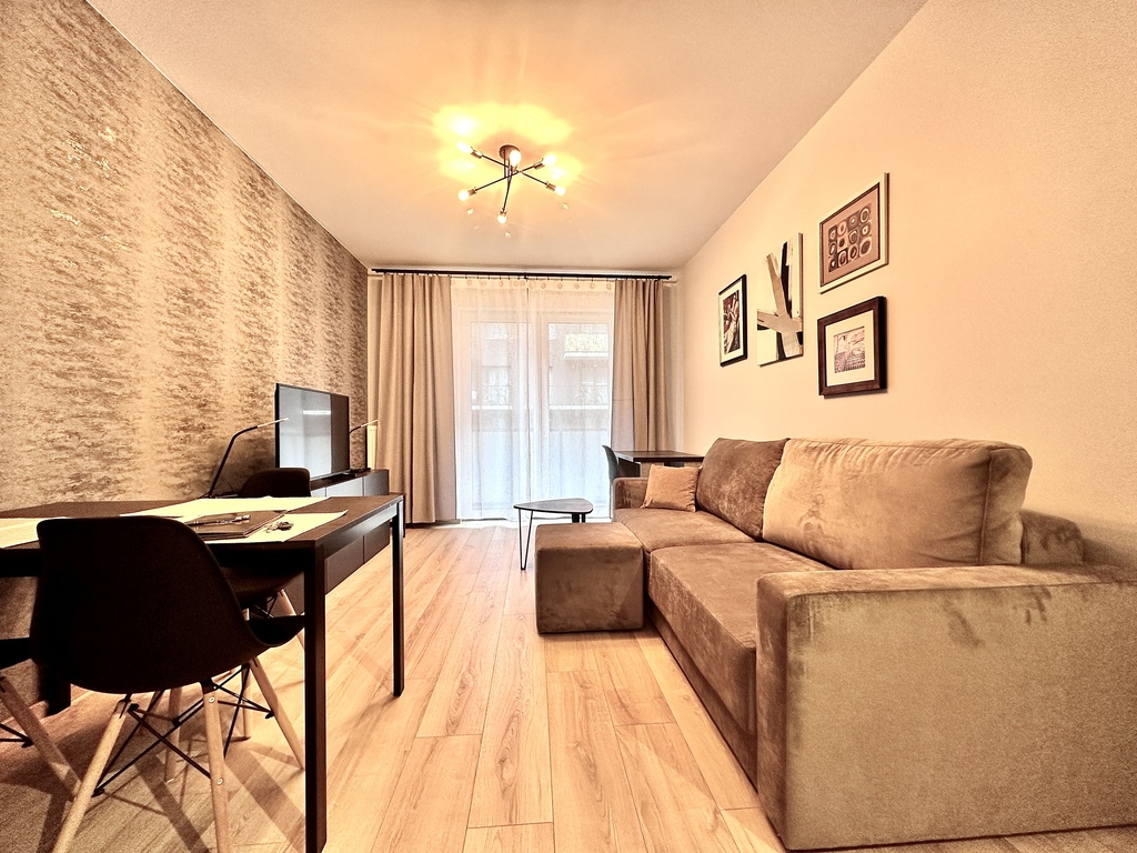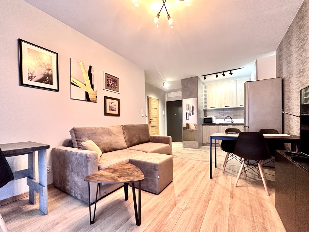 Nowoczesne dwu pokojowe mieszkanie składa się salonu połączonego z kuchnią, sypialni, przedpokoju oraz łazienki. Kuchnia z meblami w zabudowie, wyposażona w nowoczesny sprzęt (lodówka, piekarnik, zmywarka, płyta indukcyjna) oraz stół z krzesłami. W salonie wygodna sofa, Tv oraz biurko.