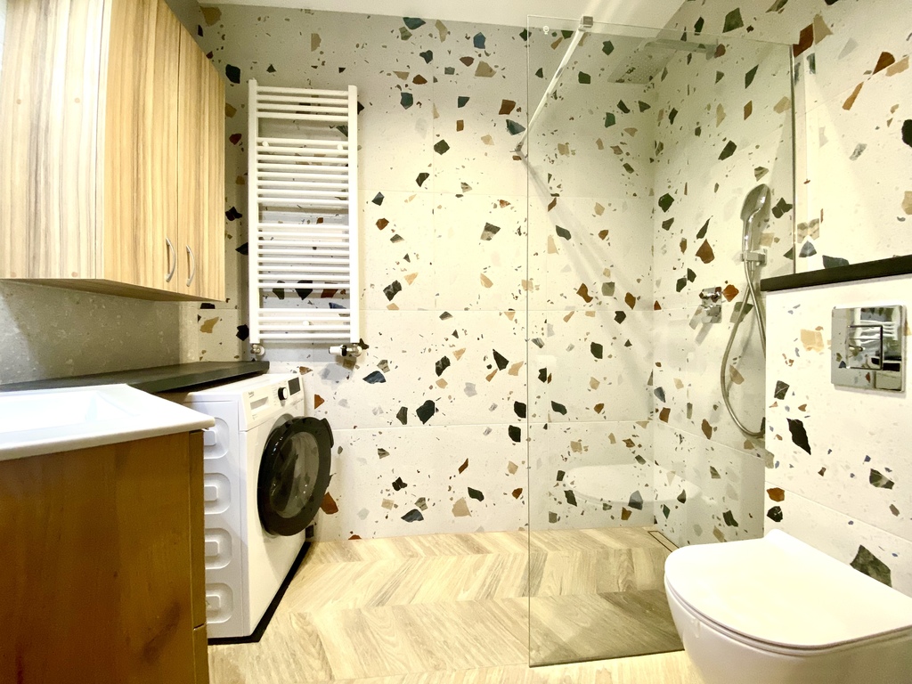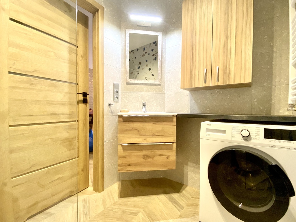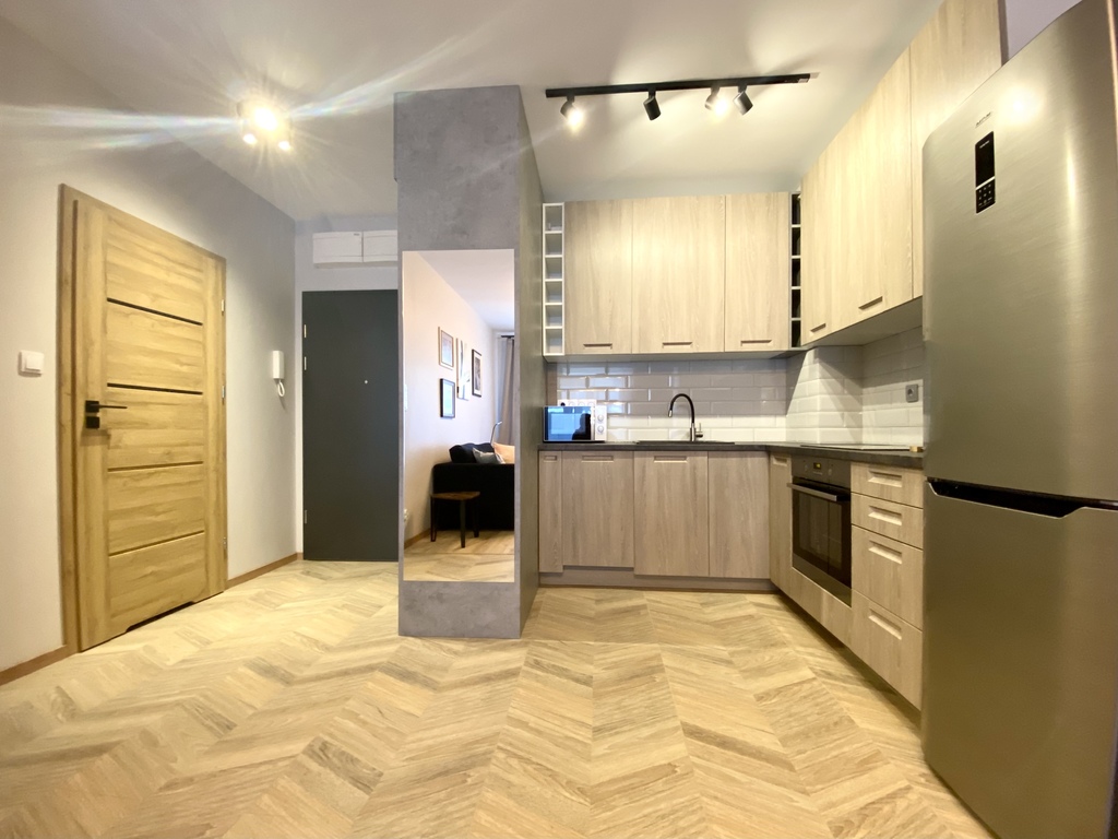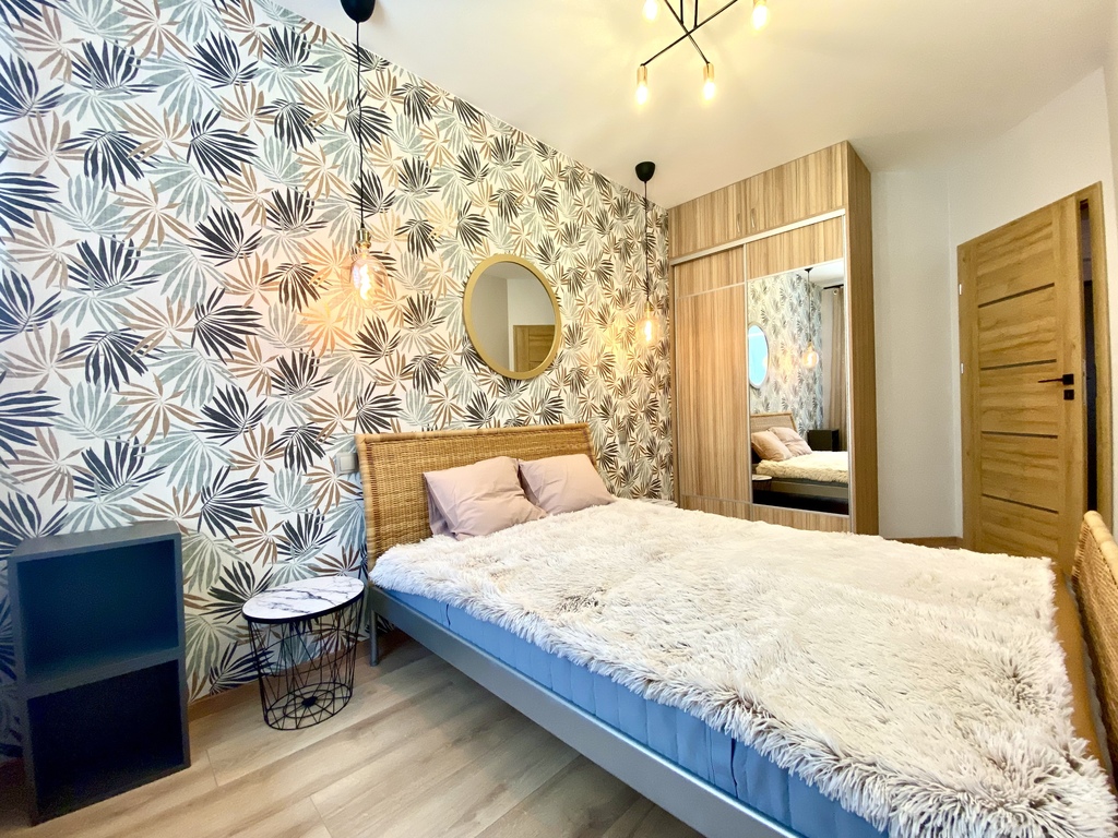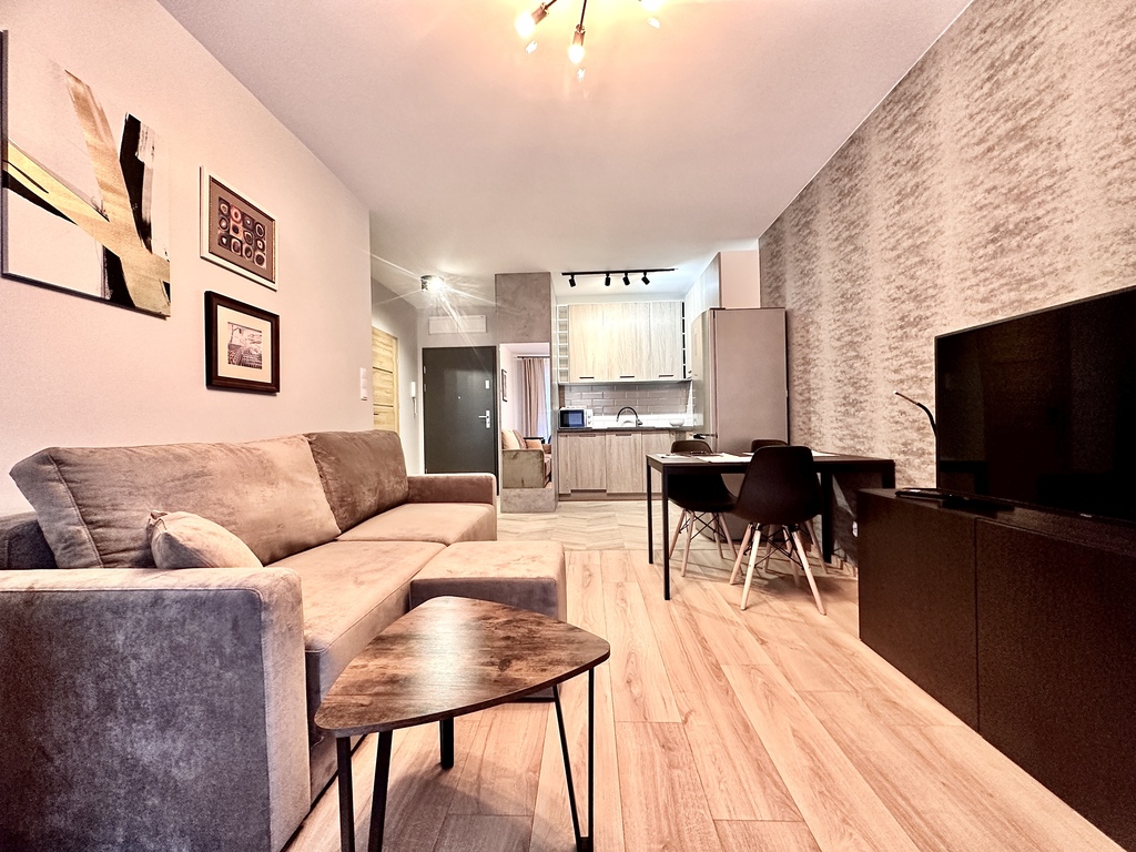 Nowoczesne dwu pokojowe mieszkanie składa się salonu połączonego z kuchnią, sypialni, przedpokoju oraz łazienki. Kuchnia z meblami w zabudowie, wyposażona w nowoczesny sprzęt (lodówka, piekarnik, zmywarka, płyta indukcyjna) oraz stół z krzesłami. W salonie wygodna sofa, Tv oraz biurko.