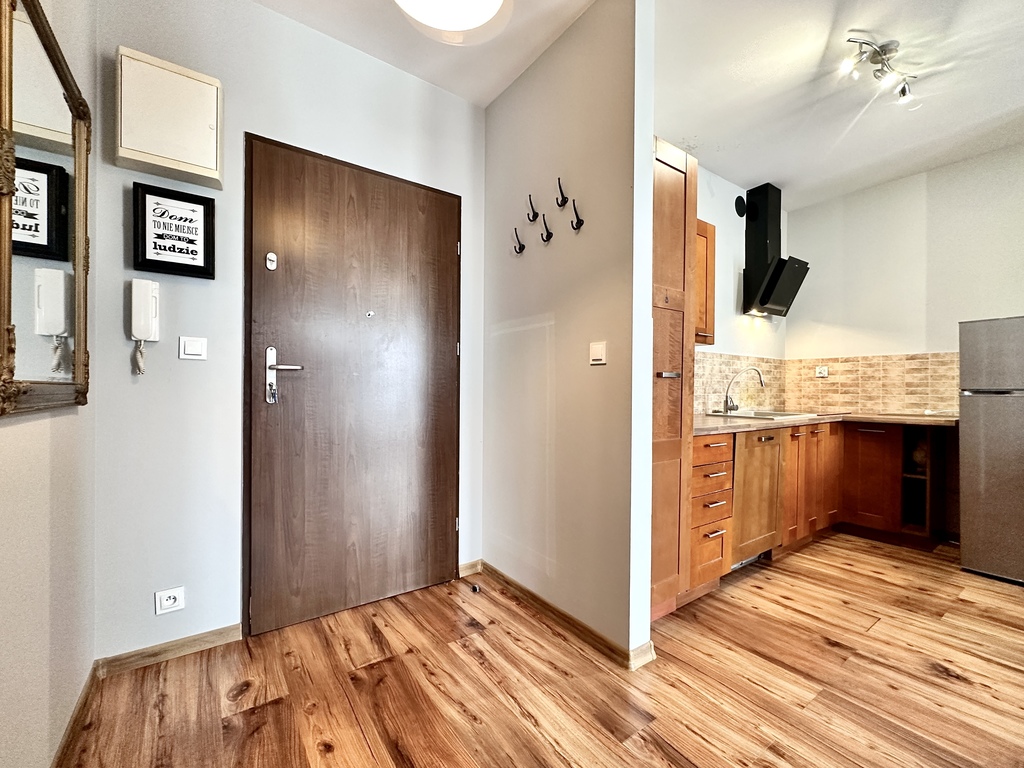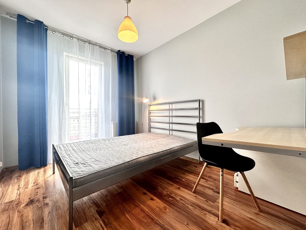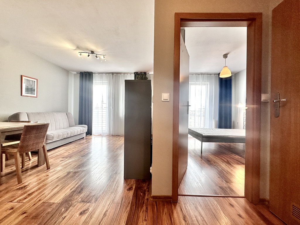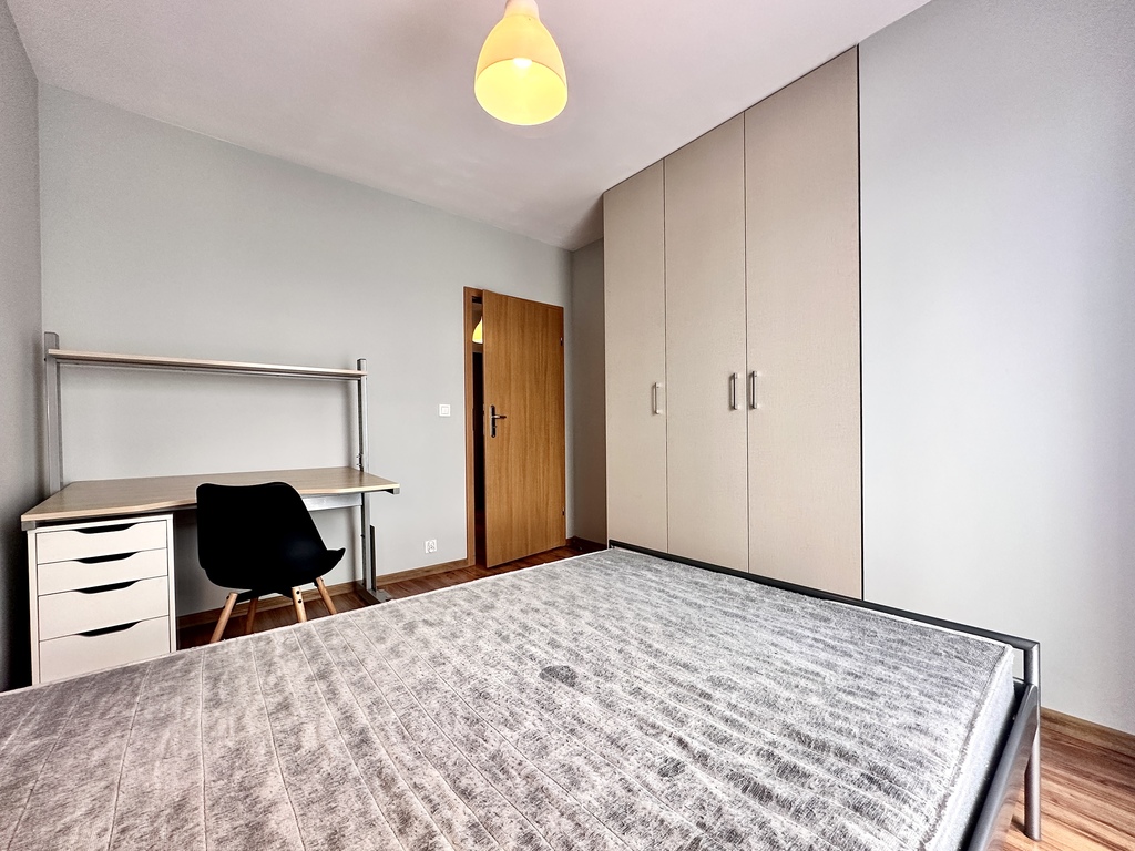 Salon wyposażony w komfortową kanapę, szafkę RTV, Telewizor, oraz szafę w zabudowie. Z salonu wyjście na przestronny, słoneczny balkon. W sypialni podwójne łóżko z materacem, biurko oraz szafa w zabudowie . Łazienka z prysznicem. Kuchnia z meblami w zabudowie, wyposażony w nowoczesny sprzęt AGD (kuchenka, piekarnik, zmywarka, lodówka.
