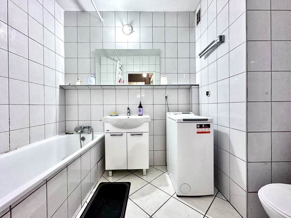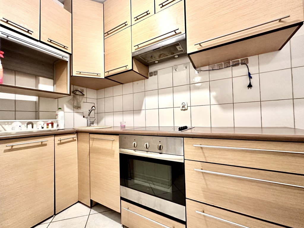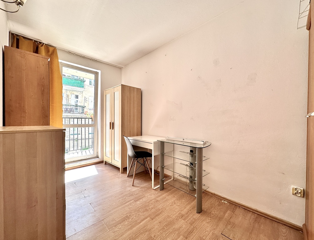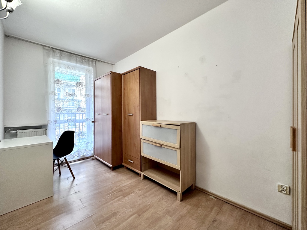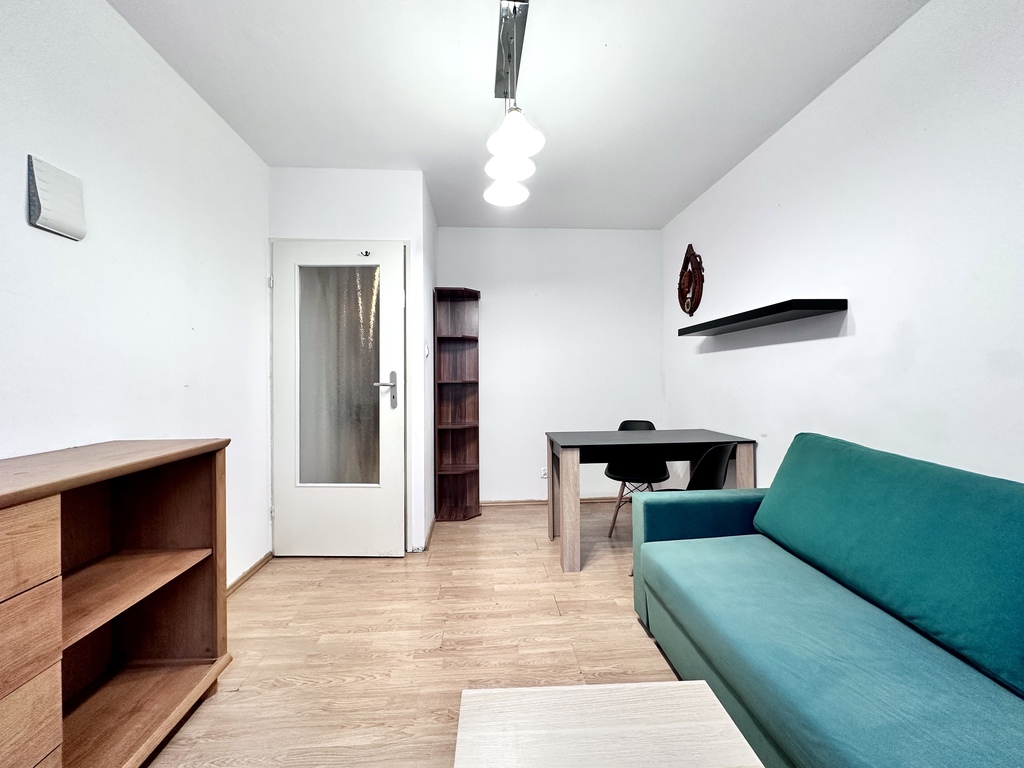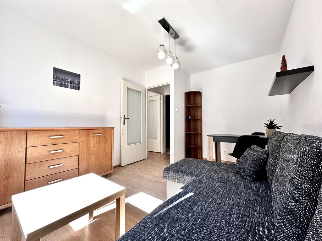 Kuchnia wyposażona w najpotrzebniejszy sprzęt AGD (lodówka z zamrażarką, piekarnik, płyta grzewcza, zmywarka). W salonie wygodna sofa z funkcją spania, stół z krzesłami oraz komoda. W Pokoju zestaw mebli, biurko. Z pokoju wyjście na słoneczny balkon. Łazienka z wanną. W przedpokoju pojemna szafa w zabudowie.