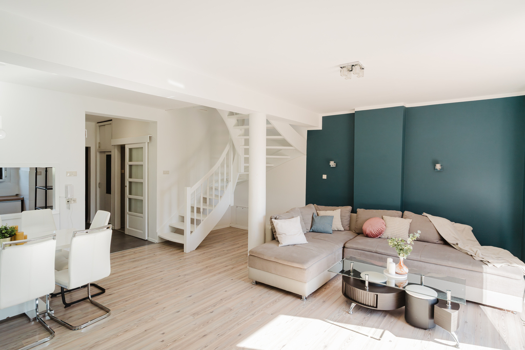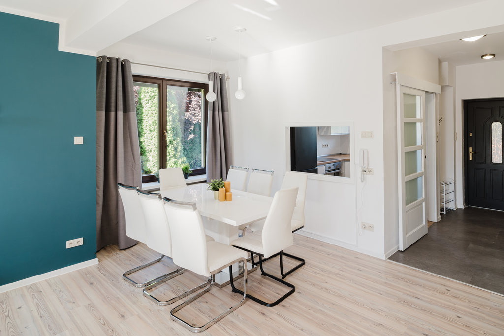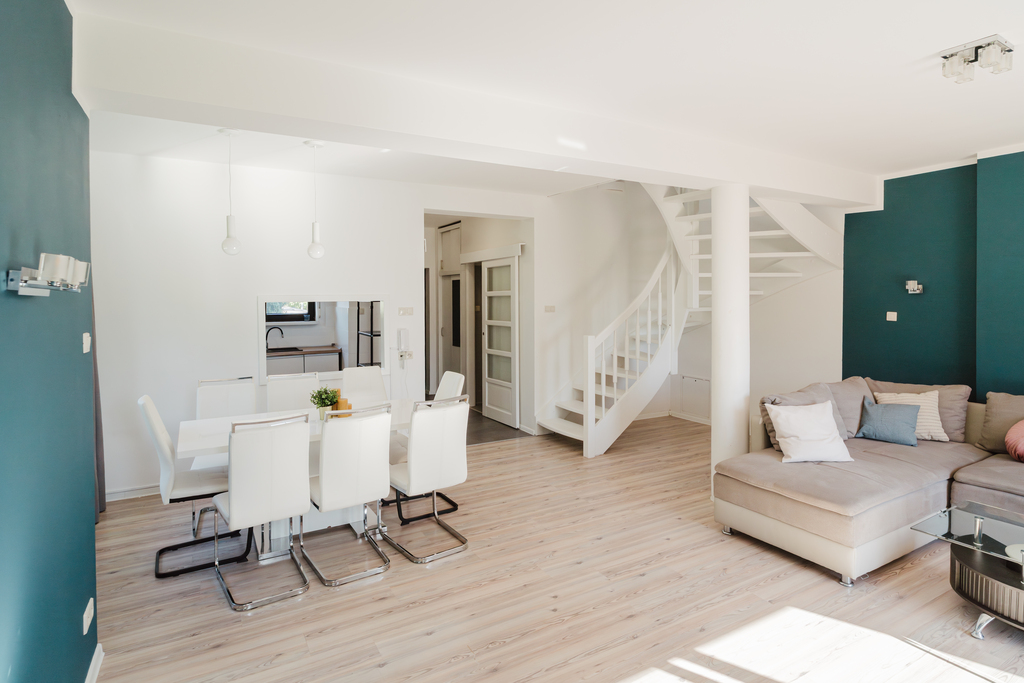 Dom w zabudowie szeregowej mieści się w spokojnej okolicy, wśród niskiej zabudowy. Dom składa się z dwóch poziomów, jest utrzymany w jasnej kolorystyce.