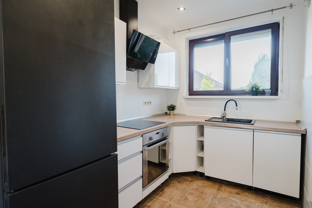 Kuchnia z meblami w zabudowie wyposażona w najpotrzebniejszy sprzęt AGD (lodówka z zamrażarką, płyta elektryczna, piekarnik, zmywarka). W pokoju dziennym znajduje się duża, wygodna kanapa narożna, stolik kawowy oraz stół z krzesłami. Z salonu wyjście na taras naziemny z pięknym, dużym ogrodem.