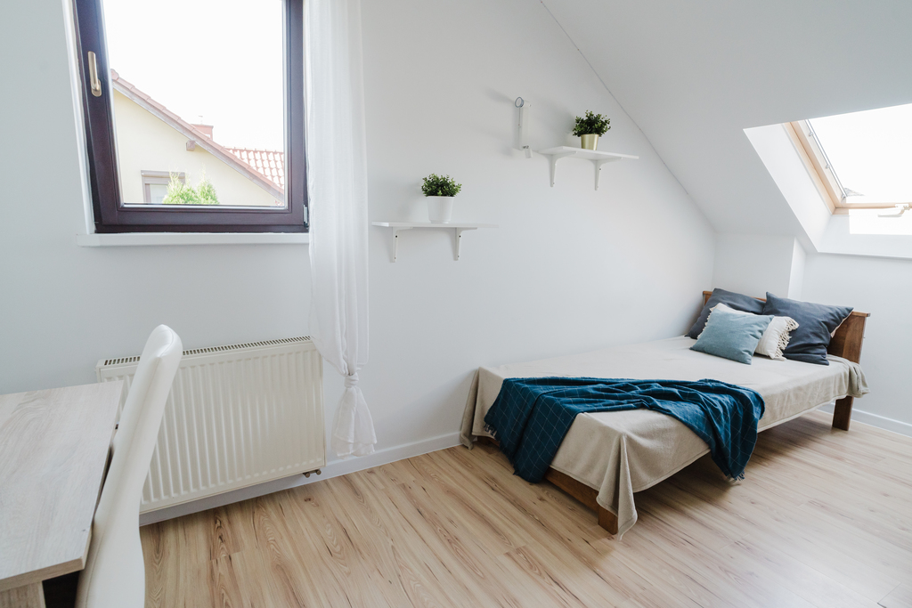 Sypialnia wyposażona w łóżko z podwójnym materacem, oraz stolik. Drugi pokój wyposażony jest w rozkładaną kanapę, biurko oraz szafę a trzeci w pojedyncze łóżko i biurko.