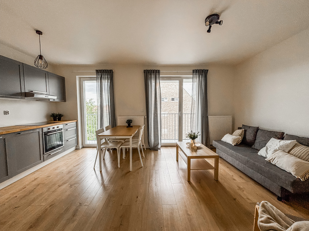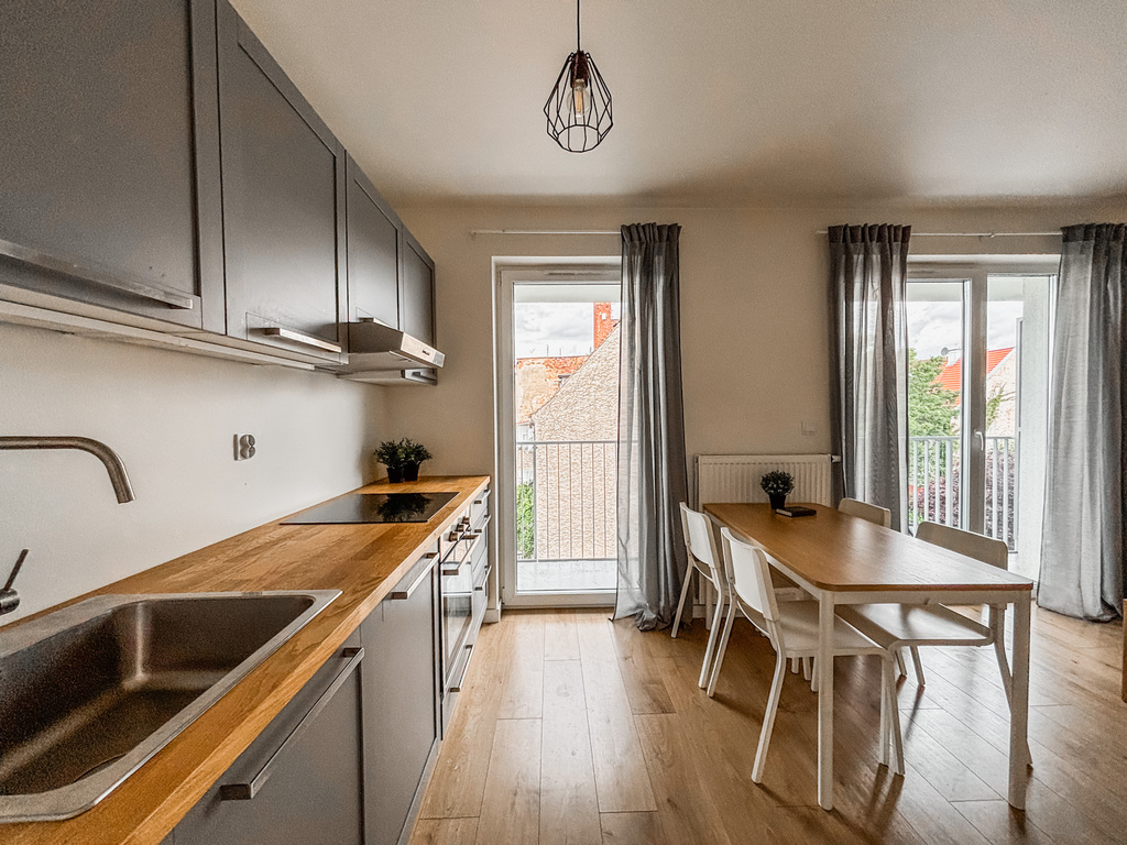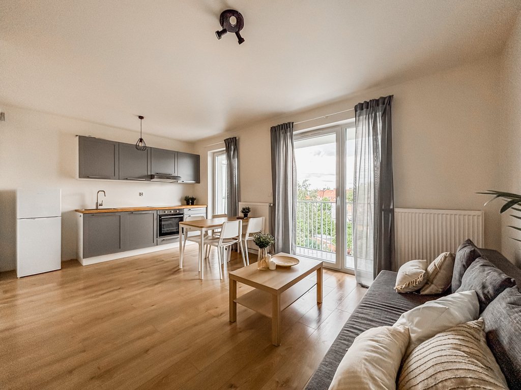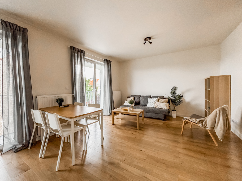 Mieszkanie znajduje się w nowoczesnym budynku z windą, oferując komfort i funkcjonalność. Nieruchomość składa się z przestronnego salonu, w którym znajduje się rozkładana kanapa, komoda, fotel. W części jadalnianej umieszczono stół z krzesłami. Dobrze oświetlony aneks kuchenny wyposażony jest w nowoczesną zabudowę meblową oraz wysokiej jakości urządzenia AGD: piekarnik, płyta indukcyjna, okap, lodówka, zmywarka. Łazienka wyposażona jest w funkcjonalną kabinę prysznicową. Dodatkowym atutem mieszkania jest przestronny balkon, idealny na chwilę relaksu na świeżym powietrzu. Lokal jest jasny, przestronny i doskonale zaprojektowany, co sprawia, że jest to idealne miejsce dla osób ceniących komfort, nowoczesność i wygodę.