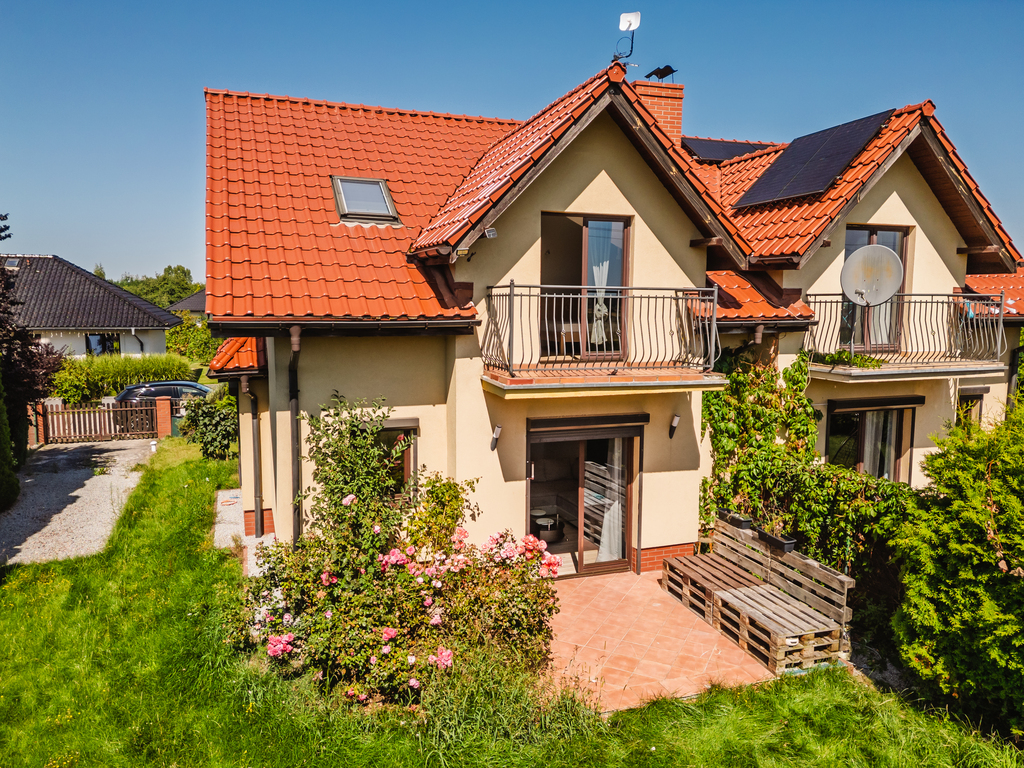 Kuchnia z meblami w zabudowie wyposażona w najpotrzebniejszy sprzęt AGD (lodówka z zamrażarką, płyta elektryczna, piekarnik, zmywarka). W pokoju dziennym znajduje się duża, wygodna kanapa narożna, stolik kawowy oraz stół z krzesłami. Z salonu wyjście na taras naziemny z pięknym, dużym ogrodem.