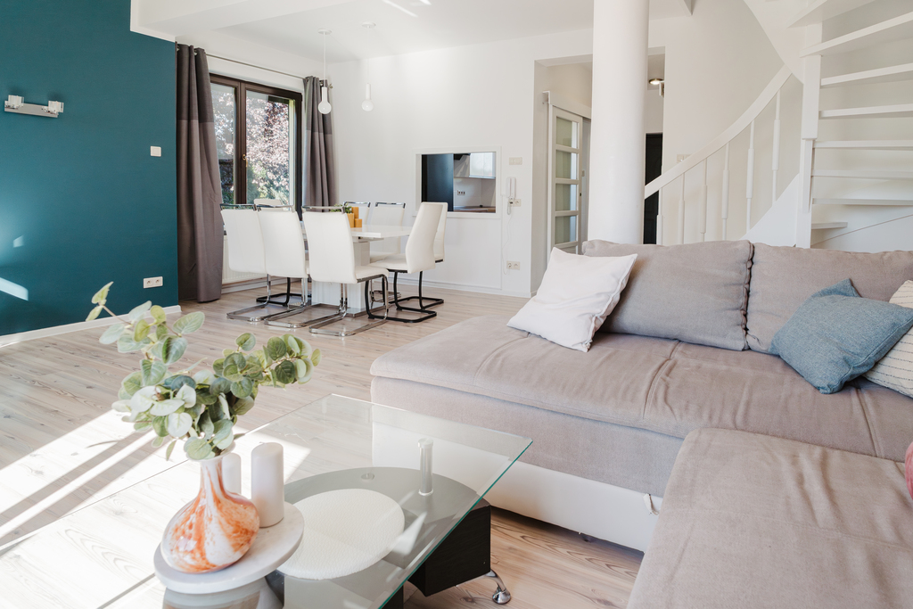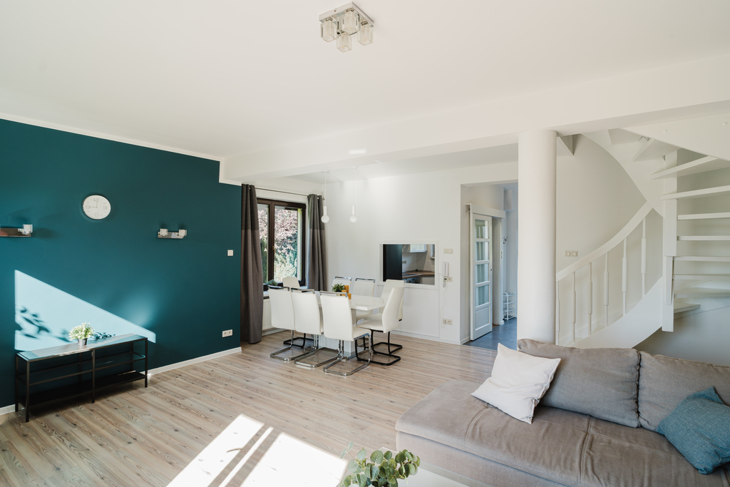 Dom w zabudowie szeregowej mieści się w spokojnej okolicy, wśród niskiej zabudowy. Dom składa się z dwóch poziomów, jest utrzymany w jasnej kolorystyce.