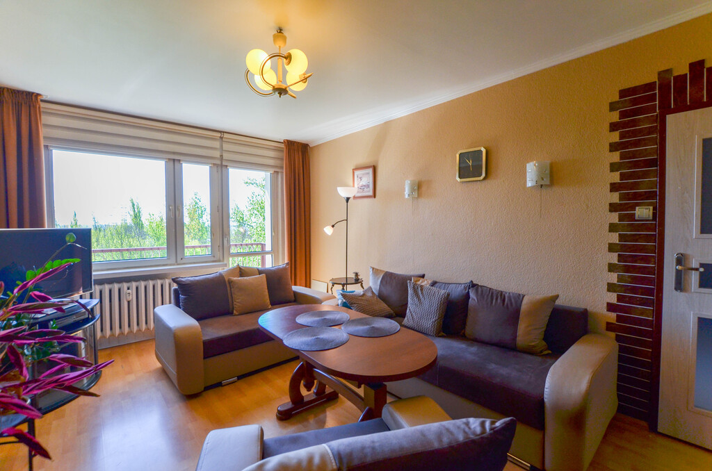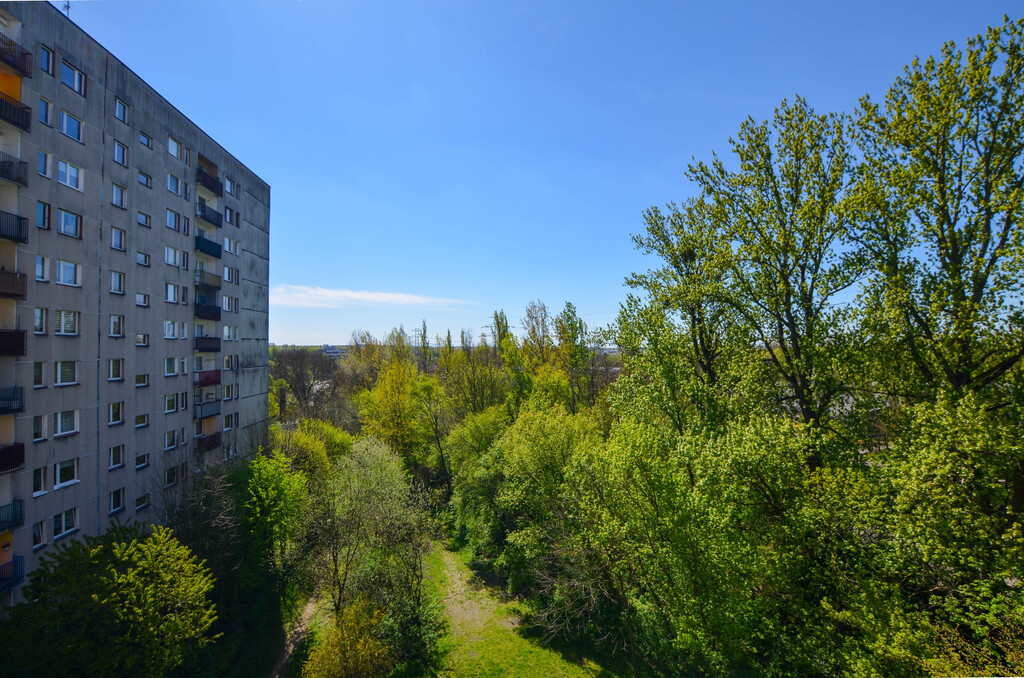- Mieszkanie posiada balkon z widokiem na drzewa,