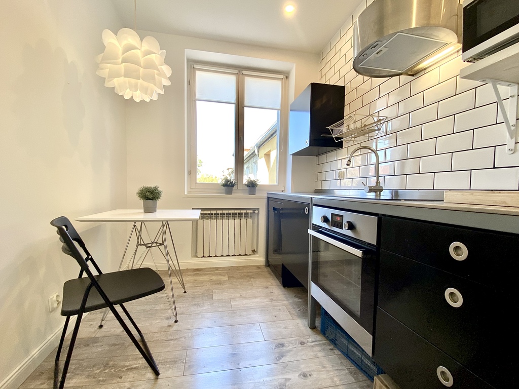 The fitted kitchen is equipped with all the necessary appliances (fridge, oven, hob, dishwasher). The spacious, sunny living room features a sofa bed, a table with chairs, a chest of drawers, and a wardrobe.