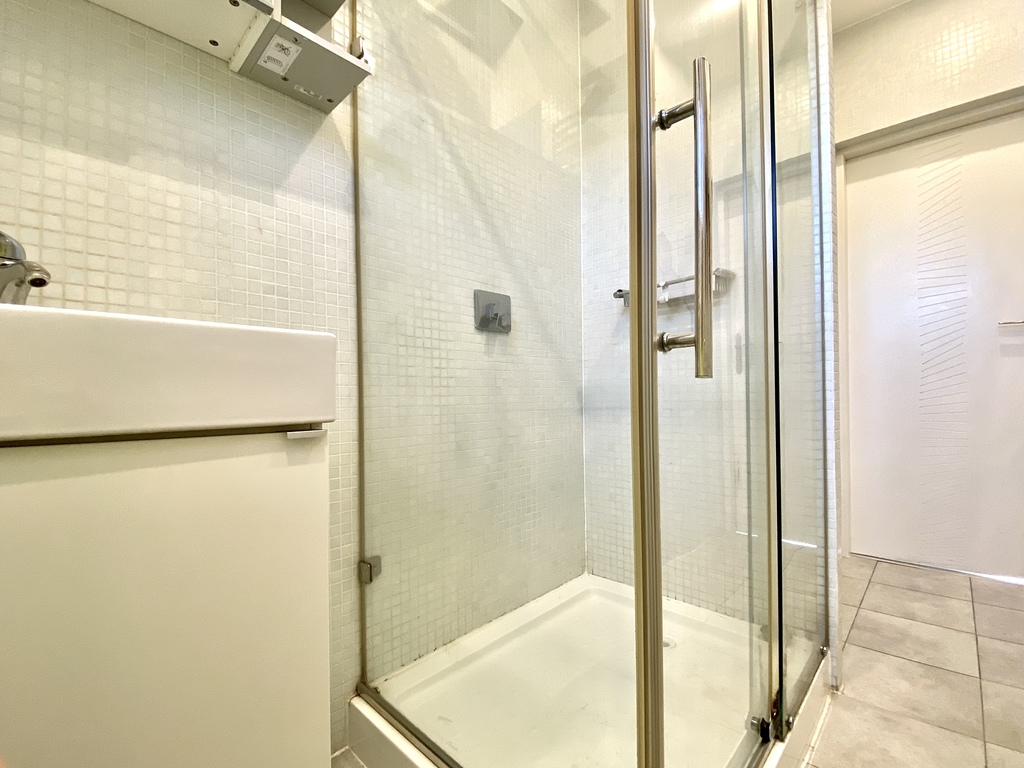 The bedroom has a spacious wardrobe and a bunk bed. The bathroom has a shower.