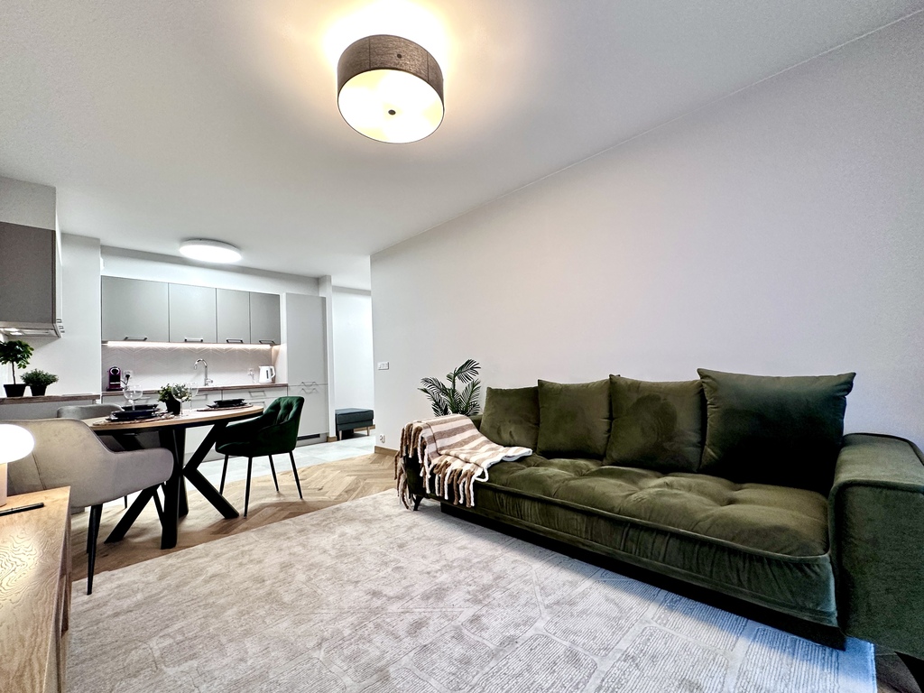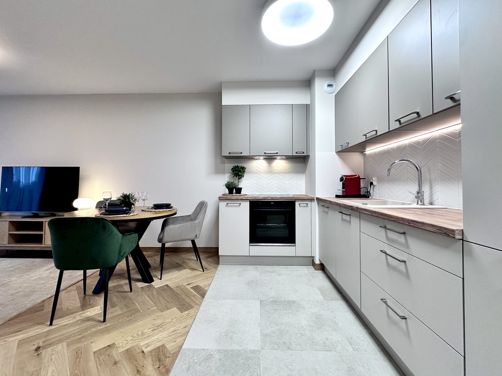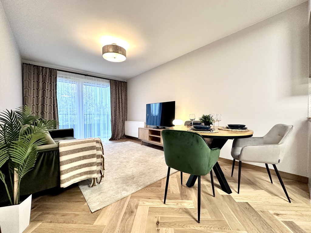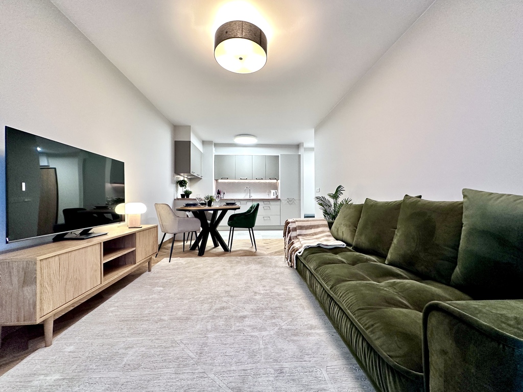 The fitted kitchen is equipped with high-quality appliances (refrigerator, oven, hob, hood, dishwasher) and a table with chairs. The living room features a comfortable sofa, a set of furniture, and a TV. The living room opens onto a balcony.
