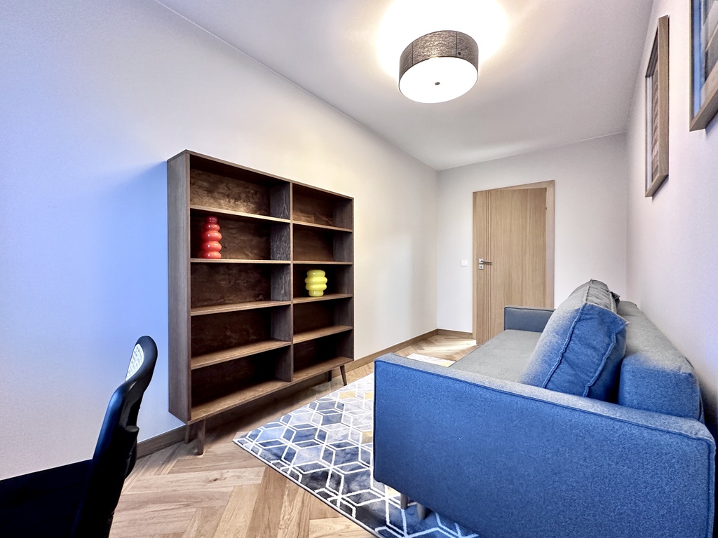 The bedroom features a double bed with a mattress and a spacious wardrobe. The second room/office has a sofa bed, a bookshelf, and a desk with a chair. Additional furnishings are available upon request.