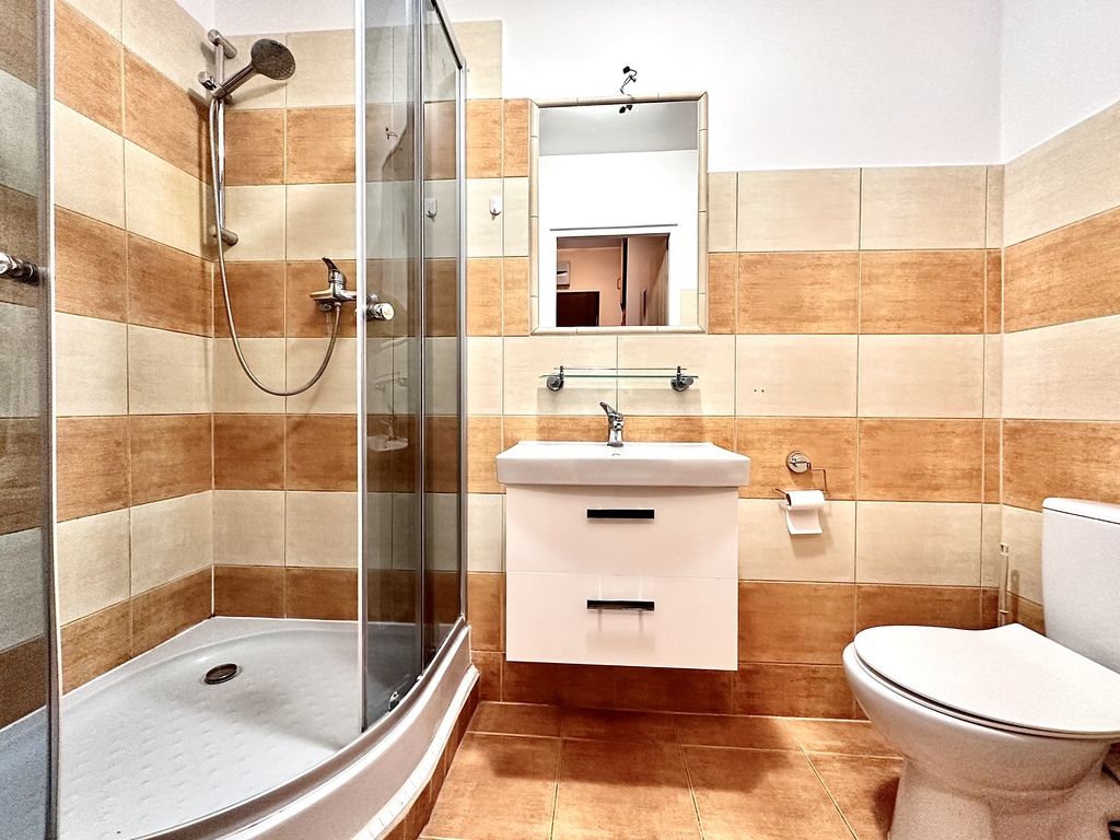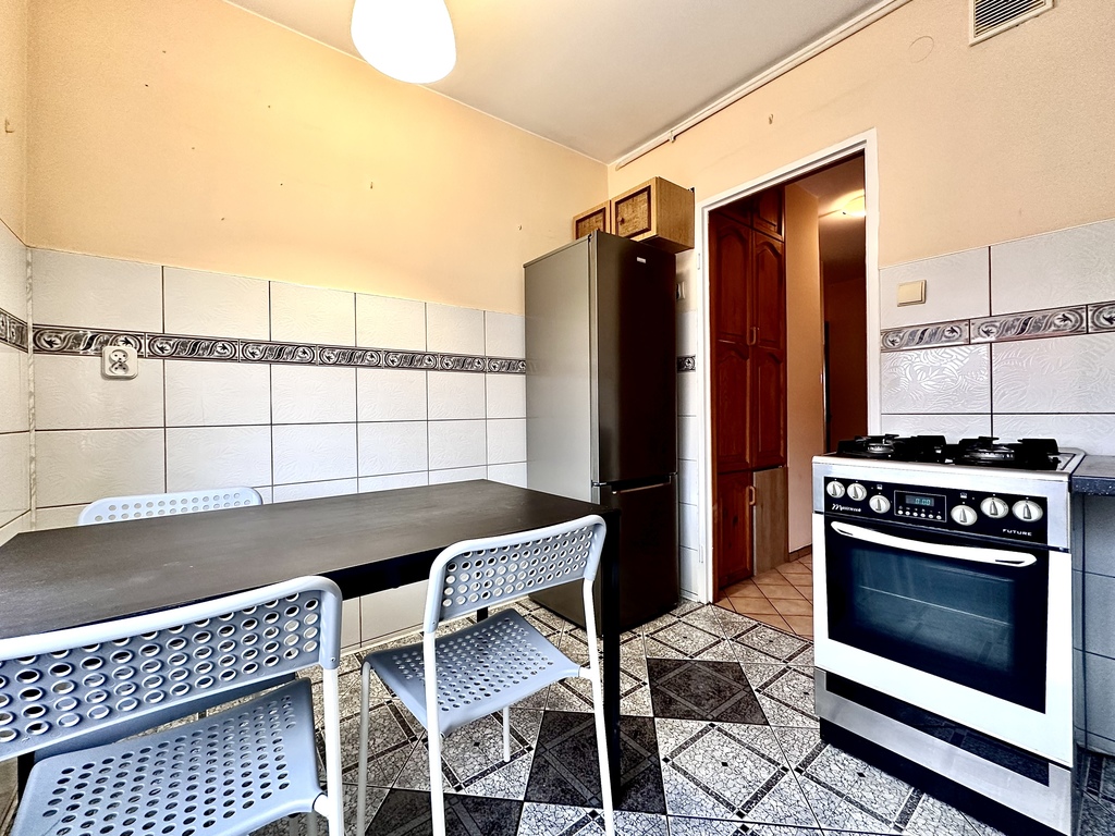 The kitchen is fitted with built-in furniture and equipped with the most essential appliances (a refrigerator with a freezer, a gas stove with an oven, and a table with chairs). The living room has a comfortable sofa bed, a TV, and a selection of furniture. The living room opens onto a balcony overlooking the central, green part of the estate.