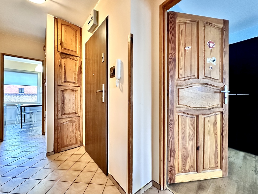 The bedroom has a double bed with a mattress, a spacious wardrobe, and a chest of drawers. The bathroom has a shower. The hallway has a built-in wardrobe and a coat rack.