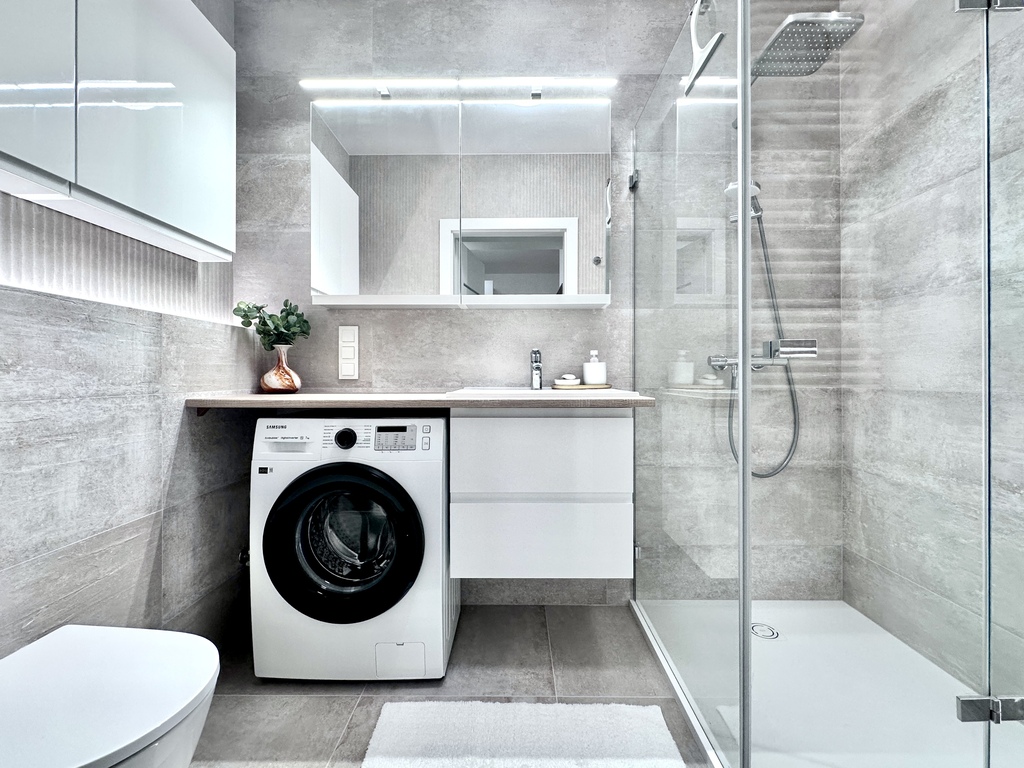 Bathroom with shower. In the hallway, there's a spacious wardrobe.
