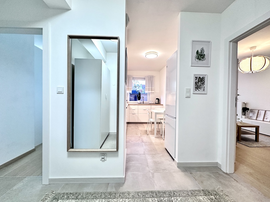 The fitted kitchen is equipped with high-quality appliances (refrigerator, oven, hob, hood, dishwasher) and a dining table with chairs. The living room features a comfortable sofa, a spacious wardrobe, and a coffee table. The living room opens onto a balcony.