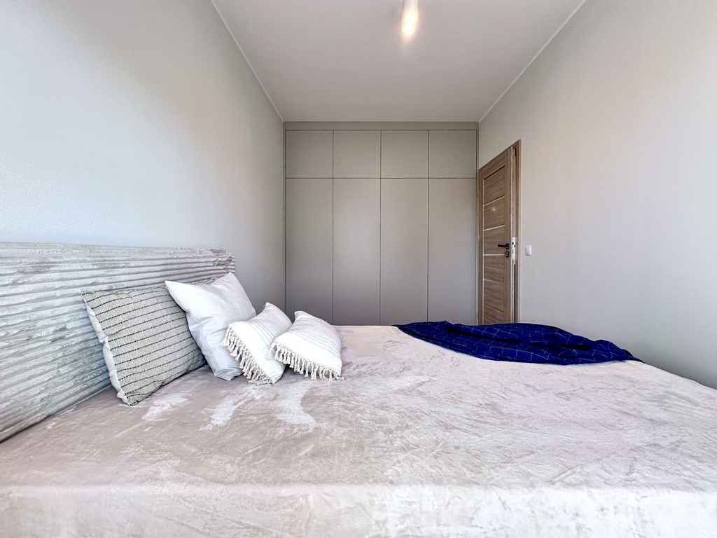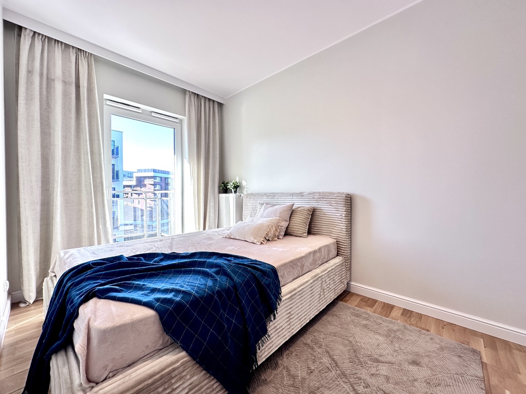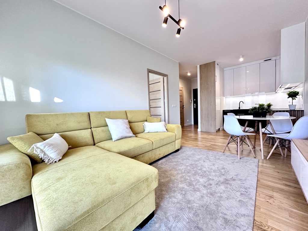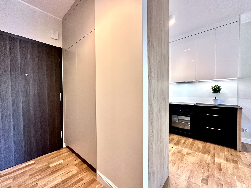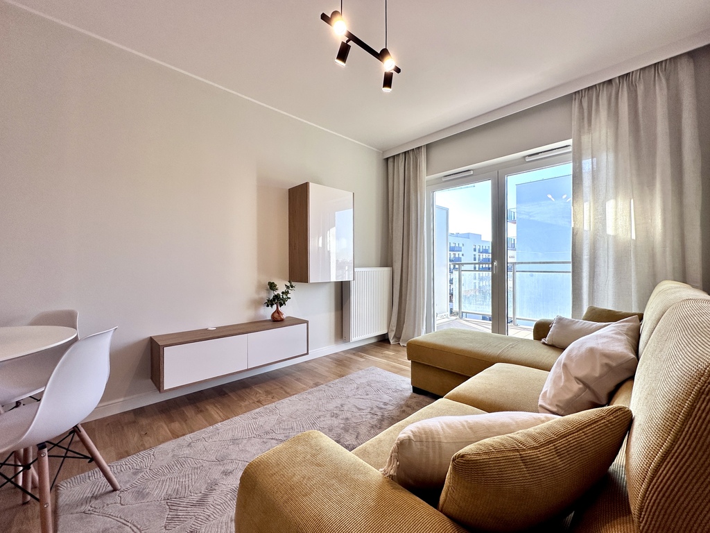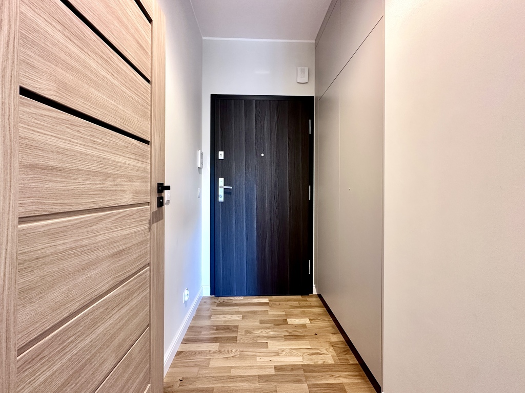 Tenants have access to a modern kitchen with built-in units, equipped with the most essential appliances (fridge/freezer, hob, oven, dishwasher). The living area features a comfortable sofa bed, a TV stand, and a table with chairs. The living room opens to a balcony overlooking the central part of the estate and the park. The bedroom features a spacious built-in wardrobe and a double bed with a mattress. The bathroom has a shower. The hallway features a spacious built-in wardrobe. The entire property is finished with high-quality materials and meticulous attention to detail. This property meets the requirements of even the most discerning tenants.