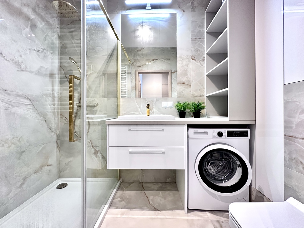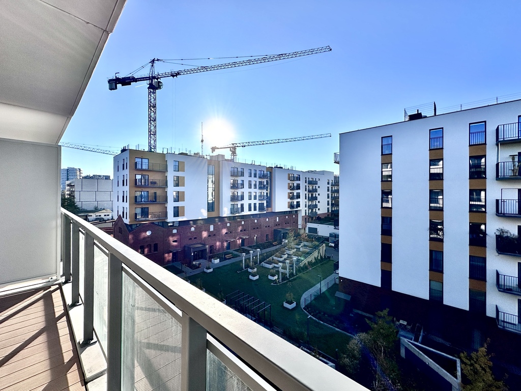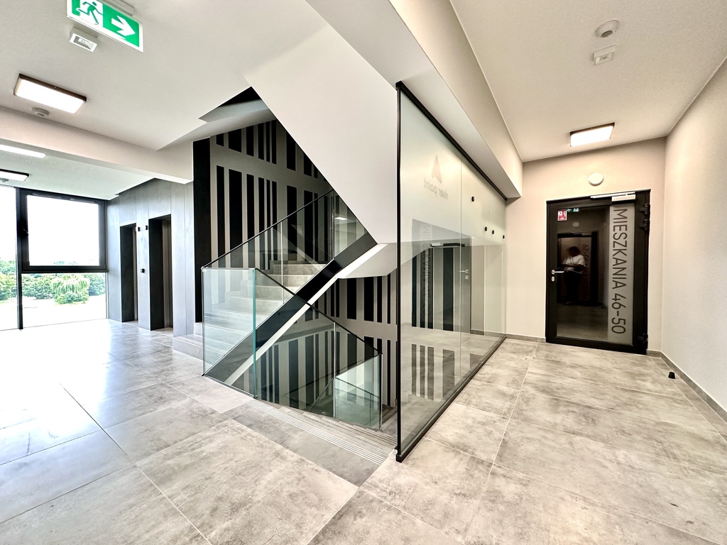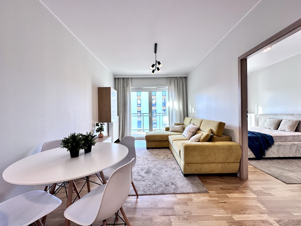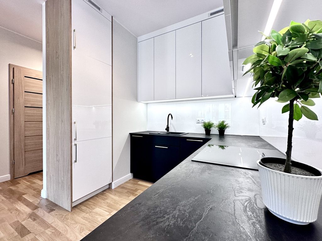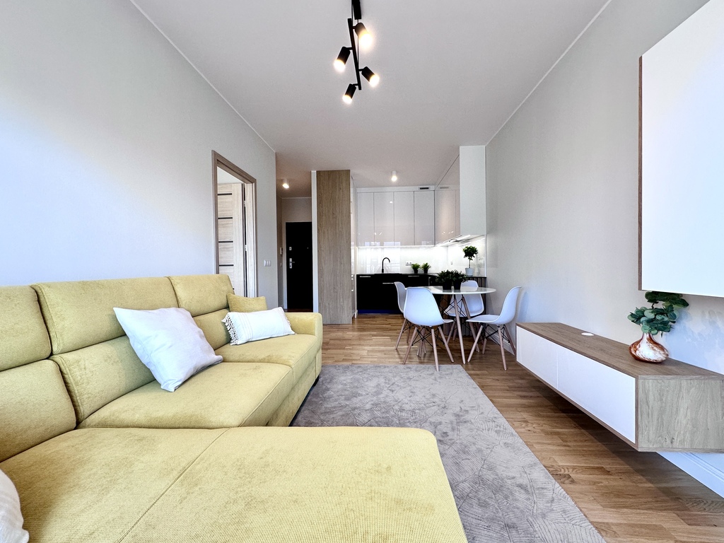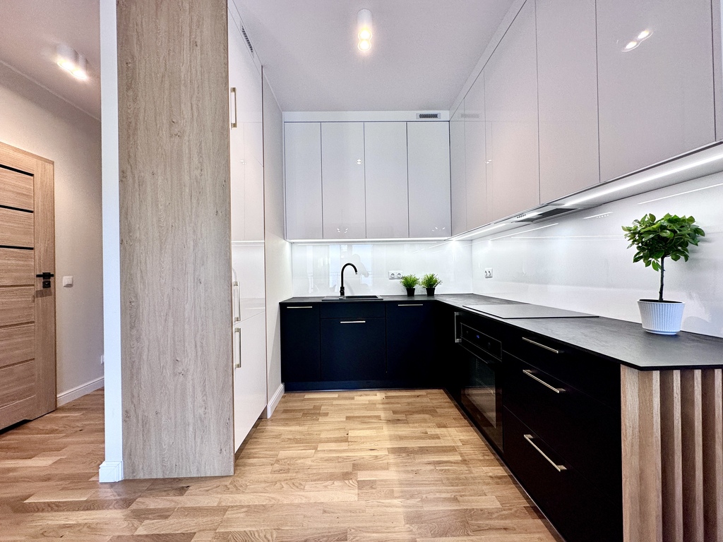 Tenants have access to a modern kitchen with built-in units, equipped with the most essential appliances (fridge/freezer, hob, oven, dishwasher). The living area features a comfortable sofa bed, a TV stand, and a table with chairs. The living room opens to a balcony overlooking the central part of the estate and the park. The bedroom features a spacious built-in wardrobe and a double bed with a mattress. The bathroom has a shower. The hallway features a spacious built-in wardrobe. The entire property is finished with high-quality materials and meticulous attention to detail. This property meets the requirements of even the most discerning tenants.