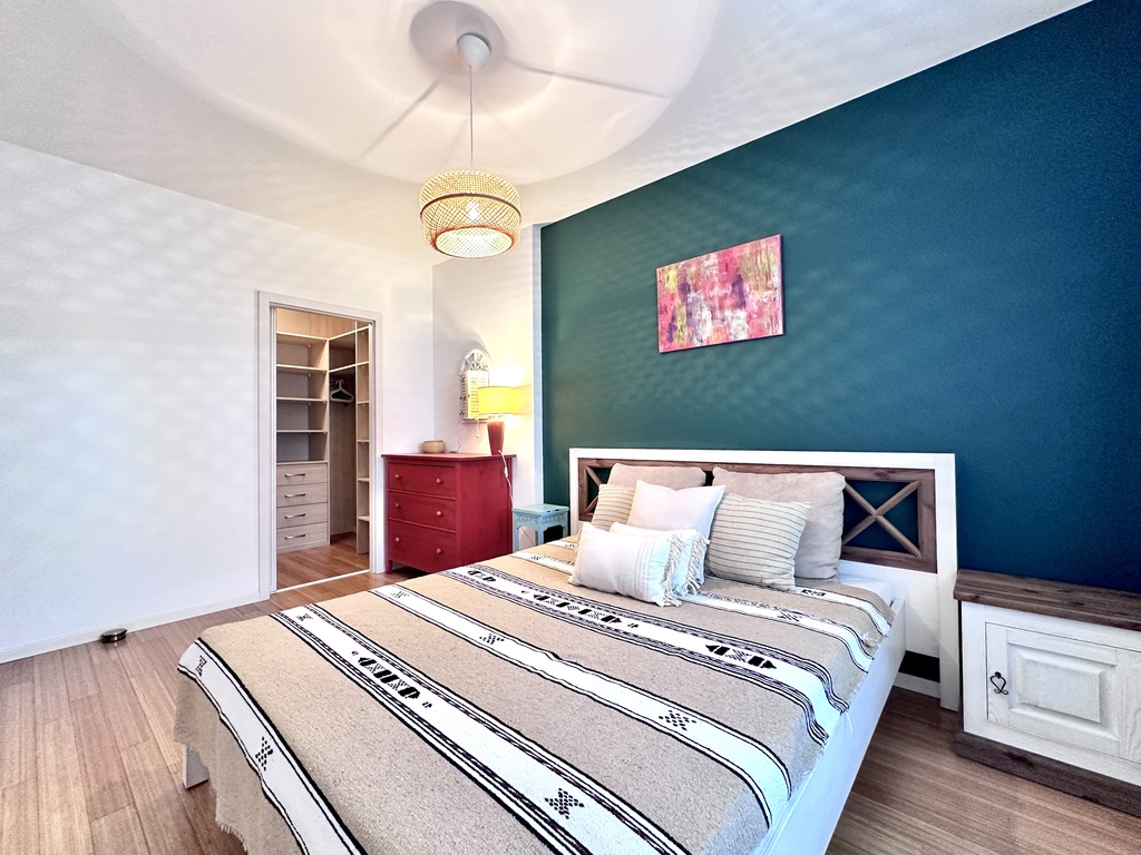 The bedroom has a double bed with a mattress and a separate wardrobe. The bathroom has a bathtub.