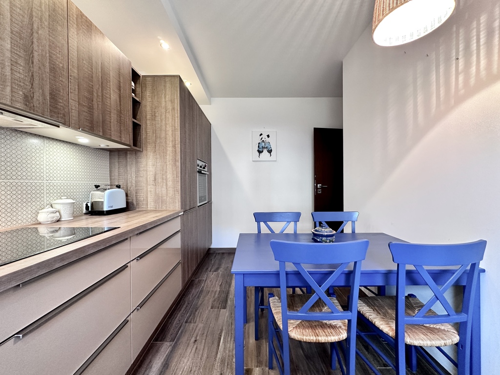 The kitchen is separate and equipped with modern appliances and a table and chairs. The living room features a comfortable sofa and a selection of furniture. The living room opens onto a balcony overlooking the greenery.