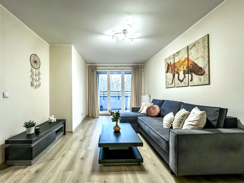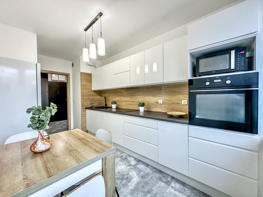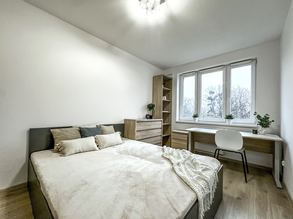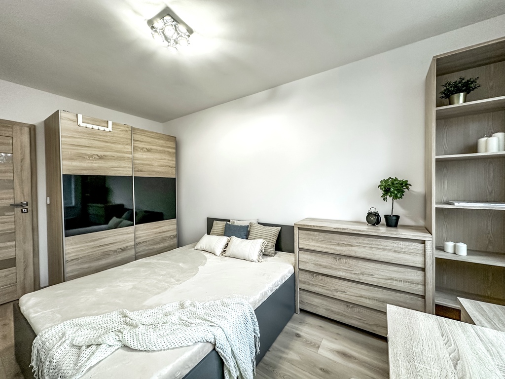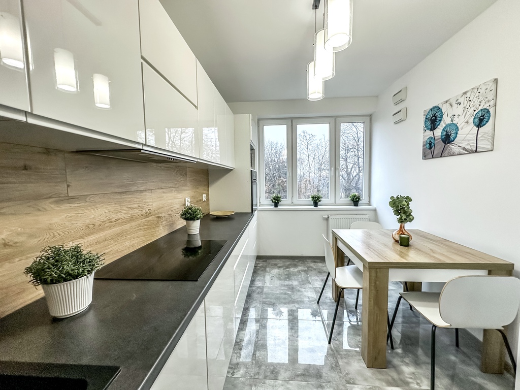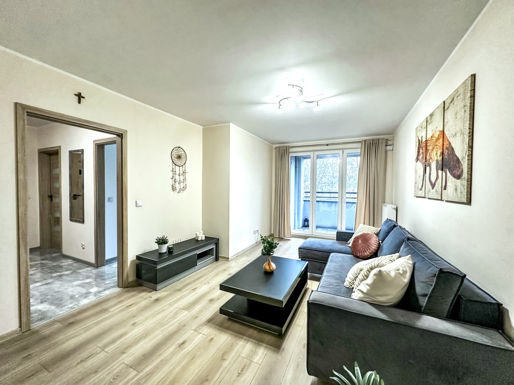 The apartment was designed with comfort in mind. The property comprises a living room furnished with a sofa bed, coffee table, TV stand, and chest of drawers. The kitchen is equipped with high-quality appliances: oven, induction hob, extractor hood, refrigerator with freezer, microwave, and dishwasher. The dining area features a table with three chairs. The bedroom is furnished with a comfortable double bed, a spacious wardrobe, a desk, a chest of drawers, a shelf, and a cabinet. The hallway features another spacious wardrobe and a mirror. The bathroom has a bathtub with a shower function. Access to the balcony with a screened-in screen is available from the living room. The building has an elevator.