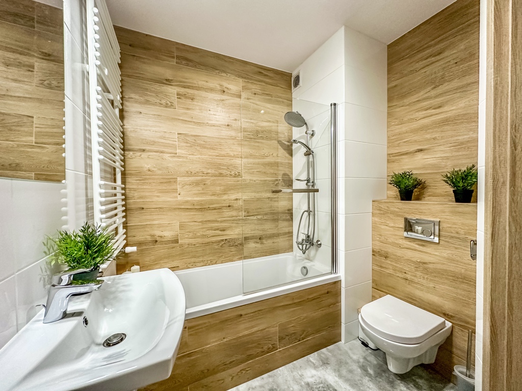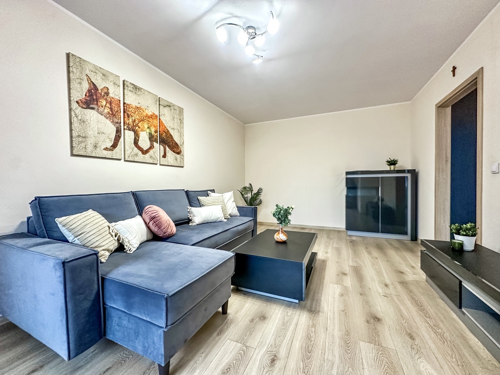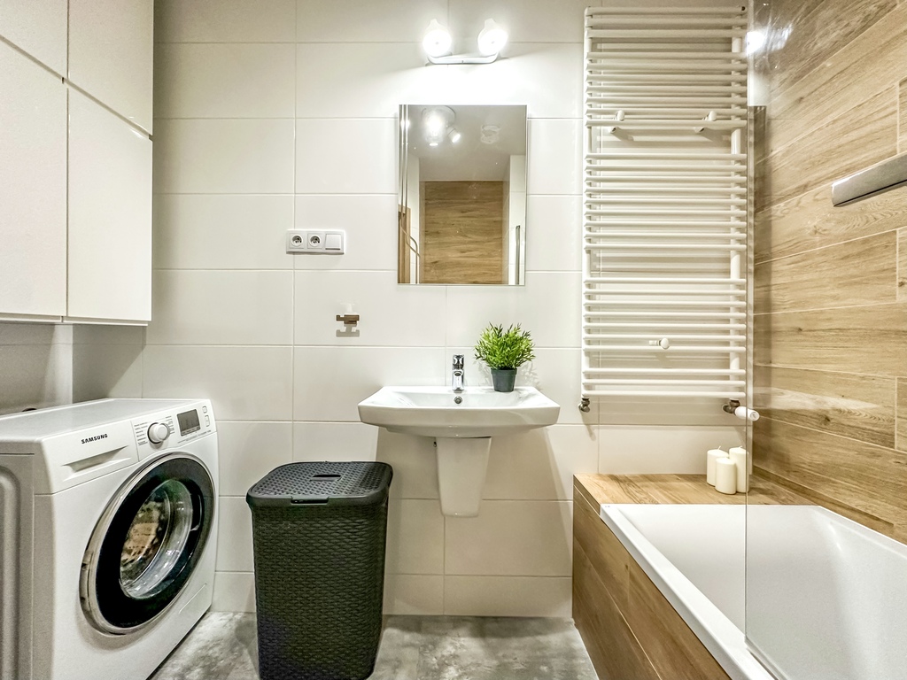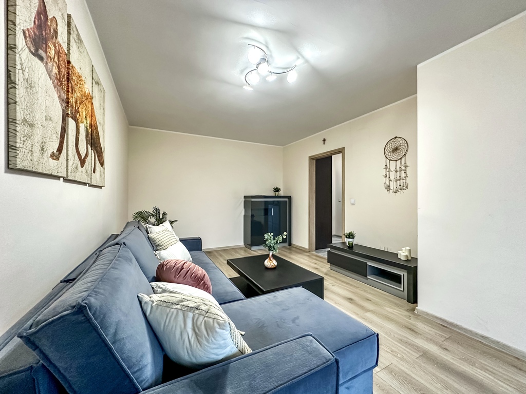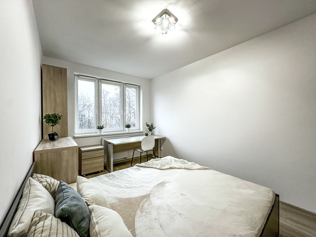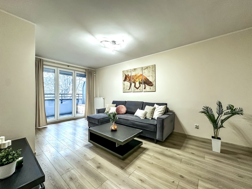 The apartment was designed with comfort in mind. The property comprises a living room furnished with a sofa bed, coffee table, TV stand, and chest of drawers. The kitchen is equipped with high-quality appliances: oven, induction hob, extractor hood, refrigerator with freezer, microwave, and dishwasher. The dining area features a table with three chairs. The bedroom is furnished with a comfortable double bed, a spacious wardrobe, a desk, a chest of drawers, a shelf, and a cabinet. The hallway features another spacious wardrobe and a mirror. The bathroom has a bathtub with a shower function. Access to the balcony with a screened-in screen is available from the living room. The building has an elevator.
