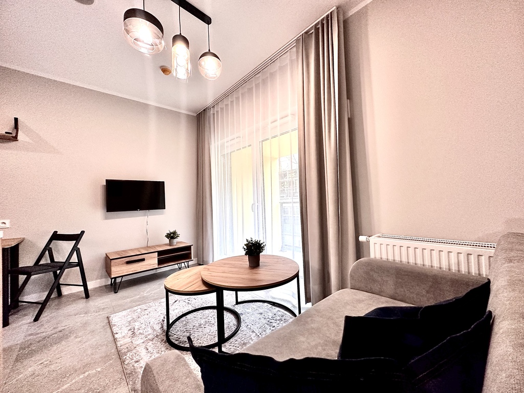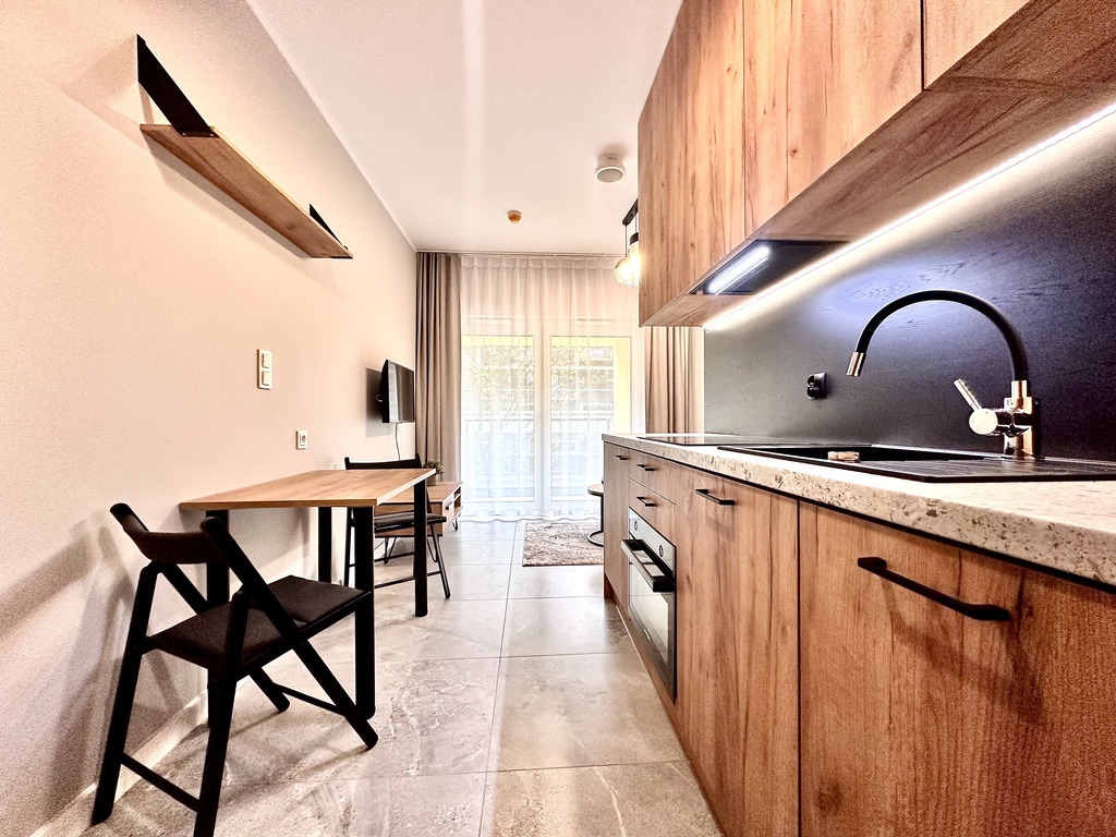 Tenants have access to a kitchenette with built-in furniture, equipped with the most essential appliances (fridge/freezer, hob, oven, dishwasher, microwave, washing machine) and a table with chairs. The living area features a comfortable sofa bed, coffee table, and TV. A separate sleeping area is equipped with a double bed with a mattress. The bathroom has a shower. The hallway features spacious built-in wardrobes.