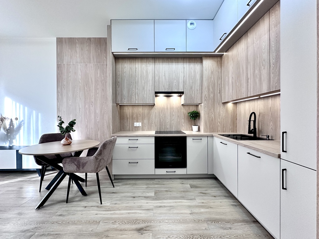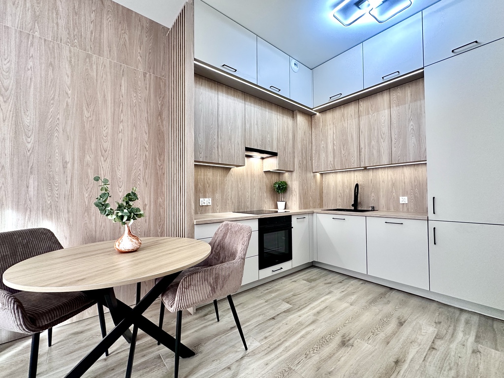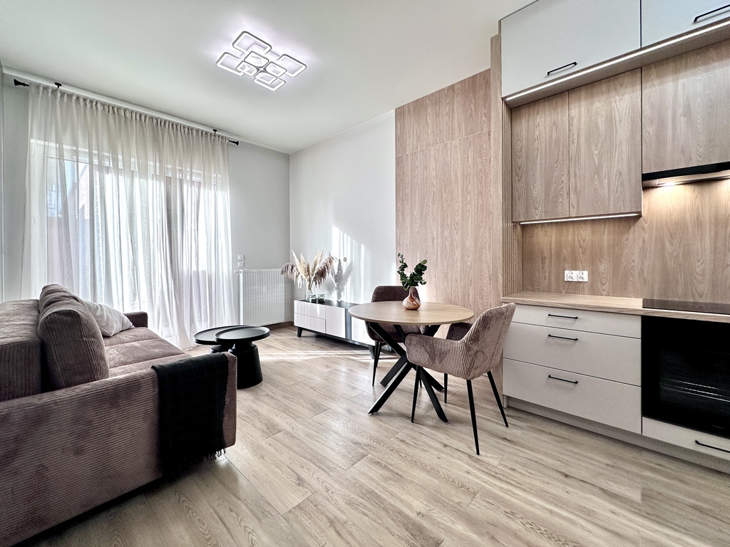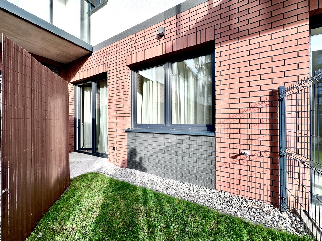 The kitchenette is equipped with the most essential appliances (refrigerator, dishwasher, induction cooktop, oven) and a table with chairs. The living area features a comfortable sofa, coffee table, and TV stand. The living room opens to the terrace and garden. The bedroom features a spacious built-in wardrobe and a double bed with a mattress. The bathroom is finished with the highest quality materials.