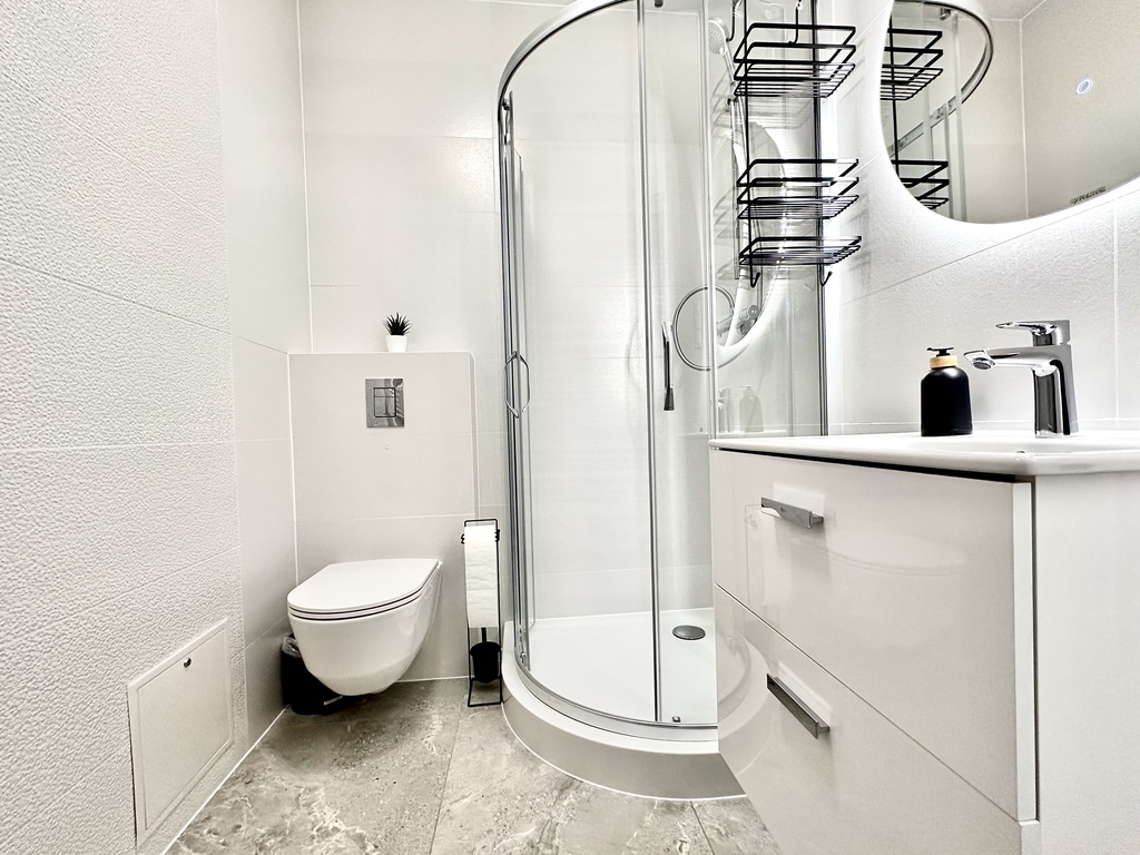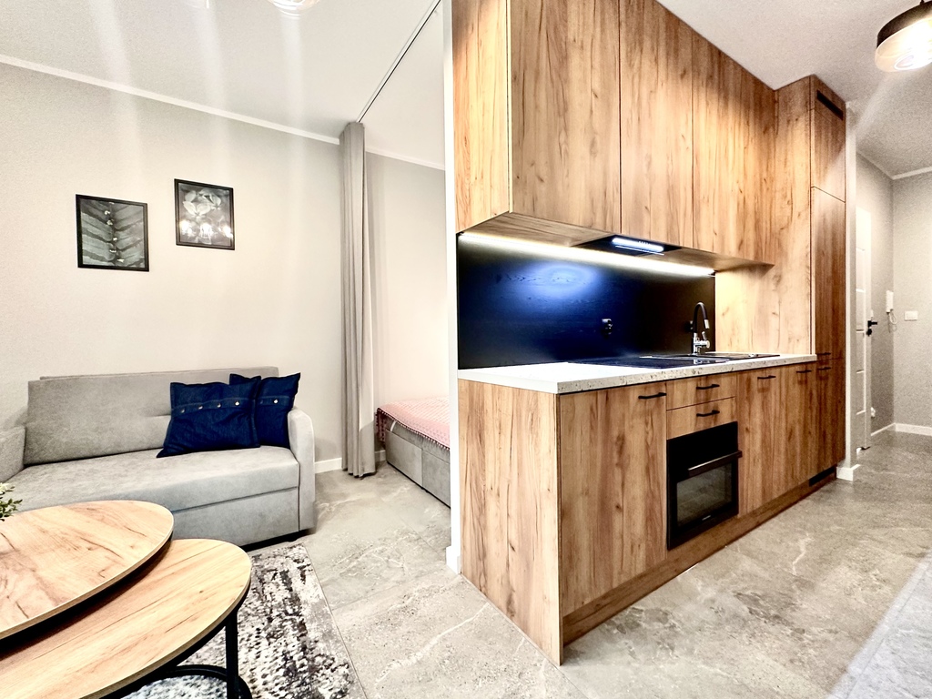 Tenants have access to a kitchenette with built-in furniture, equipped with the most essential appliances (fridge/freezer, hob, oven, dishwasher, microwave, washing machine) and a table with chairs. The living area features a comfortable sofa bed, coffee table, and TV. A separate sleeping area is equipped with a double bed with a mattress. The bathroom has a shower. The hallway features spacious built-in wardrobes.