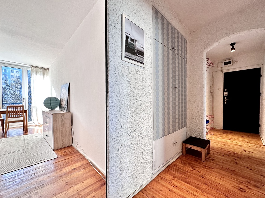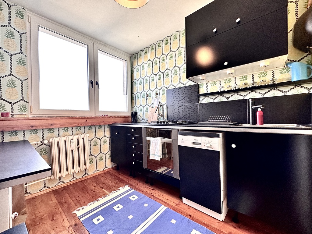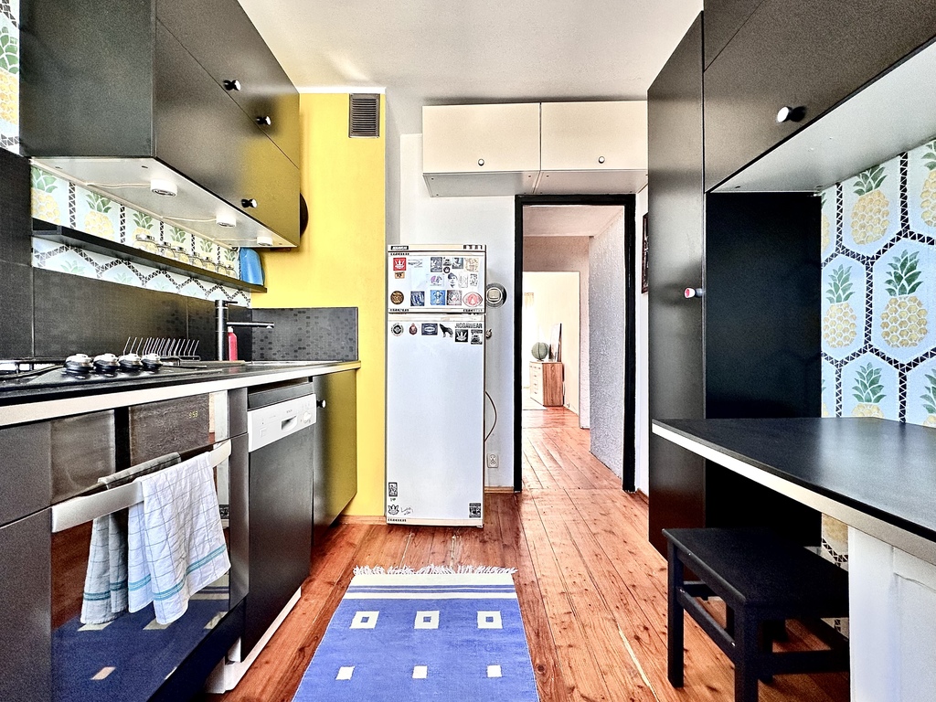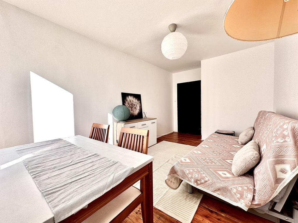 The kitchen is fitted with built-in units and equipped with all the essential appliances (fridge/freezer, hob, oven, dishwasher). The living room features a comfortable sofa bed, a table with chairs, and a chest of drawers. One bedroom has a double bed that can be separated into two singles and a set of furniture. The second bedroom is equipped with a desk and wardrobe. The hallway features a coat rack and a built-in wardrobe. The bathroom has a shower and a separate toilet.