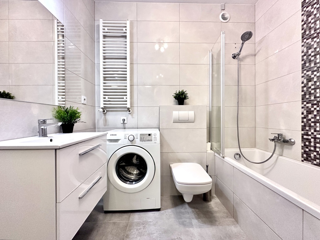 - The bathroom has a bathtub and a shower, bathroom furniture, and a washing machine.