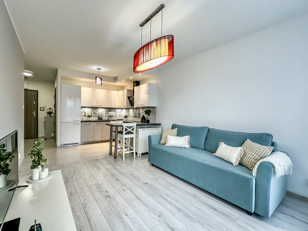 This bright and modern apartment is located in a gated community in a building built in 2015. Finished to a high standard, it's ideal for those who value comfort and functionality. The kitchenette is fully equipped, and the living area is spacious and well-lit. The apartment boasts a modern style and a well-thought-out layout.