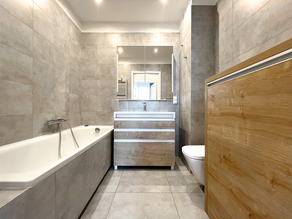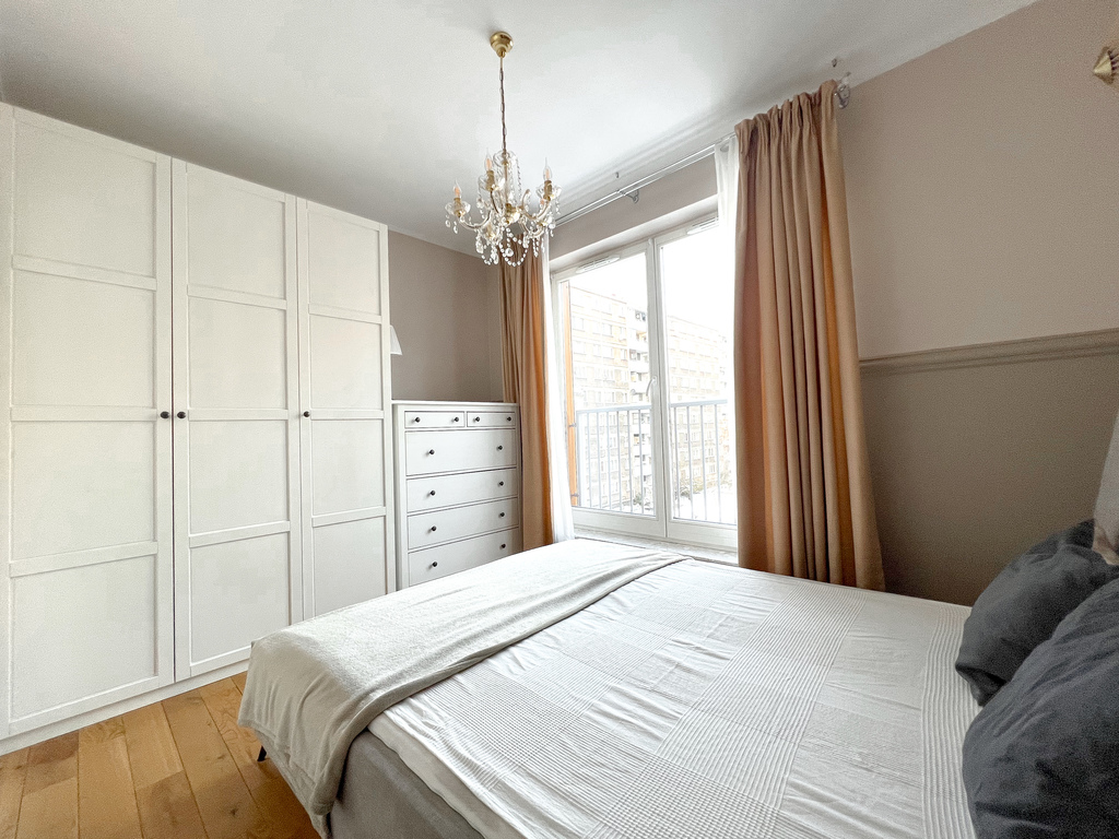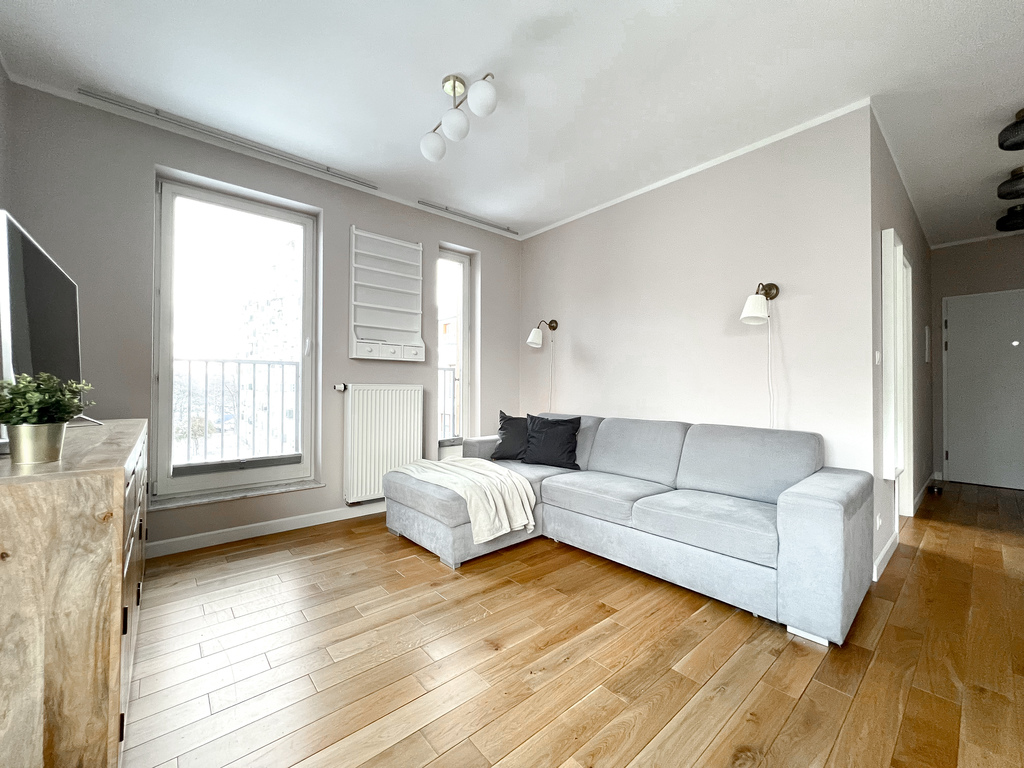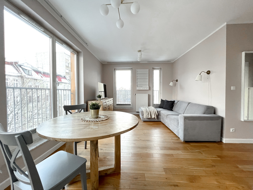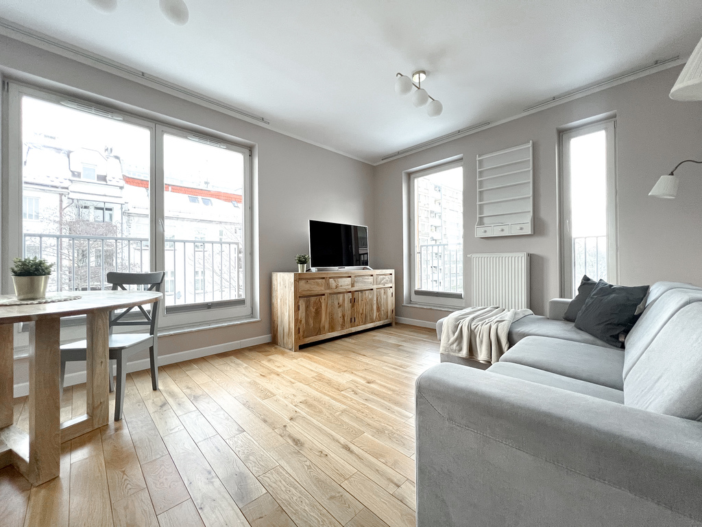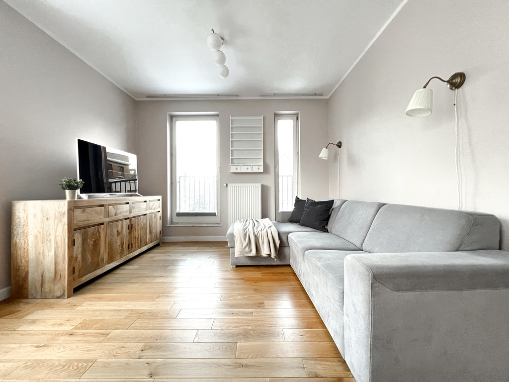The apartment has been functionally furnished with attention to everyday comfort and convenience. The spacious living room is equipped with a comfortable sofa, a TV, a chest of drawers, and a wall-mounted shelf. The dining area features a table with two chairs, creating an ideal place for shared meals. The kitchenette boasts modern furniture and a full range of appliances: an oven, induction hob, extractor hood, refrigerator with freezer, and dishwasher, ensuring everyday convenience. The bedroom features a comfortable double bed, a spacious wardrobe, and an additional sofa. The bathroom is equipped with a comfortable bathtub, a cabinet with a sink, a washing machine, and a built-in toilet. Large windows provide ample natural light, emphasizing its spacious and inviting character.