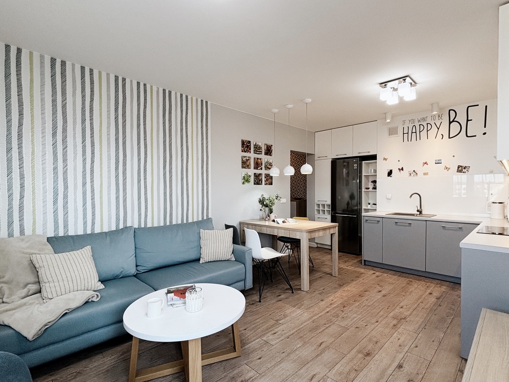 This spacious apartment comprises a living room furnished with a sofa, coffee table, comfortable armchair, TV stand, and hanging shelves. The kitchenette boasts modern built-in furniture and appliances: an oven, hob, extractor hood, refrigerator with freezer, dishwasher, and microwave. The dining area features a table with four chairs. The bedroom offers a comfortable double bed, two bedside tables, and a spacious chest of drawers. An additional room is equipped with a desk with storage units – perfect for work or study. A separate dressing room allows for better organization and convenient storage. The bathroom with a bathtub and shower has been equipped with a washer-dryer. The hallway features a spacious wardrobe, chest of drawers, shoe cabinet, and mirror. A highlight of the apartment is the balcony, accessible from the living room, providing additional space for relaxation.
