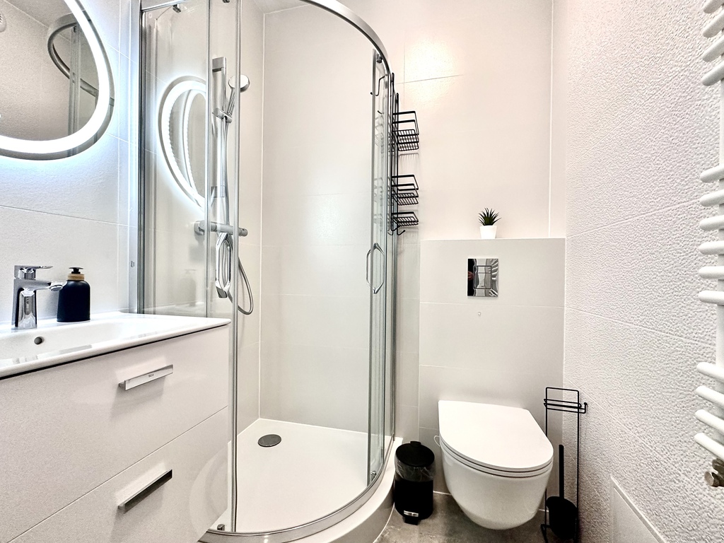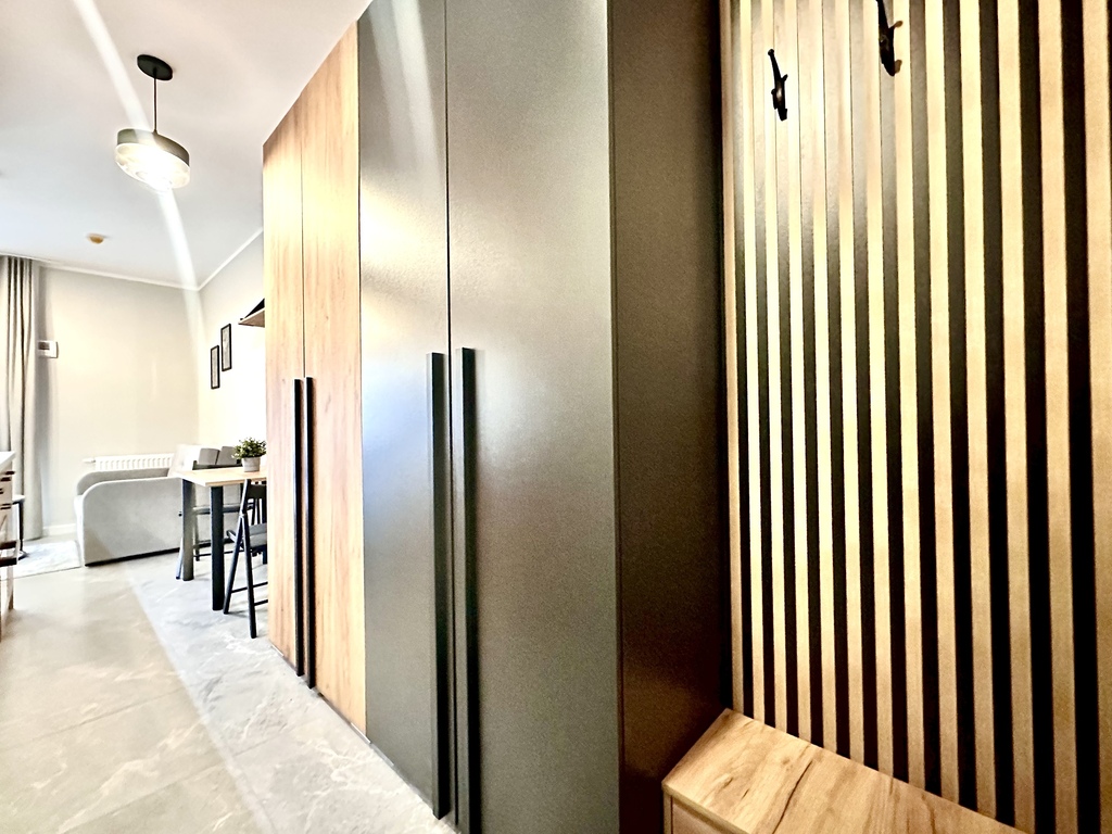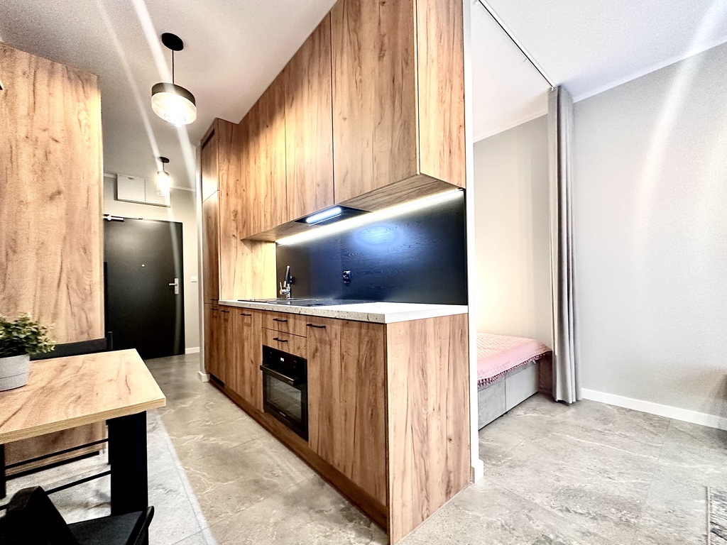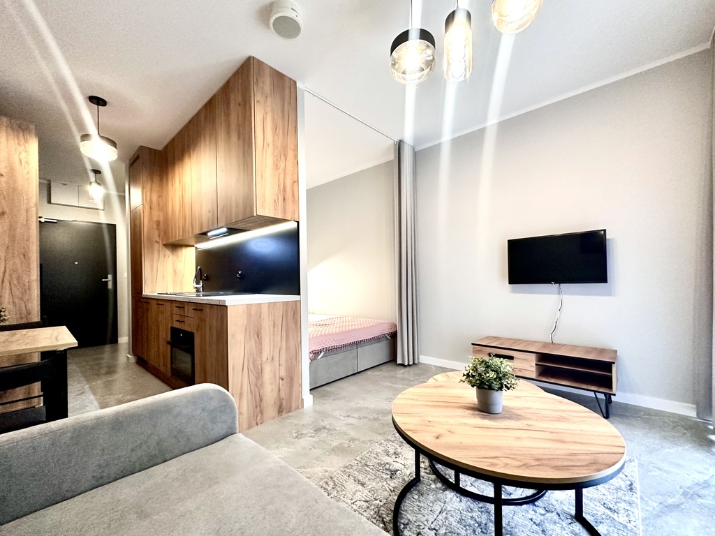 Tenants have access to a kitchenette with built-in furniture, equipped with the most essential appliances (fridge/freezer, hob, oven, dishwasher, microwave, washing machine) and a table with chairs. The living area features a comfortable sofa bed, coffee table, and TV. A separate sleeping area is equipped with a double bed with a mattress. The bathroom has a shower. The hallway features spacious built-in wardrobes.