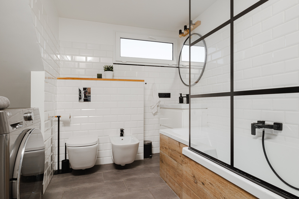 - spacious bathroom with a window,