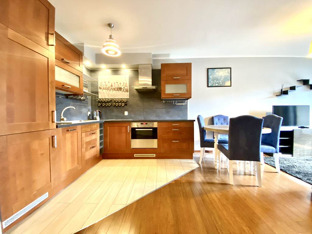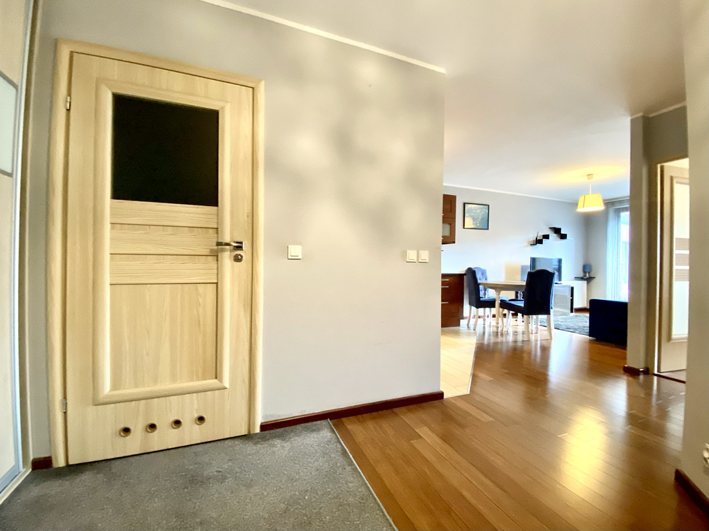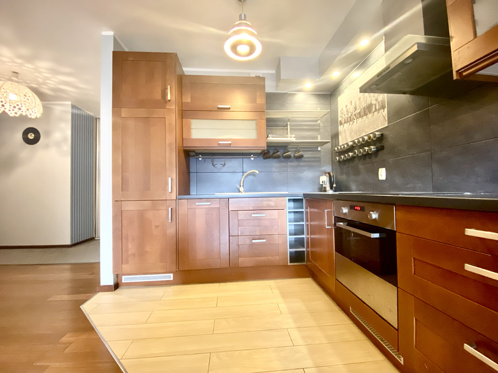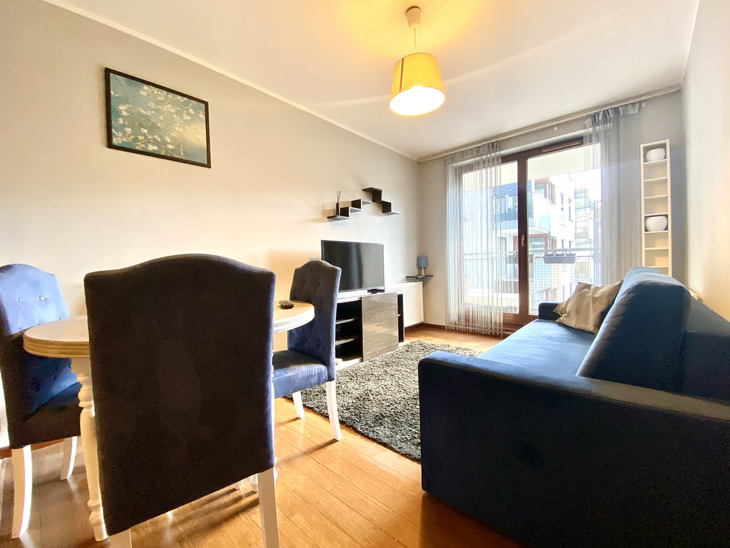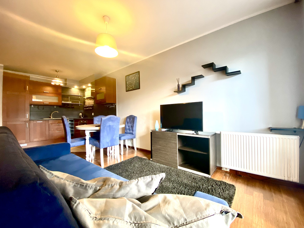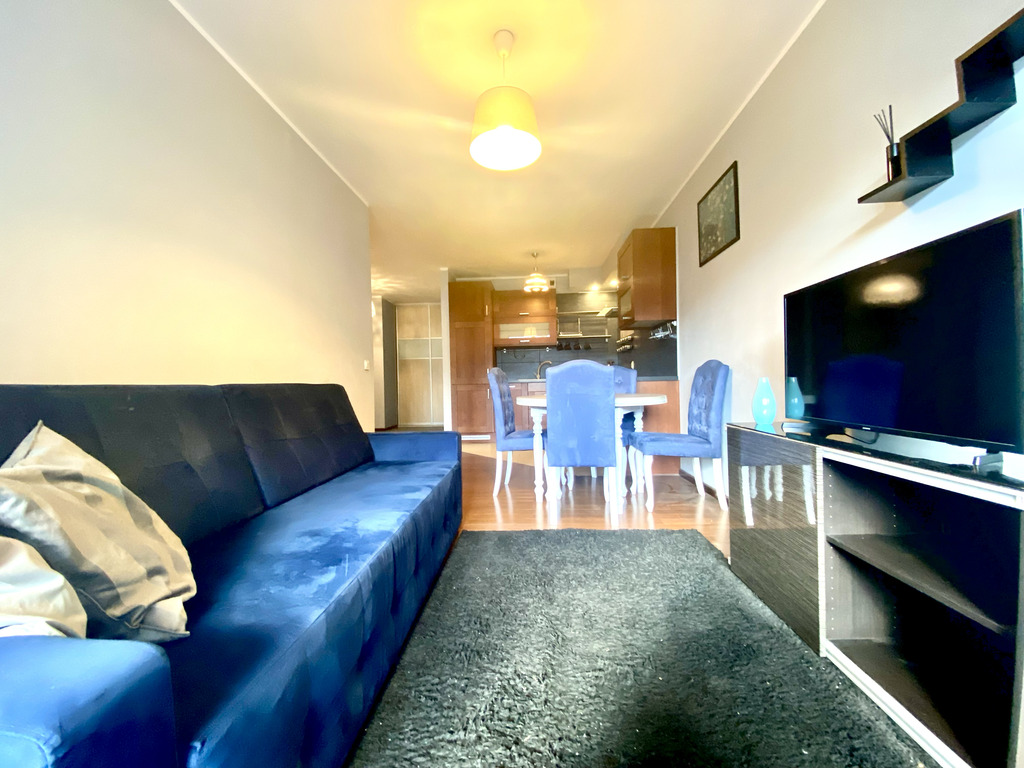 A stylish and spacious two-room apartment is available for rent immediately. The tastefully decorated living room features a corner sofa bed, a dining table with chairs, and a TV. The kitchen is fully equipped with high-quality appliances (fridge with freezer, oven, hood, electric hob, kettle, dishwasher) and basic kitchen appliances. The bedroom features a comfortable double bed, a chest of drawers, a mirror, and built-in shelving (not shown in the photos). The bathroom features a shower and offers ample storage space. The hallway features a spacious built-in wardrobe.