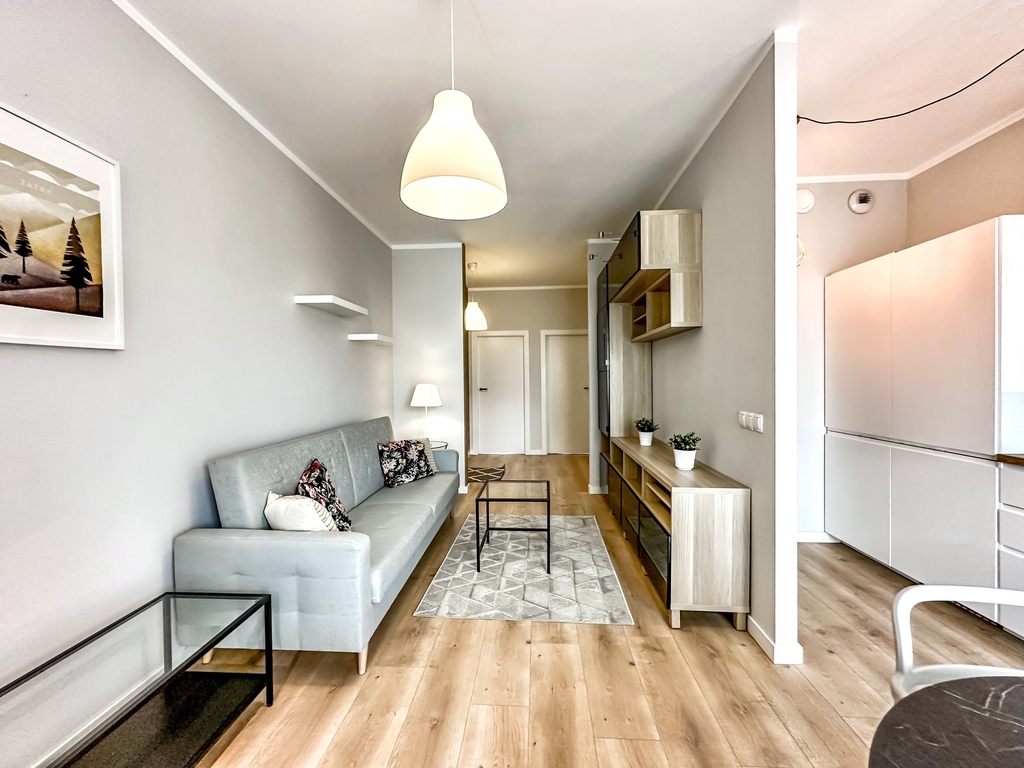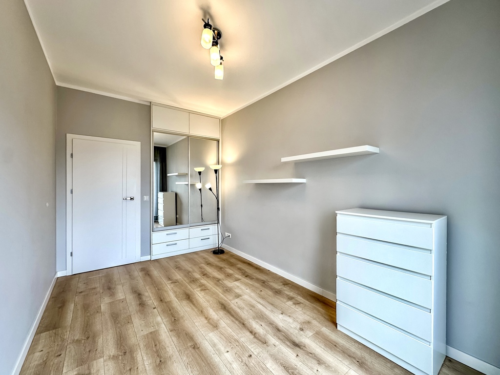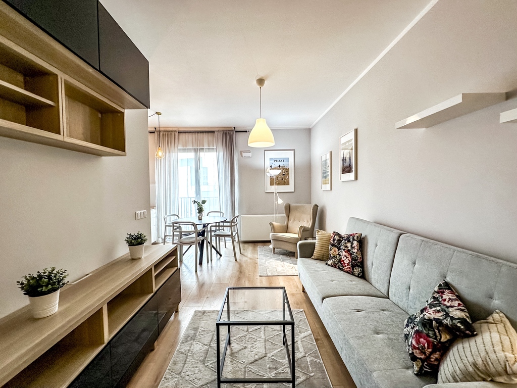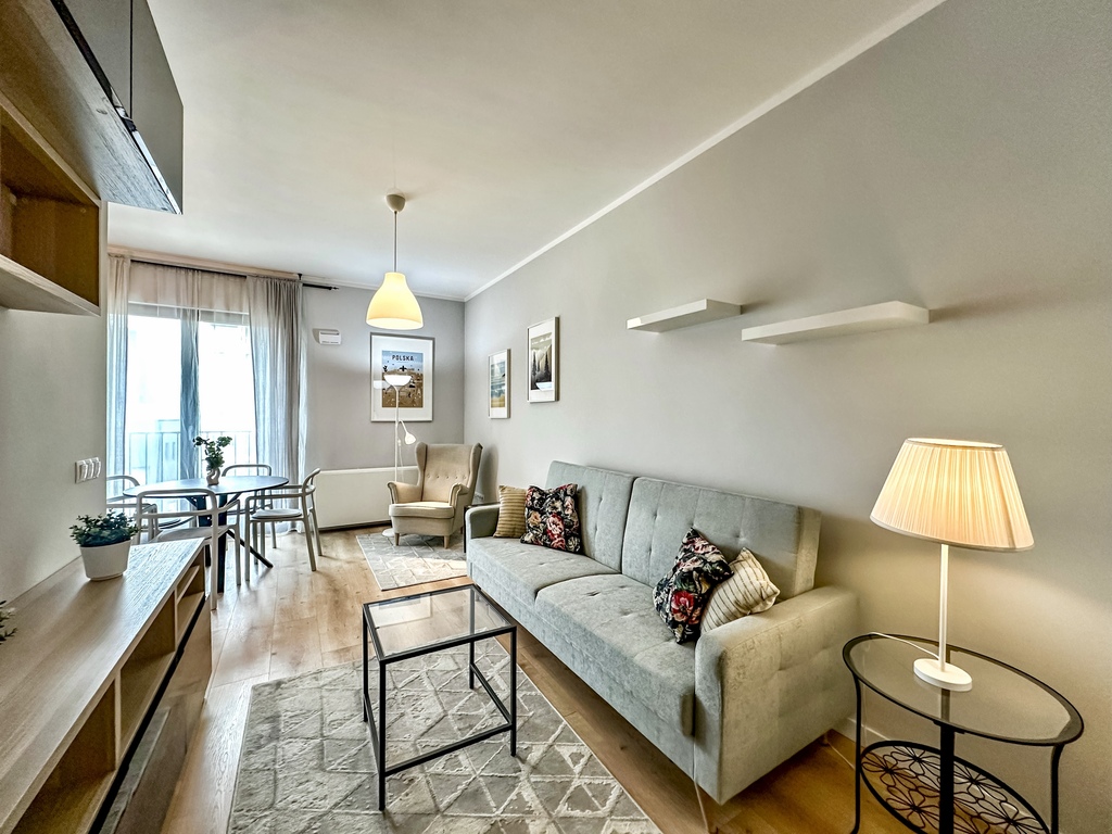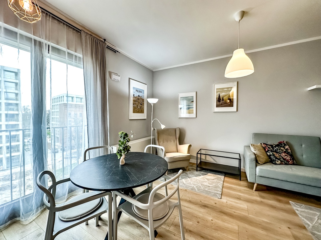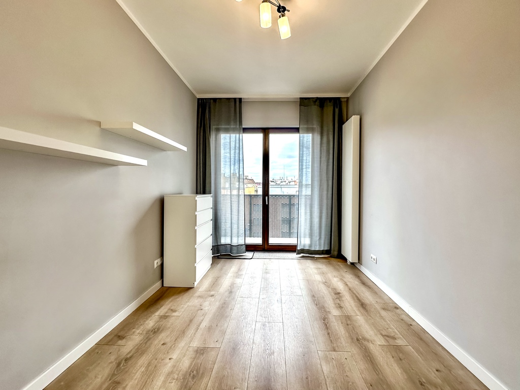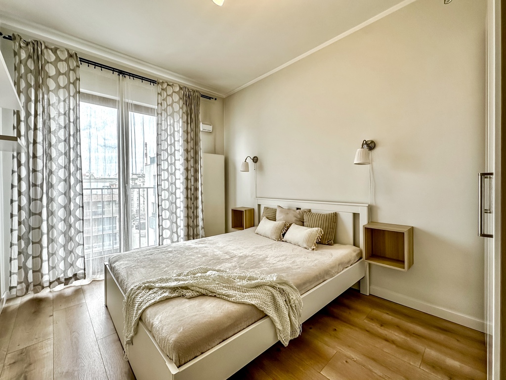 A beautiful apartment in the prestigious CENTREVILLE development, designed with meticulous attention to detail. The living room, combined with a kitchenette, is the perfect place to relax together. The kitchen is equipped with modern appliances. The window overlooks Drobnera Street. Thanks to modern triple glazing, the apartment is very quiet. The bedroom is equipped with a comfortable, large bed, a wardrobe, and a chest of drawers. The room next to the bedroom is equipped with only a spacious walk-in closet, allowing us to customize the rest of the furniture to suit the future tenants and their preferences. This room also opens onto a balcony of approximately 7 square meters. Both rooms face Śrutowa Street (the estate's patio). The apartment includes a bathroom with a shower, essential fixtures, and a washing machine. The hallway also features a spacious walk-in closet for outerwear. The apartment is double-sided, making it very bright.