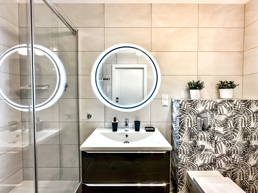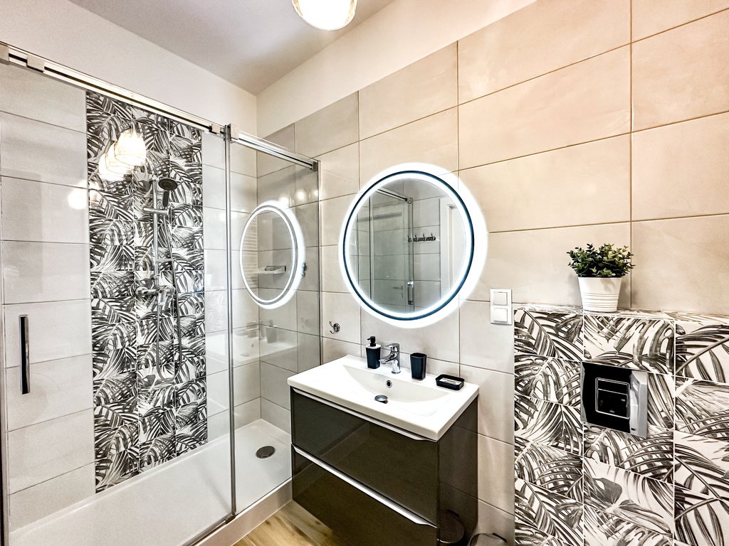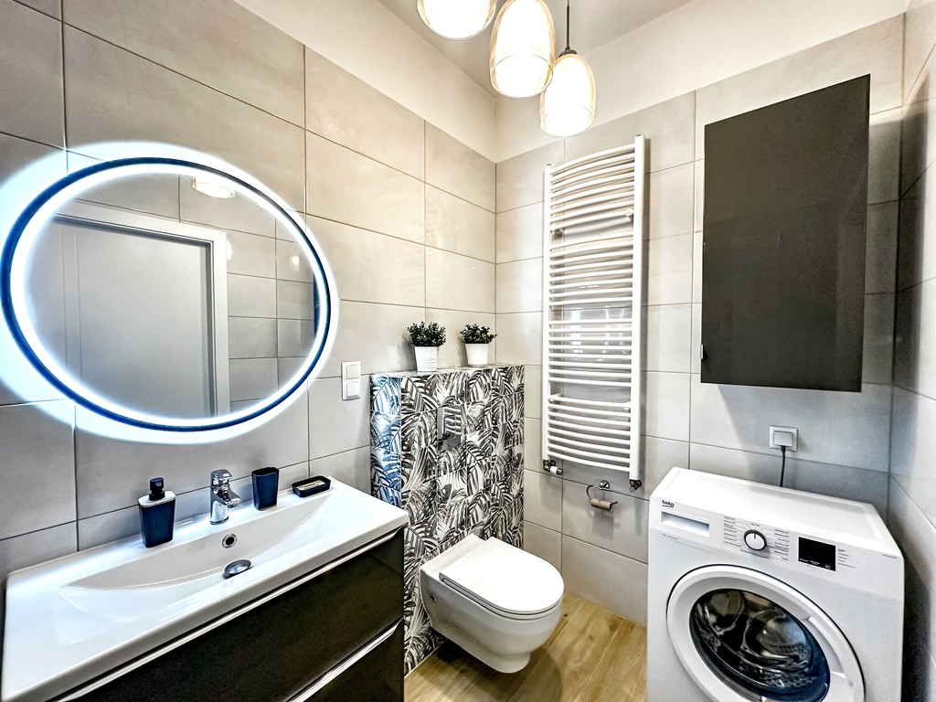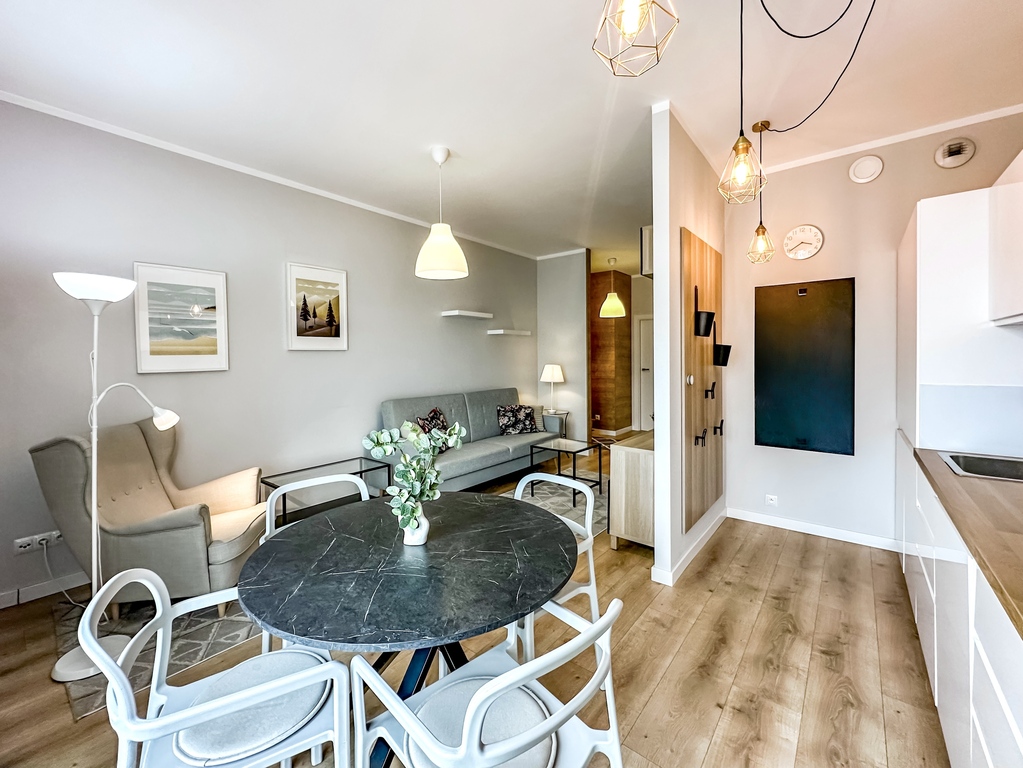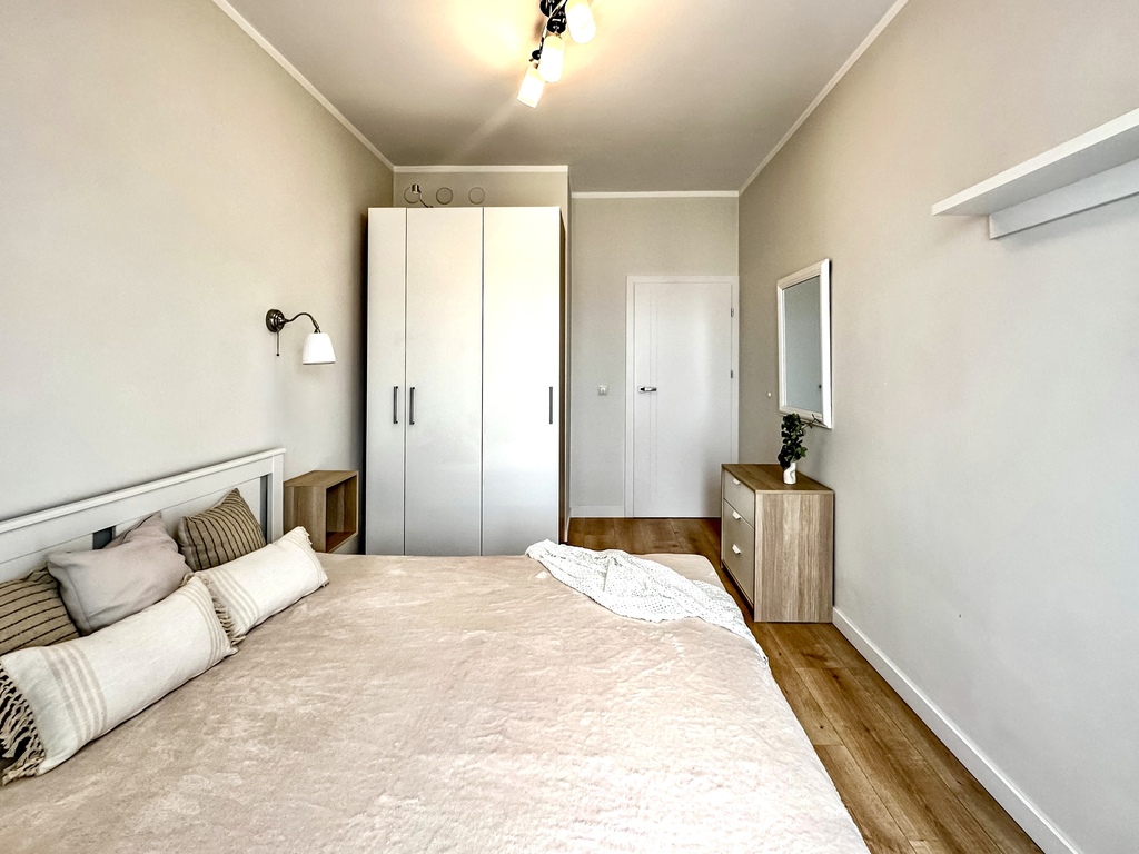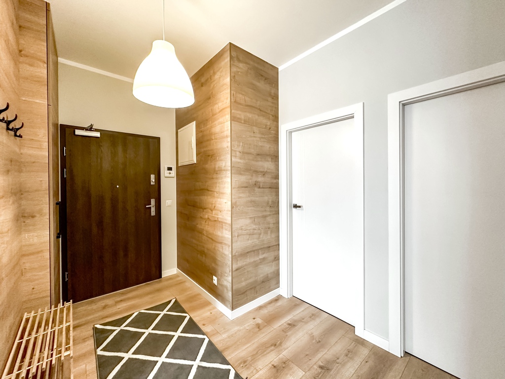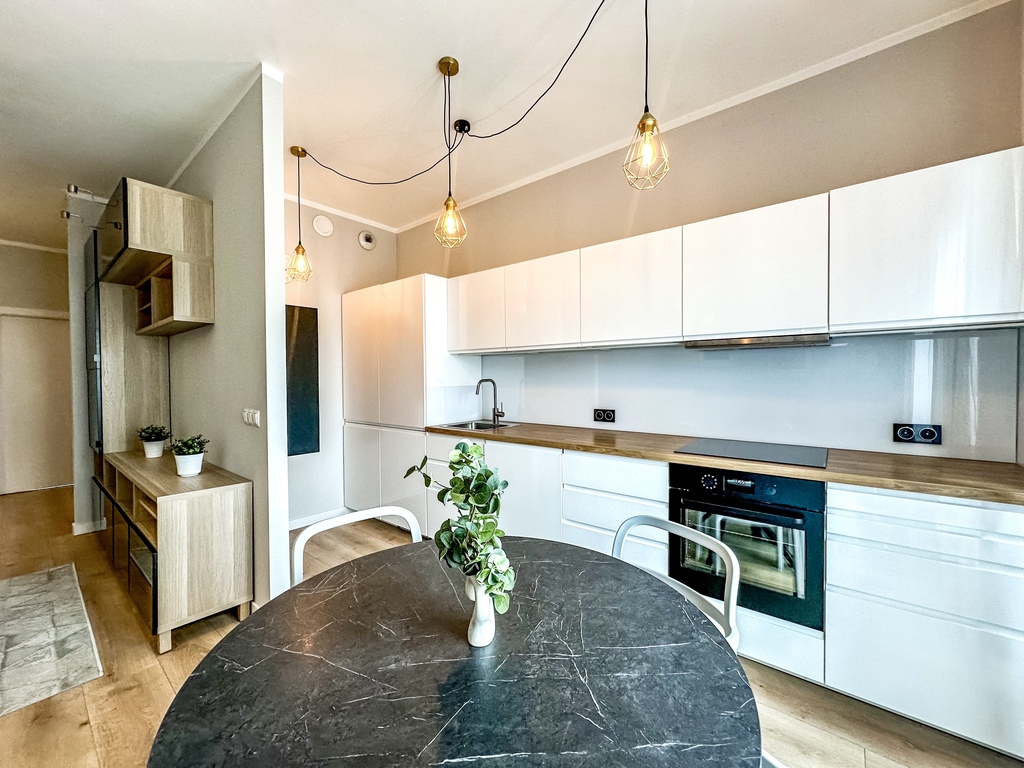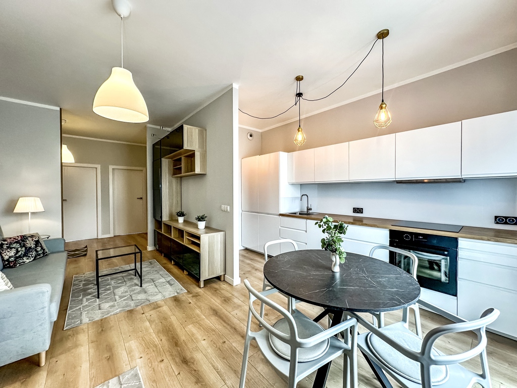 A beautiful apartment in the prestigious CENTREVILLE development, designed with meticulous attention to detail. The living room, combined with a kitchenette, is the perfect place to relax together. The kitchen is equipped with modern appliances. The window overlooks Drobnera Street. Thanks to modern triple glazing, the apartment is very quiet. The bedroom is equipped with a comfortable, large bed, a wardrobe, and a chest of drawers. The room next to the bedroom is equipped with only a spacious walk-in closet, allowing us to customize the rest of the furniture to suit the future tenants and their preferences. This room also opens onto a balcony of approximately 7 square meters. Both rooms face Śrutowa Street (the estate's patio). The apartment includes a bathroom with a shower, essential fixtures, and a washing machine. The hallway also features a spacious walk-in closet for outerwear. The apartment is double-sided, making it very bright.